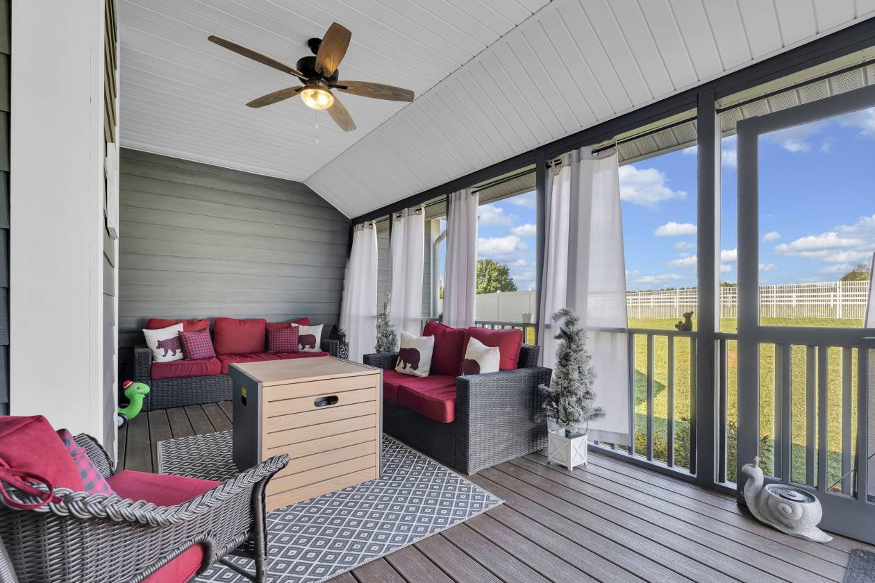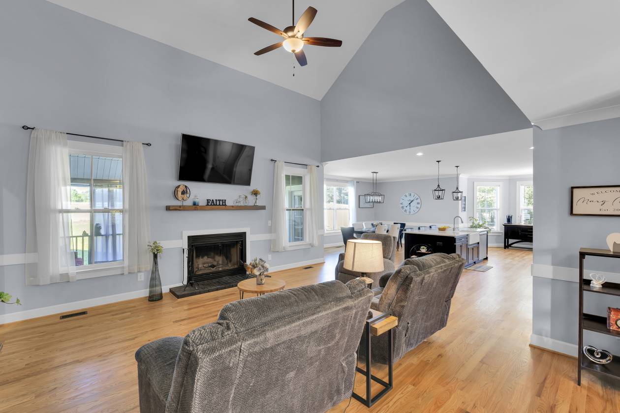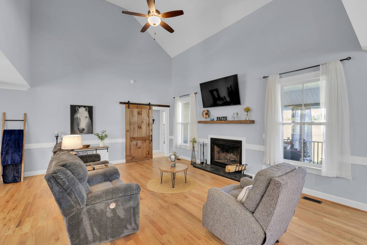 Welcome to Saddlehorn—an equestrian community where horse lovers enjoy 75+ acres of community pastures, a fully stocked fishing pond, and miles of riding and walking trails. Set on a generous 0.73-acre lot with pasture views, this modern farmhouse offers 2,800+ sq ft of thoughtfully designed living space and the equestrian lifestyle so many buyers search for: “horse property for sale,” “equestrian community with trails,” and “homes near pastures.” A sweeping 40-foot rocking-chair front porch sets a welcoming tone. Inside, cathedral ceilings, rich hardwood floors, and a striking black fireplace anchor the open-concept great room. Sliding barn doors add rustic sophistication. The chef’s kitchen features bold black shaker cabinetry, white quartz counters, a farmhouse sink, a large island with bar seating, and a sunny bay-window breakfast nook—perfect after an early morning trail walk. The main-level primary suite is a true retreat with vaulted ceilings, an oversized tiled shower with rainfall and wall heads, dual vanities, and a spacious walk-in closet. Two guest bedrooms share a stylish full bath. Need multi-generational flexibility? The newly finished upstairs offers a potential second primary/guest suite with a private bath—ideal for extended stays or a quiet office/media space. Out back, a white iron fence frames the private yard and opens to serene views of neighboring horse pastures. There’s room for a pool (preliminary plans available), and the vaulted, screened-in porch invites year-round indoor-outdoor living. A two-car garage, storage shed with riding mower, and low HOA fees complete the package. Why buyers love Saddlehorn: horse-friendly amenities, access to expansive community pastures, stocked pond, and miles of trails—without sacrificing modern luxury at home. If you’re searching for an equestrian property with pasture views, trails, and a refined farmhouse aesthetic, this is the one. Schedule your private tour today and experience Saddlehorn’s horse-centered lifestyle firsthand.