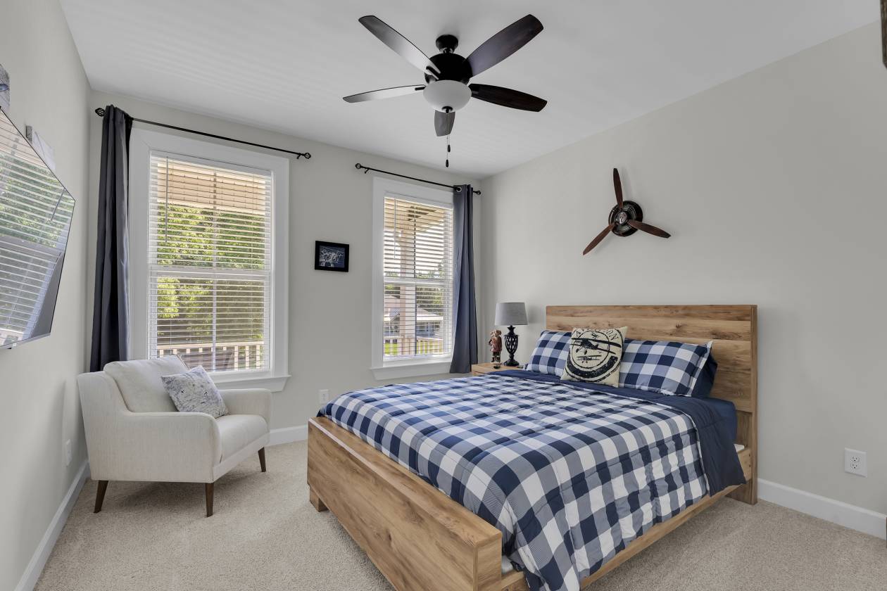 The main-level primary suite is a true retreat with vaulted ceilings, an oversized tiled shower with rainfall and wall heads, dual vanities, and a spacious walk-in closet. Two guest bedrooms share a stylish full bath. Need multi-generational flexibility? The newly finished upstairs offers a potential second primary/guest suite with a private bath—ideal for extended stays or a quiet office/media space.