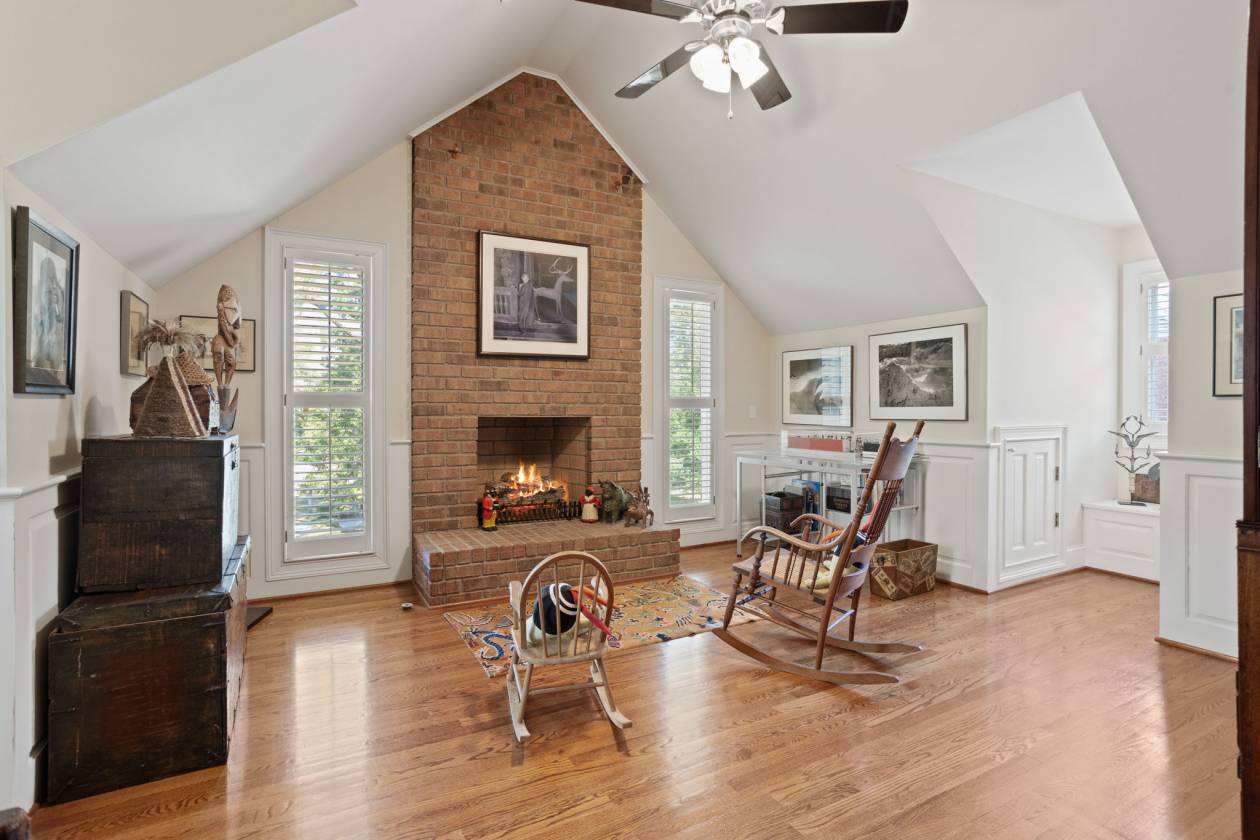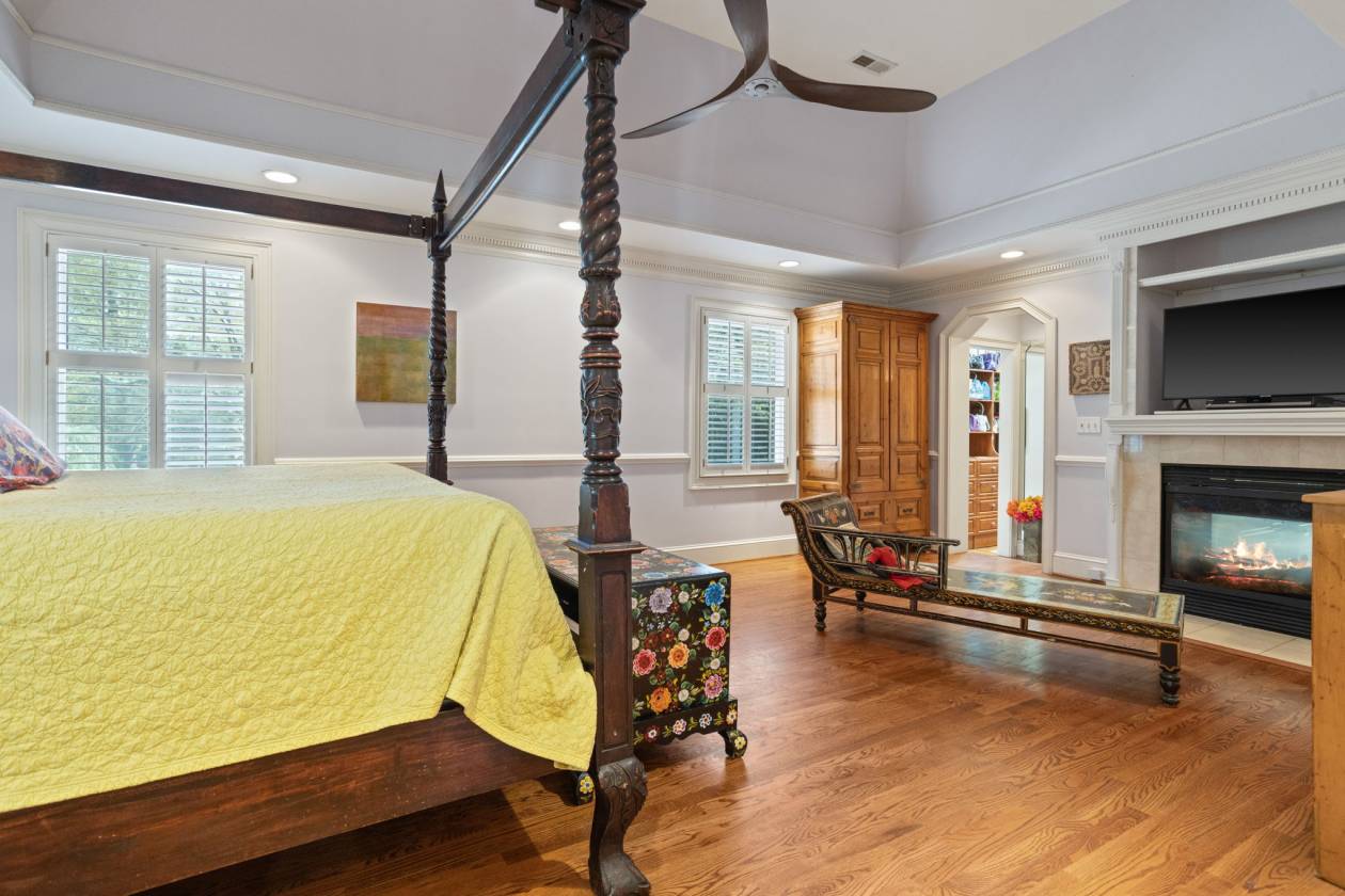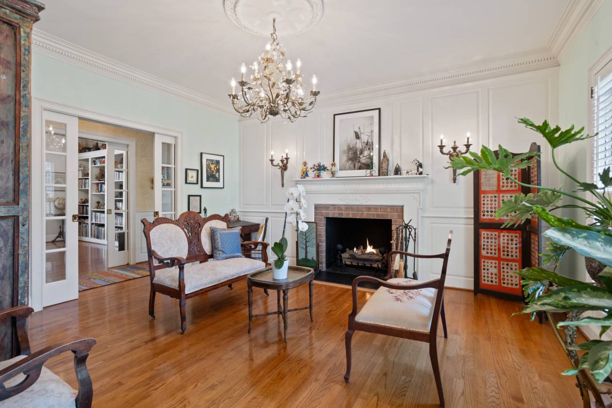 - High ceilings, hardwood floors, crown molding, plantation shutters, and five fireplaces