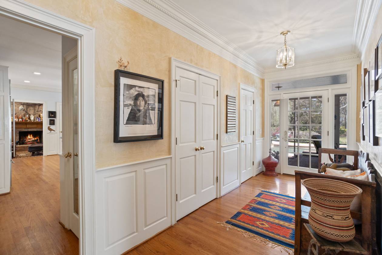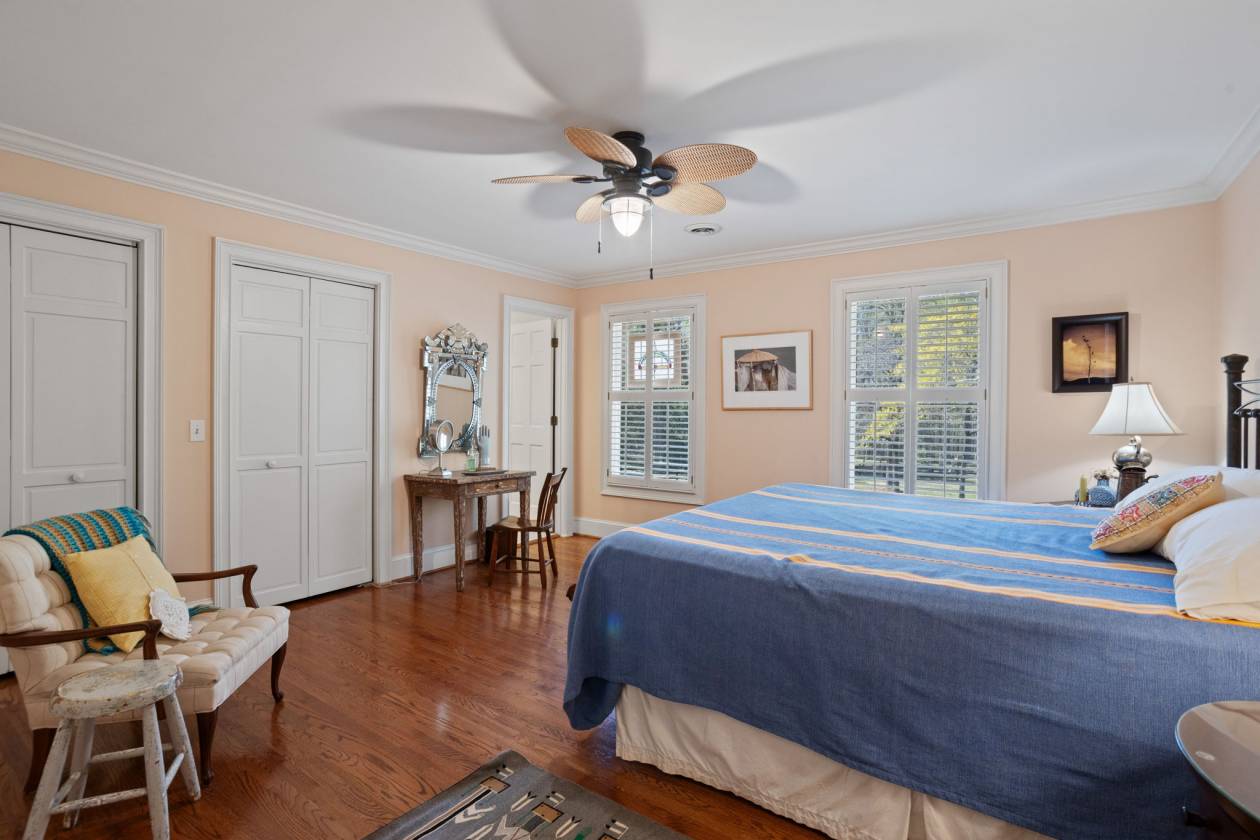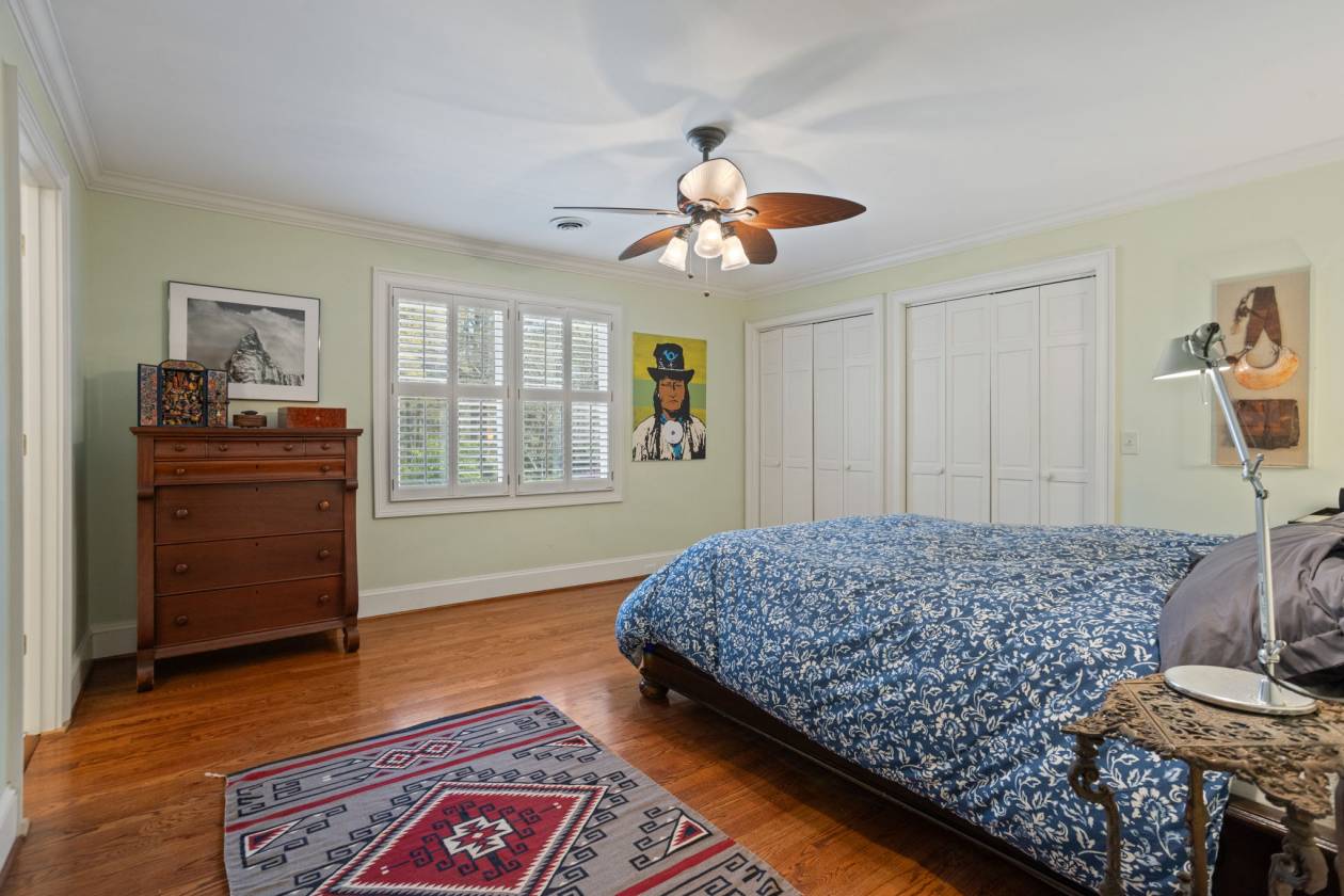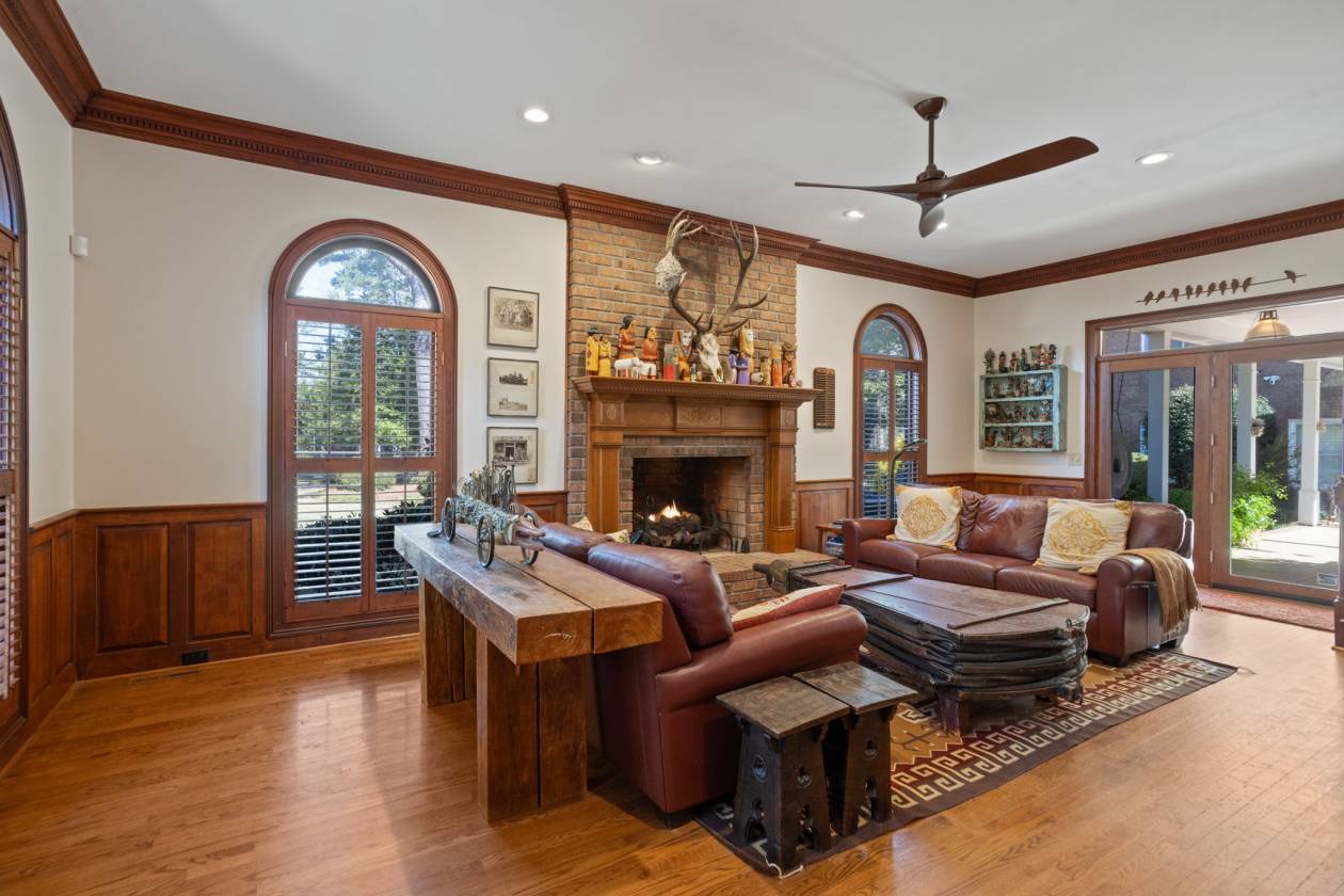 - High ceilings, hardwood floors, crown molding, plantation shutters, and five fireplaces