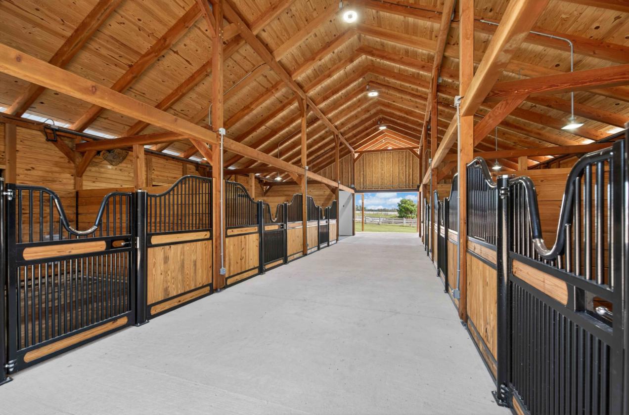 - Concrete center aisle, wash and tack/grain room