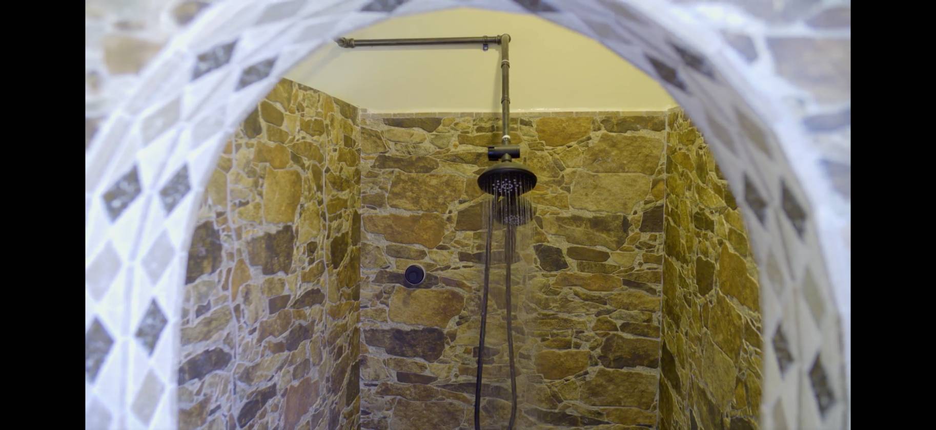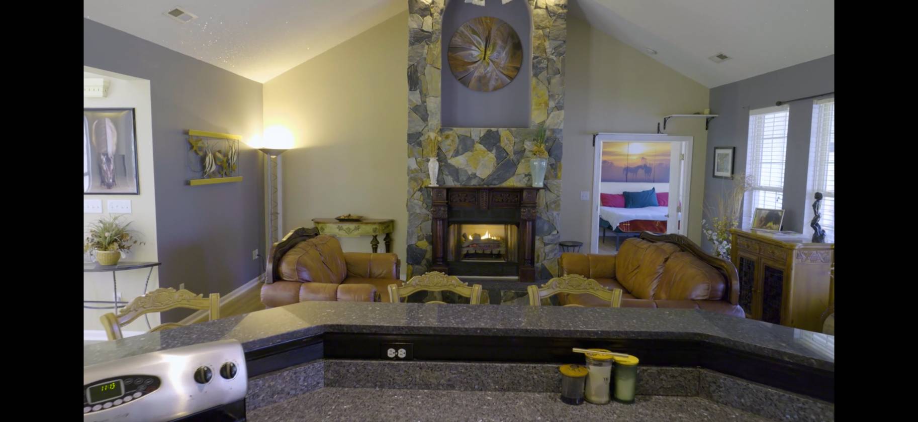 - kitchen granite counters, stainless appliances, river rock stone bar