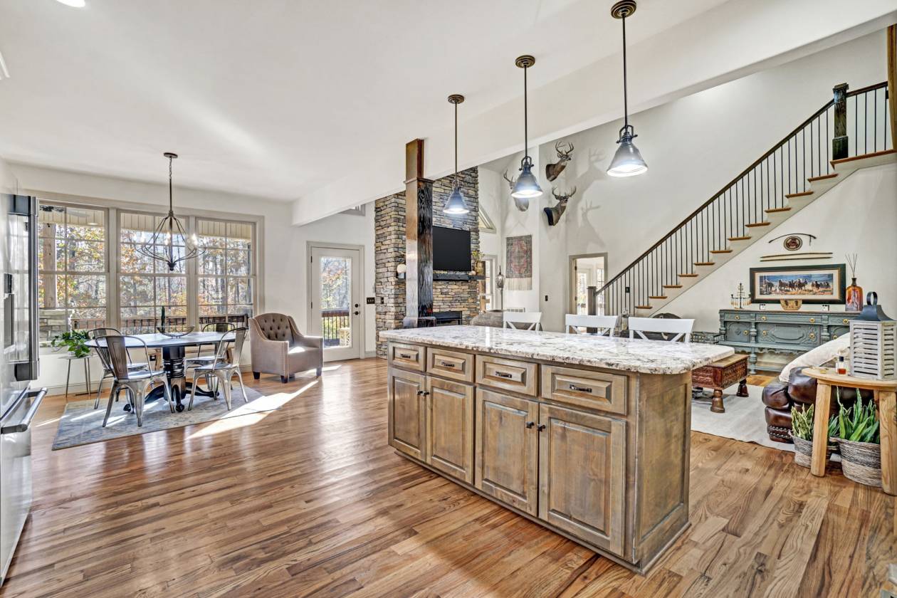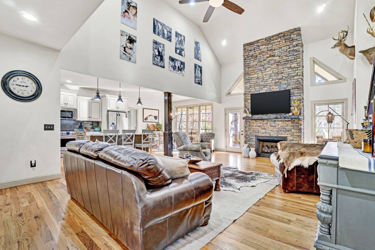 - Floor-to-ceiling stone fireplace in living room