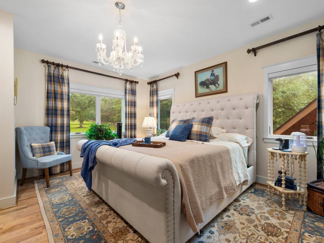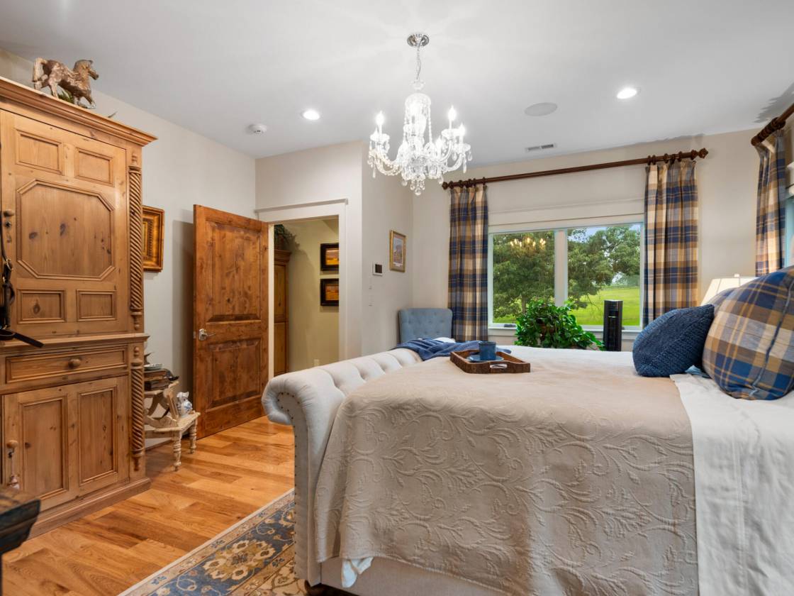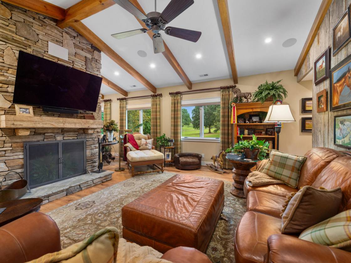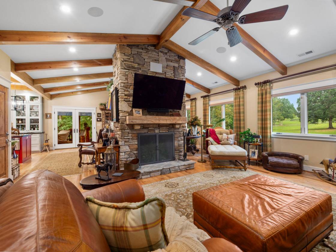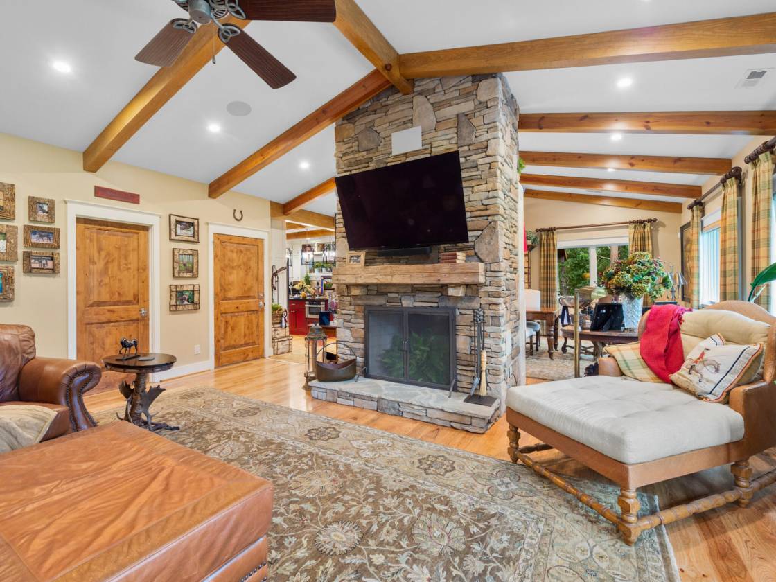 Fabulous equestrian barndominium located in the Enclave at Fairview Farm. This 2BR/2.5BA barn style home is a true delight right from the initial approach, including its custom wood gated entrance, winding driveway, and absolutely stunning timber framed porte-cochère. Inside the home you are treated to refined living spaces. Large gourmet kitchen with high-end appliances and ample work space and storage - including walk-in pantry. Cathedral ceilings, rich hickory plank wood floors, knotty alder doors, wood burning fireplace with gas starter. Spacious primary bedroom and bath, with soaking tub and shower. Outside and around the home, more unique details and blending of styles, including natural bark siding, tree trunk support timbers, and tree limb balusters. The covered balcony deck is perfect for relaxing, dining, or entertaining, and is easily accessed from the interior kitchen/main dining area. There is also a lower level tree house style suspended outdoor patio deck that leads down to a fenced dog yard. The ground level offers a 4-stall center aisle barn with exterior stall doors opening to dry lot and pasture areas. Finished ceilings, wash bay, storage/feed room, fly spray system. mud room main entry, 1/2 bath and laundry. The property also features a new, in-process build of a large detached barn/garage to be completed prior to closing. The floor plan can accommodate a variety of uses, including vehicle/equipment storage, workshop, and/or additional horse shelter. There is also a suitable building site for a larger home, as well as space for riding arena, if desired, and there are community riding trails (note: Campbell residents can also acquire membership to the nearby FETA trail system) Additional notable amenities include a whole house generator, dual fuel HVAC system, and propane gas. This truly unique property offers a versatile blend of spacious, open-concept living with the durability and rustic charm of a barn-style home, while at the same time providing a strong connection to the surrounding landscape. Ideal for equestrians seeking a smaller lifestyle footprint and easy-to-maintain property. Don't delay, book your showing today!