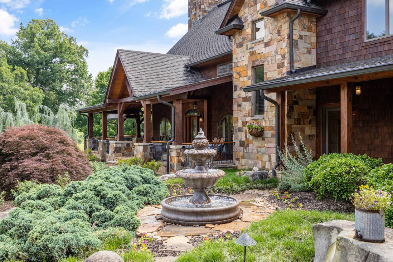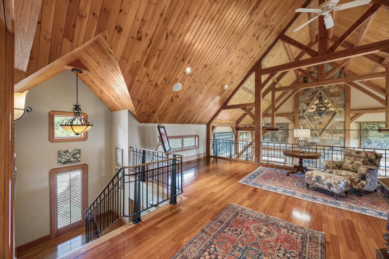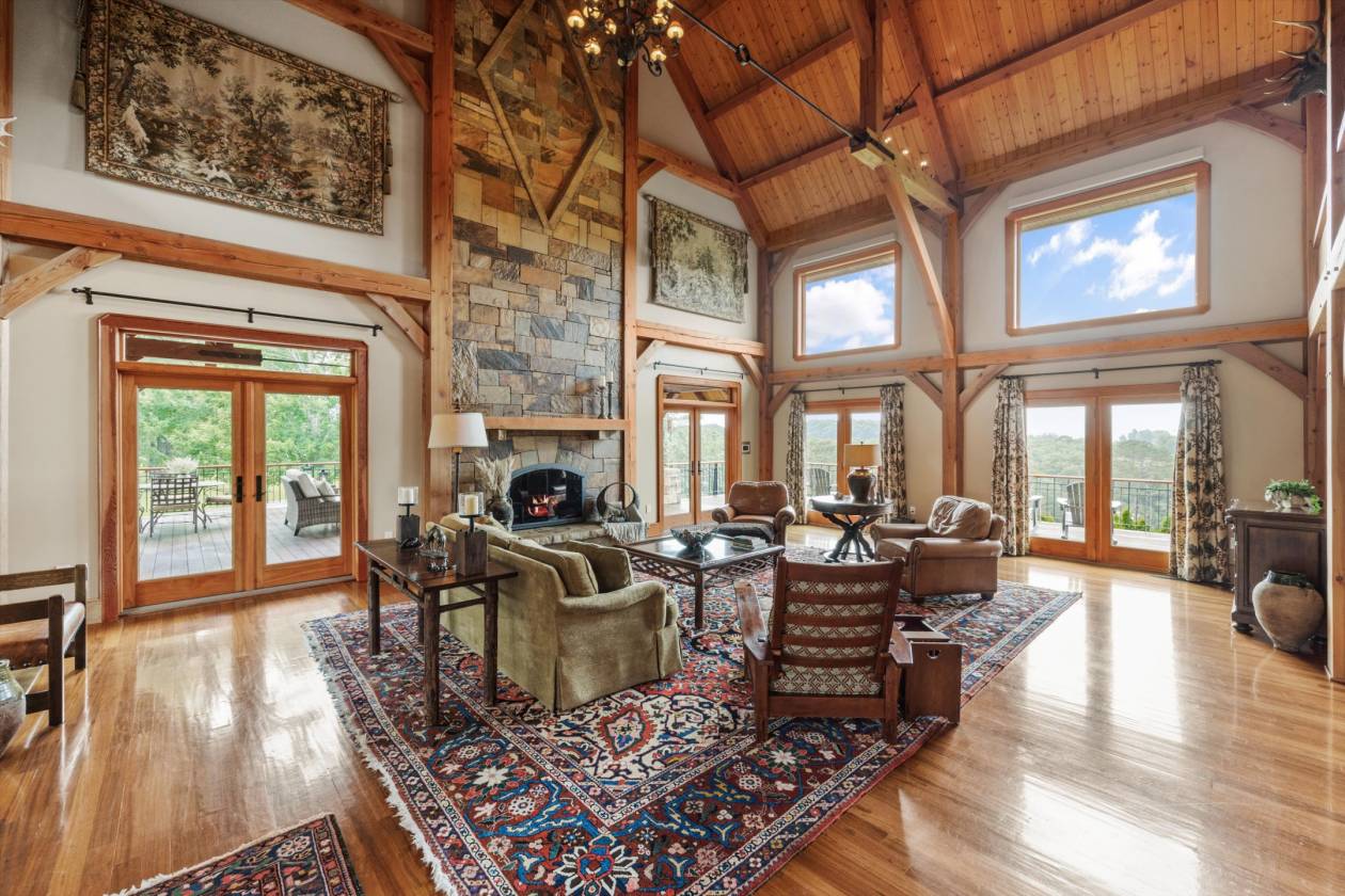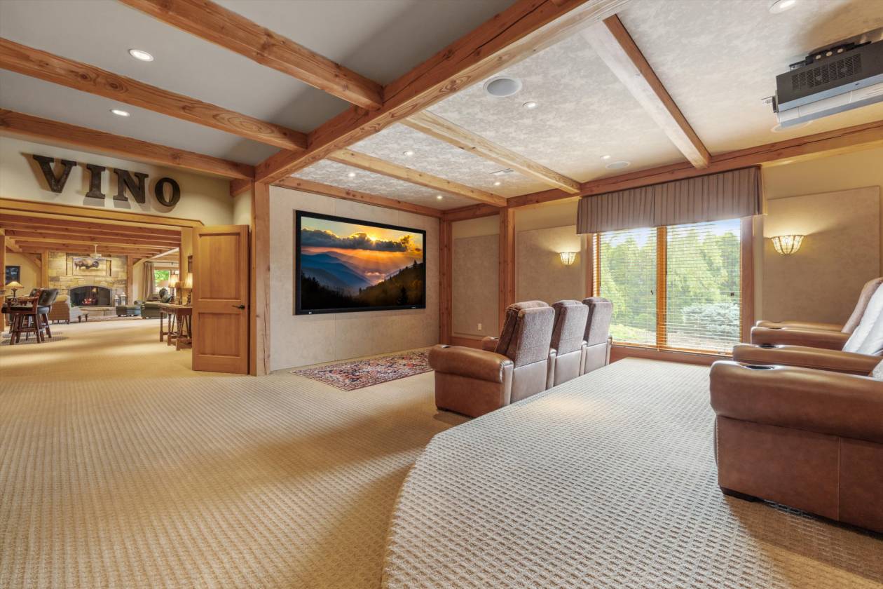 - Custom designed details including the impressive timber frame construction supported by a poured concrete foundation, Lutron Smart Home Technology (control lighting, audio & video, security, even window treatments from your smart phone, iPad, or control panel), remarkable main level rooms including the Great Room with 32' Cathedral Ceiling and a floor to ceiling Crab Orchard Stone gas Fireplace, Angelim Pedra Hardwood Floors, Gourmet Kitchen features a three-level Island, professional-grade appliances, and farm sink with view of the Smokies. There is a wood-beamed Dining Area, a spacious main-level Master Bedroom offering views of the Smoky Mountains, plus an en-suite oasis with a heated limestone floor. A floating oak Staircase leads to the second level, which includes a Loft and two spacious Guest Rooms with custom en-suite Baths. The Lower Level features a large Game Room with a gas-burning Fireplace, a Kitchen with a Wet Bar and more, a Media Room (110' wall screen & Runco projector and JBL Sound System), a 900-bottle temperature & humidity-controlled Wine Cellar, and a covered Patio. Main level outdoor living features an exceptional Veranda with Ironwood decking, a floor-to-ceiling Crab Orchard Stone wood-burning Fireplace, mountain views, and an open Porch facing eastward toward the Smokies. A large Motor Court serves the main house with stone pavers. There is a 3-Car air-conditioned Carriage House, accessed by a handsome timber-framed breezeway, plus a side entry door for a golf cart or ATV.