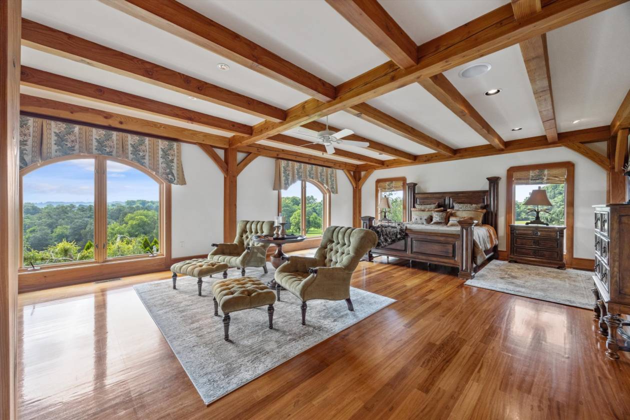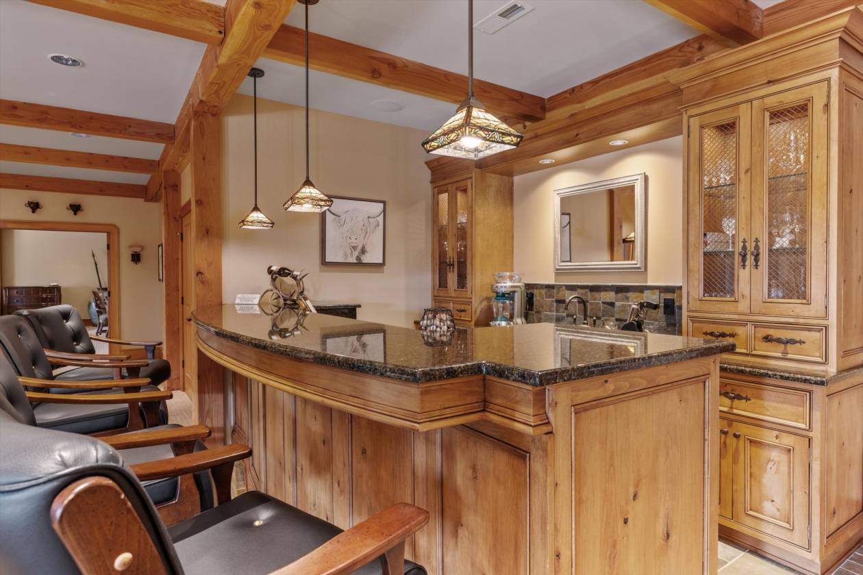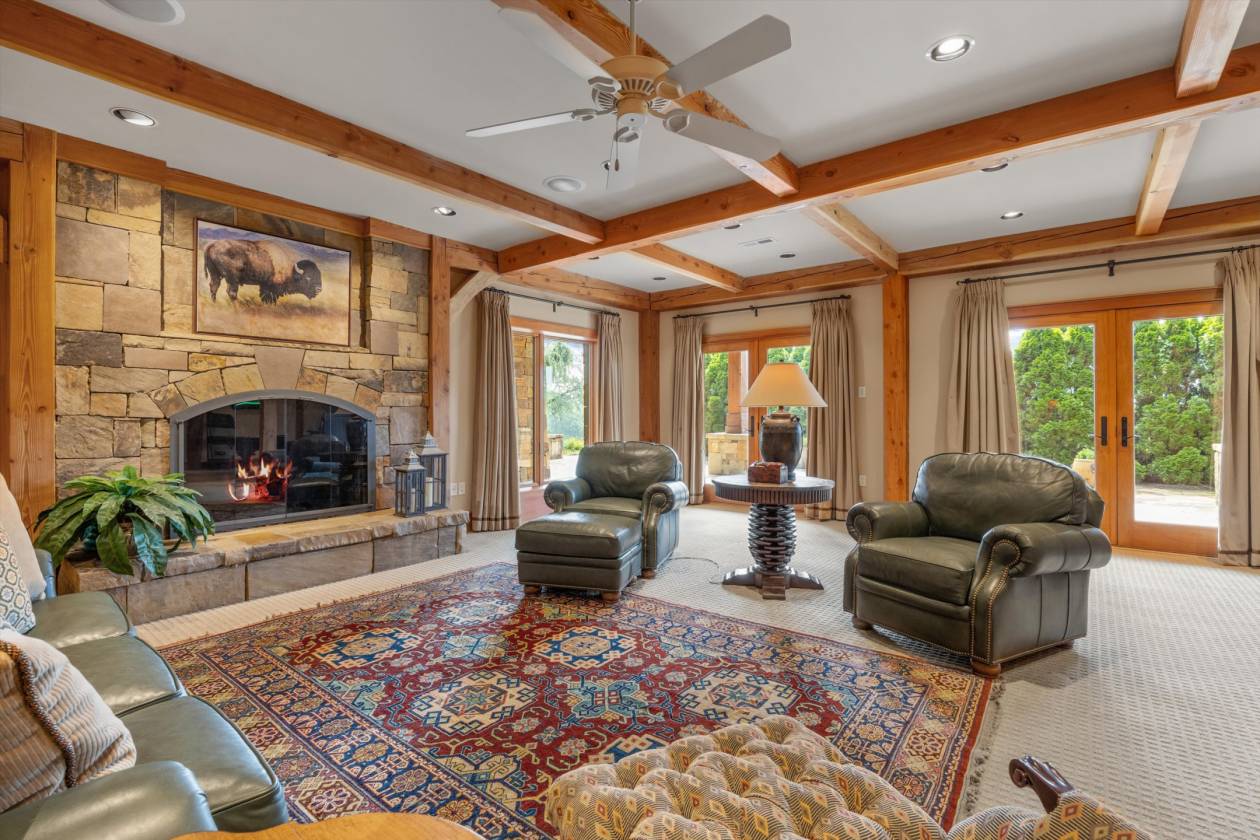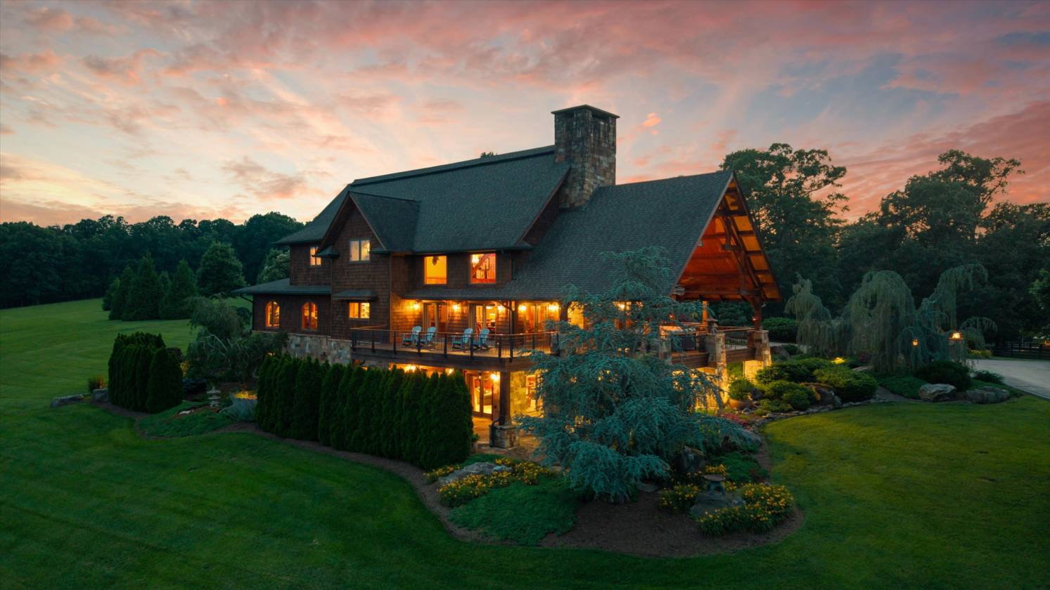 - Custom designed details including the impressive timber frame construction supported by a poured concrete foundation, Lutron Smart Home Technology (control lighting, audio & video, security, even window treatments from your smart phone, iPad, or control panel), remarkable main level rooms including the Great Room with 32' Cathedral Ceiling and a floor to ceiling Crab Orchard Stone gas Fireplace, Angelim Pedra Hardwood Floors, Gourmet Kitchen features a three-level Island, professional-grade appliances, and farm sink with view of the Smokies. There is a wood-beamed Dining Area, a spacious main-level Master Bedroom offering views of the Smoky Mountains, plus an en-suite oasis with a heated limestone floor. A floating oak Staircase leads to the second level, which includes a Loft and two spacious Guest Rooms with custom en-suite Baths. The Lower Level features a large Game Room with a gas-burning Fireplace, a Kitchen with a Wet Bar and more, a Media Room (110' wall screen & Runco projector and JBL Sound System), a 900-bottle temperature & humidity-controlled Wine Cellar, and a covered Patio. Main level outdoor living features an exceptional Veranda with Ironwood decking, a floor-to-ceiling Crab Orchard Stone wood-burning Fireplace, mountain views, and an open Porch facing eastward toward the Smokies. A large Motor Court serves the main house with stone pavers. There is a 3-Car air-conditioned Carriage House, accessed by a handsome timber-framed breezeway, plus a side entry door for a golf cart or ATV.