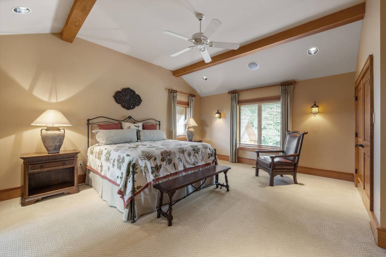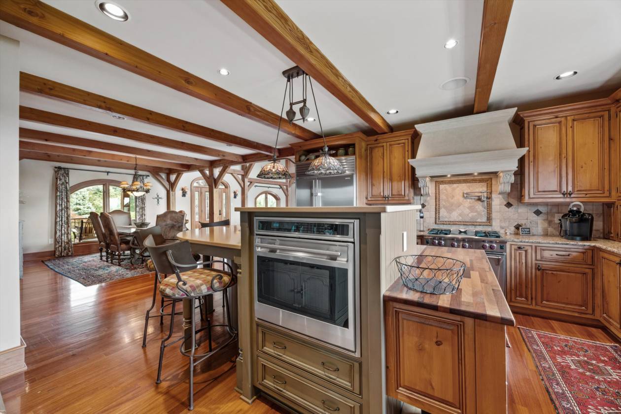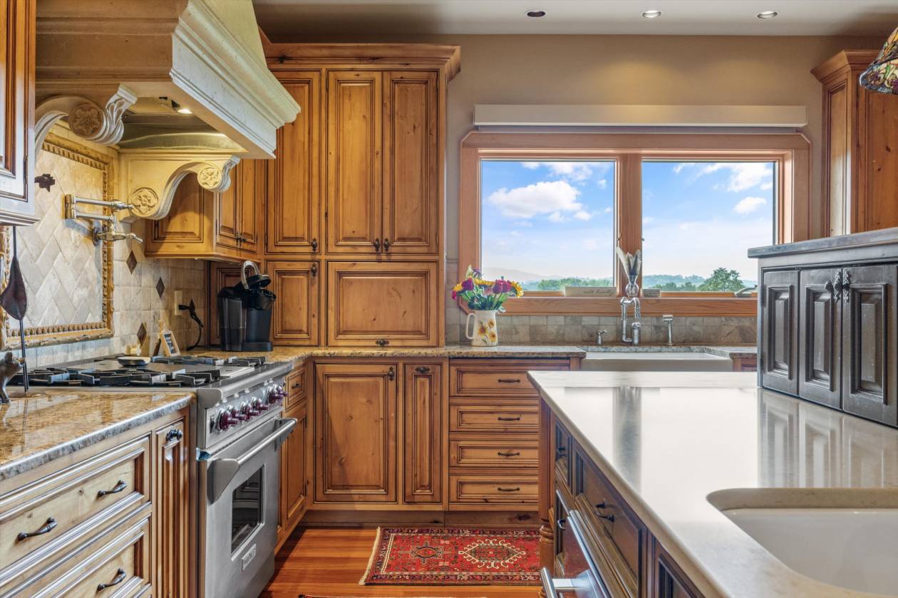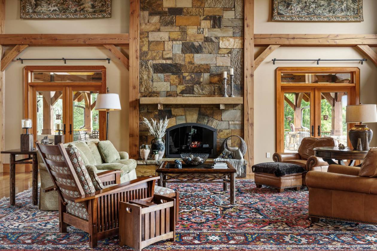 - Custom designed details including the impressive timber frame construction supported by a poured concrete foundation, Lutron Smart Home Technology (control lighting, audio & video, security, even window treatments from your smart phone, iPad, or control panel), remarkable main level rooms including the Great Room with 32' Cathedral Ceiling and a floor to ceiling Crab Orchard Stone gas Fireplace, Angelim Pedra Hardwood Floors, Gourmet Kitchen features a three-level Island, professional-grade appliances, and farm sink with view of the Smokies. There is a wood-beamed Dining Area, a spacious main-level Master Bedroom offering views of the Smoky Mountains, plus an en-suite oasis with a heated limestone floor. A floating oak Staircase leads to the second level, which includes a Loft and two spacious Guest Rooms with custom en-suite Baths. The Lower Level features a large Game Room with a gas-burning Fireplace, a Kitchen with a Wet Bar and more, a Media Room (110' wall screen & Runco projector and JBL Sound System), a 900-bottle temperature & humidity-controlled Wine Cellar, and a covered Patio. Main level outdoor living features an exceptional Veranda with Ironwood decking, a floor-to-ceiling Crab Orchard Stone wood-burning Fireplace, mountain views, and an open Porch facing eastward toward the Smokies. A large Motor Court serves the main house with stone pavers. There is a 3-Car air-conditioned Carriage House, accessed by a handsome timber-framed breezeway, plus a side entry door for a golf cart or ATV.