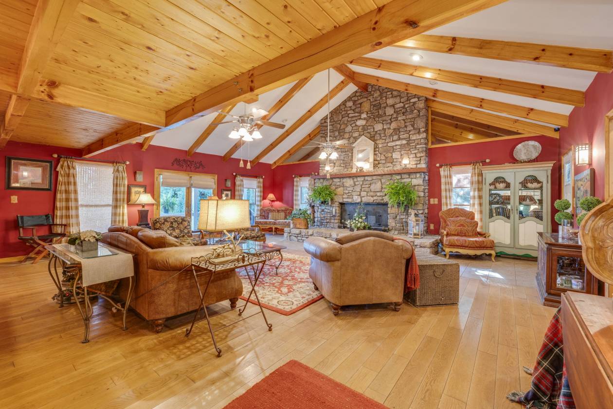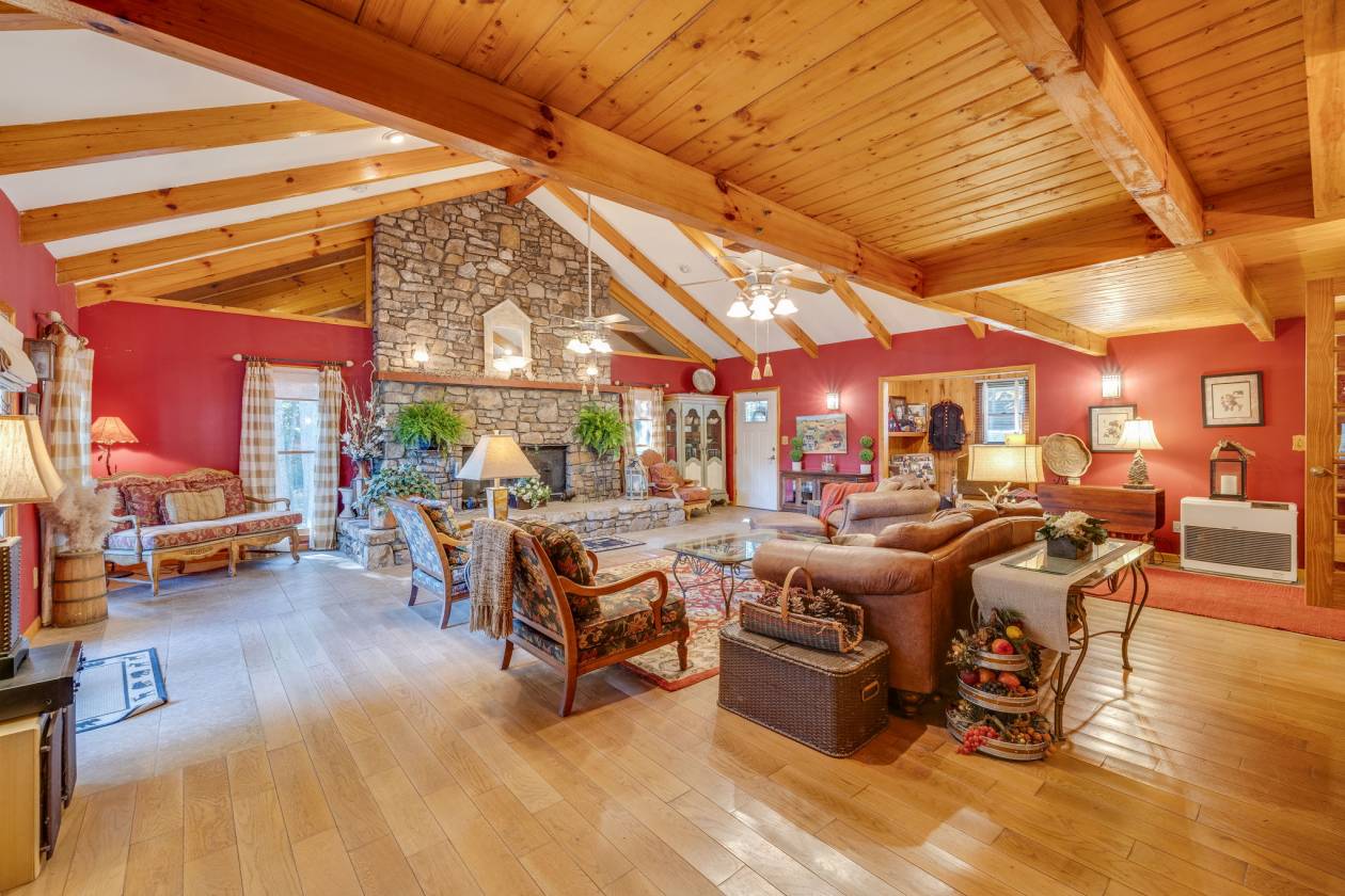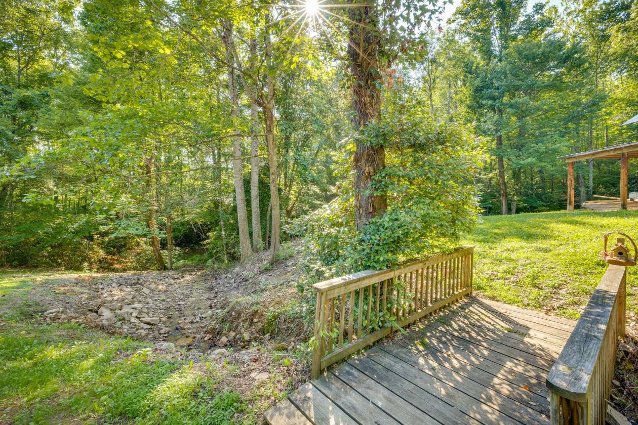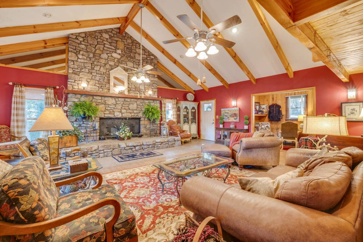 Welcome to a property that perfectly envelopes the natural beauty of East Tennessee in the most magnetic way. Passing through the stone gates onto the 78 acre property, you are met with rolling pastureland, the shade of the trees, and the sounds of one of four bubbling creeks that winds its way through the entire estate. Opportunity for development abounds with the unique amount of gorgeous building sites, framed by mountain views. With 3/4 of a mile of the property bordering the Cherokee National Forest, seclusion and natural splendor is found even beyond your personal haven. Explore the property with pathways and access to the Appalachian Trail, enjoy an expansive garden, and take advantage of the area already set up for beekeeping. Blueberry bushes, blackberries, chestnut trees, holly trees, and mountain laurel are just a few indigenous species found. Envision a magnificent venue or equestrian paradise coming to life. Nestled at the end of the driveway is a peaceful retreat whose walls contain wood and stone that was harvested from the property itself. This home is pleasing in every way for your desire to have a custom lodge that compliments the property it sits upon so perfectly. With details like hardwoods running throughout, soaring vaulted ceilings, a stunning wood-burning stone fireplace that is the centerpiece of the home, domestically harvested wood accents throughout, among many other details, this home delights in so many ways. The spacious primary bedroom and en suite primary bathroom are found on the main level along with expansive custom kitchen, laundry room, dining room, second den that could be converted to a third bedroom, and full bathroom. A loft overlooks the living room and a second bedroom is found upstairs. Outside you will enjoy the natural sounds of the rippling creek and enjoy a well-fed fountain off your covered porch. An oversized barn offers plenty of usability and southern charm. This property is a rare gem and must be experienced!