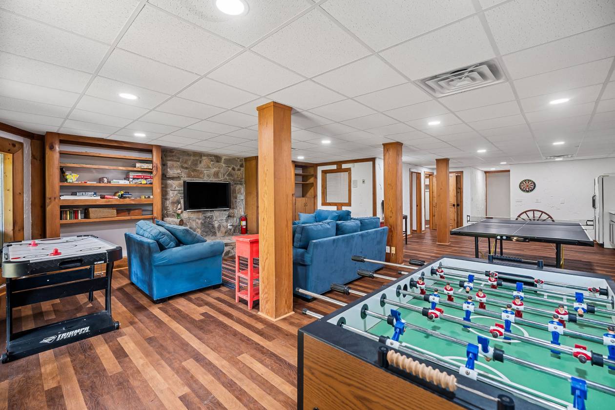 - home offers gorgeous views, full finished basement with sleeping space, old room used as a recording room, game area, bathroom, large windows, fireplace, huge pantry, and more.