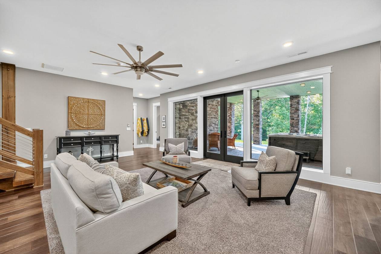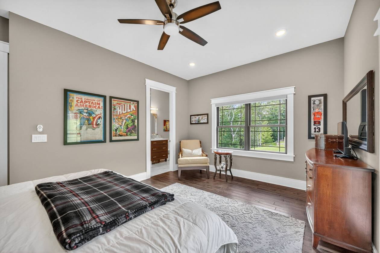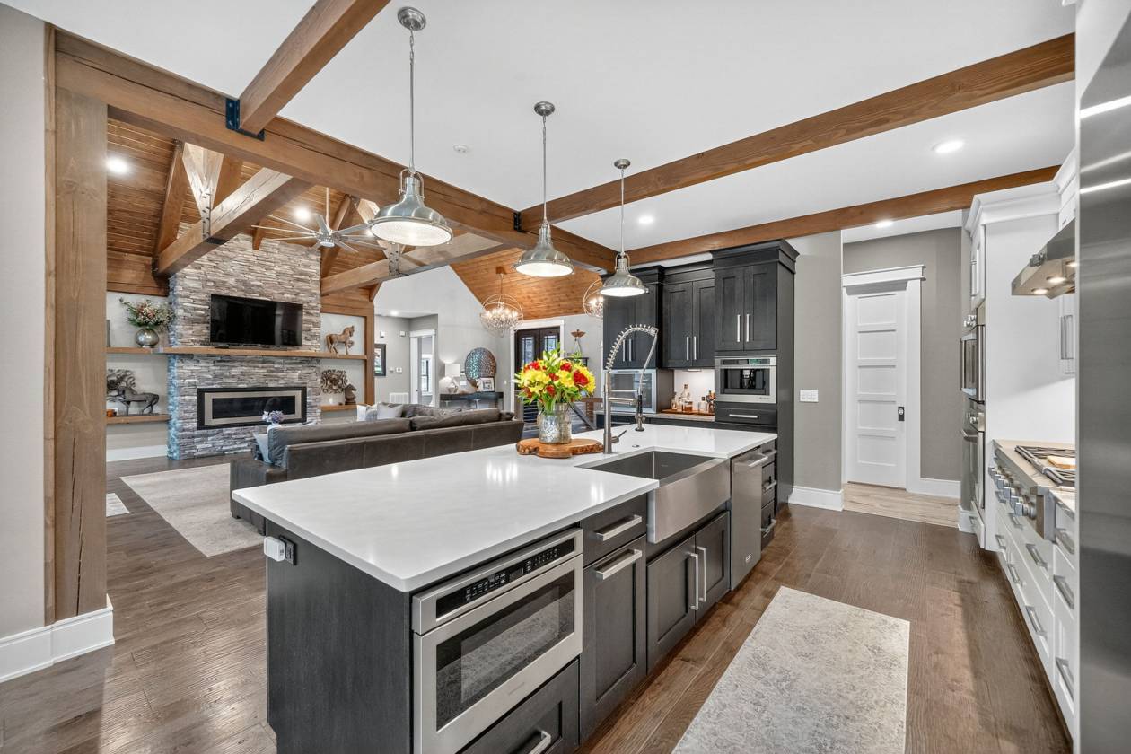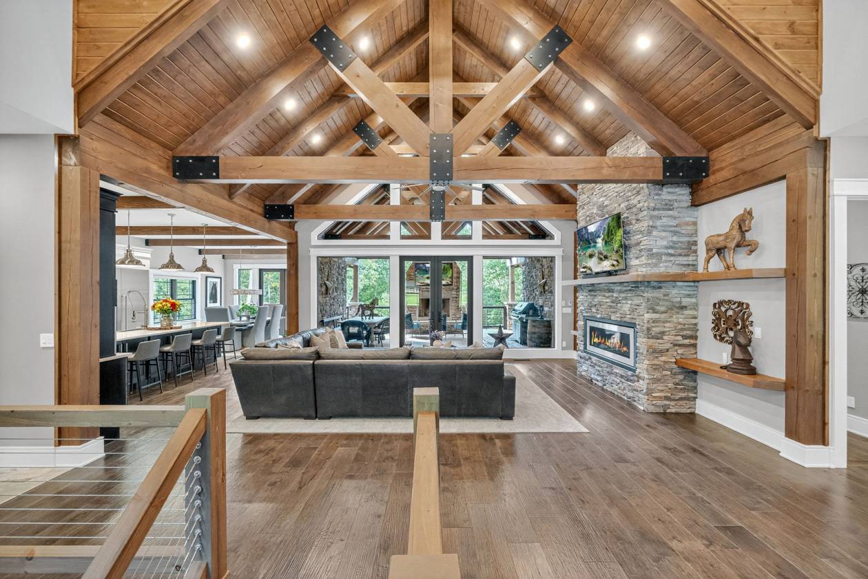 - This 4-bedroom, 4-bath 4 car garage estate spans over 7,088 sq ft of refined craftsmanship, highlighted by 8' solid hand-scraped Amish hardwood flooring, Shaw designer carpet, and travertine stone finishes throughout. As you walk through this grand estate you have a beautiful stone gas fireplace in the great room. The vaulted ceilings create a living experience that's both grand and grounded. Step outside and picture yourself sitting next to another massive stone wood burning fireplace on the back patio.