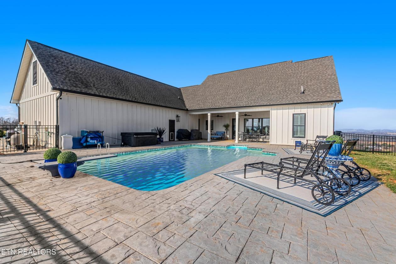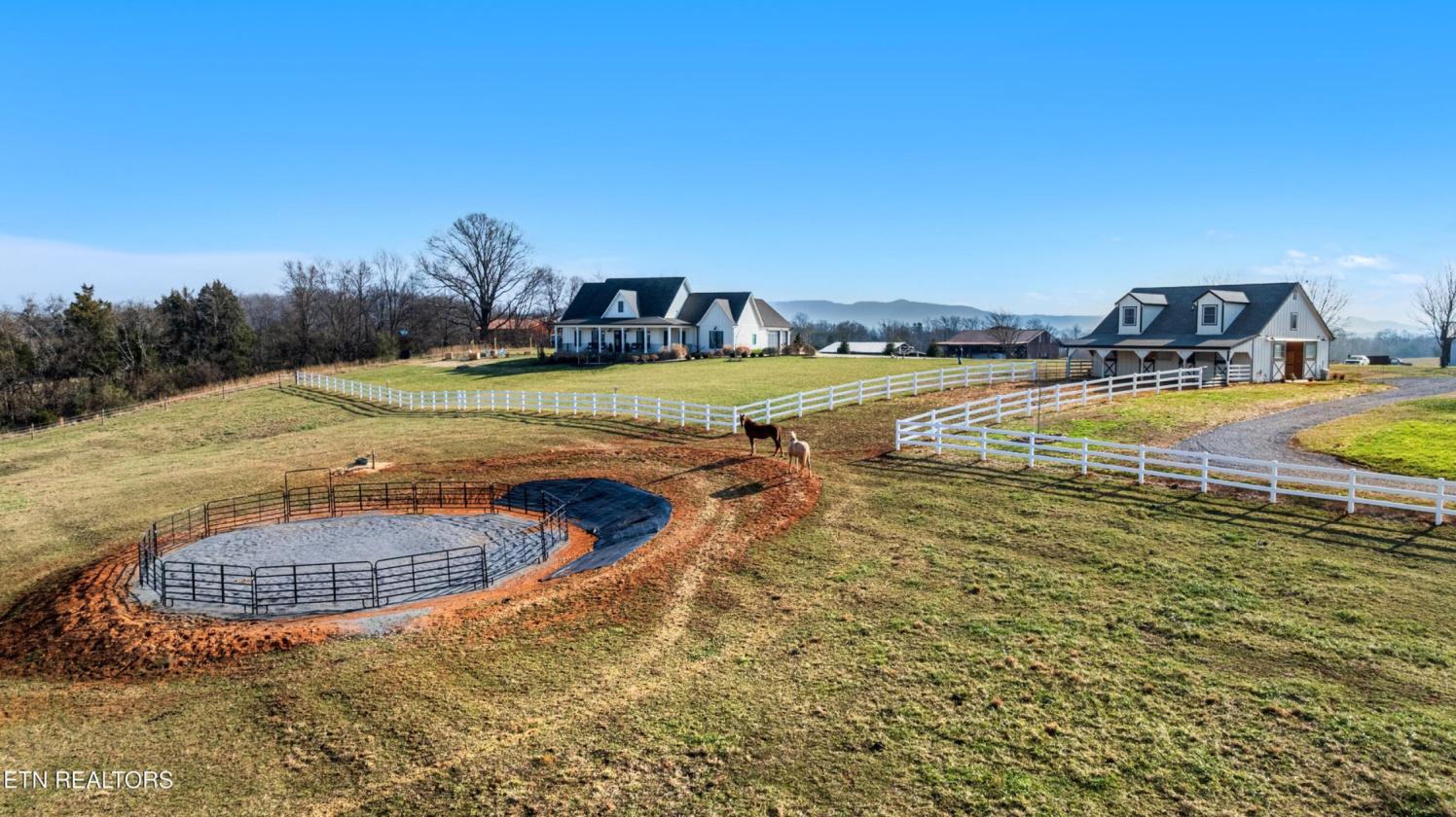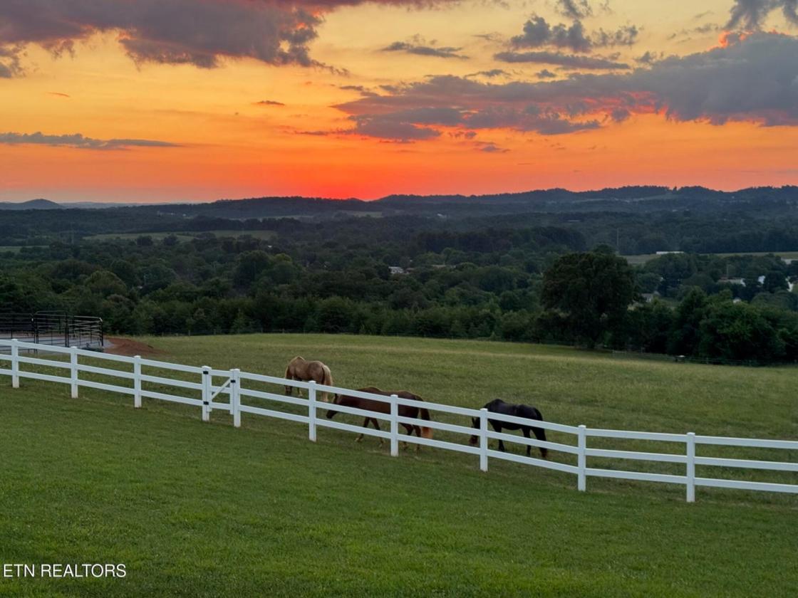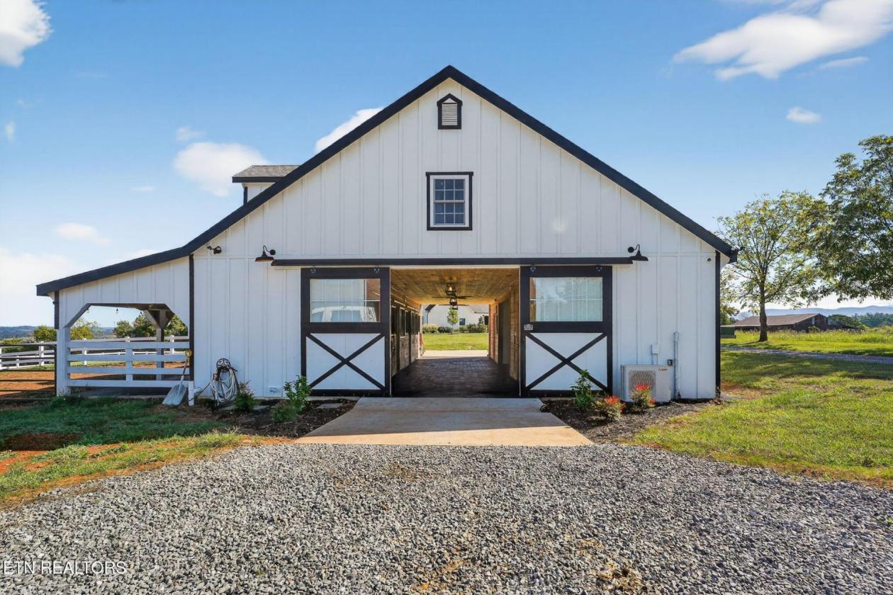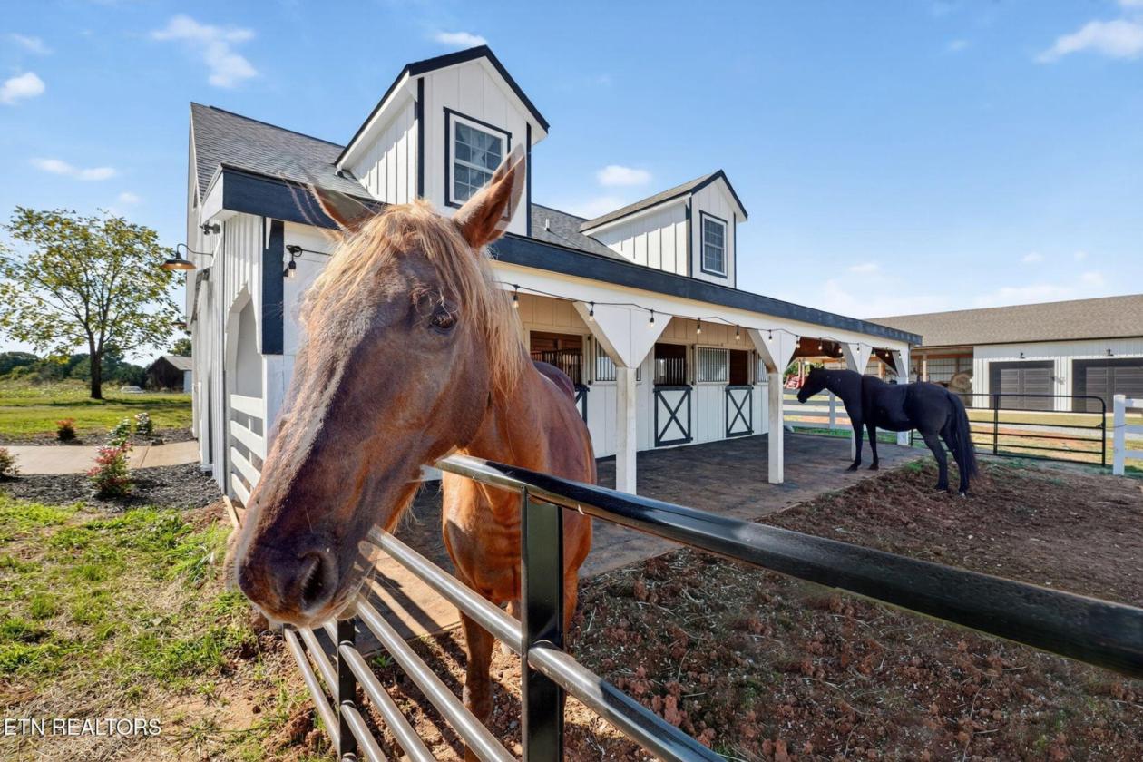 Luxurious Gentleman's Farm! Don't miss this exceptional 12+ acre estate featuring brand-new equestrian facilities with over $350,000 in recent improvements. This stunning property offers breathtaking, unobstructed mountain views and is thoughtfully designed to balance luxury, function, and privacy—all just 15 minutes from the modern amenities of Maryville. The modern farmhouse welcomes you with a large covered front porch overlooking both the mountains and your horses. Inside, the home showcases numerous custom builder upgrades, including 10-foot ceilings, extensive crown molding, and a gourmet kitchen ideal for entertaining. The home is proportionally designed to maximize mountain views from both the front and rear. The main level features 3 bedrooms, 2.5 bathrooms, a breakfast room, study, laundry room, and open living spaces filled with natural light. An upper-level bonus room provides flexible space for a media room, fitness area, or additional living space. The 3-car garage offers ample storage and workspace. Step outside to your private backyard oasis featuring a covered patio and a saltwater, temperature-controlled liner pool, all overlooking the Smoky Mountains—perfect for relaxation or entertaining family and guests. The new equestrian barn and office are truly exceptional. This 36x41, three-stall barn includes 10x12 sliding stall fronts, automatic waterers, rubber-matted stalls with rock and sand bases for optimal horse comfort, and direct access to a rubber-matted 10x41 overhang. The wide center aisle features rubber pavers for safety and includes an on-demand hot water wash bay, feed room, and tack room. The entire upper level is finished as a full office and lounge area. Horse-safe fencing lines the front of the property with vinyl plank fencing and high tensile two of four strands electrified. For additional versatility, the 24x64 workshop/shop includes two oversized garage doors—ideal for boats, campers, equipment, or storage. An attached covered area is perfect for hay, equipment, or potential additional stalls. This is a rare opportunity to own a premier Tennessee estate where you can enjoy horses, livestock, recreation, and true country living—without sacrificing convenience, comfort, or luxury.