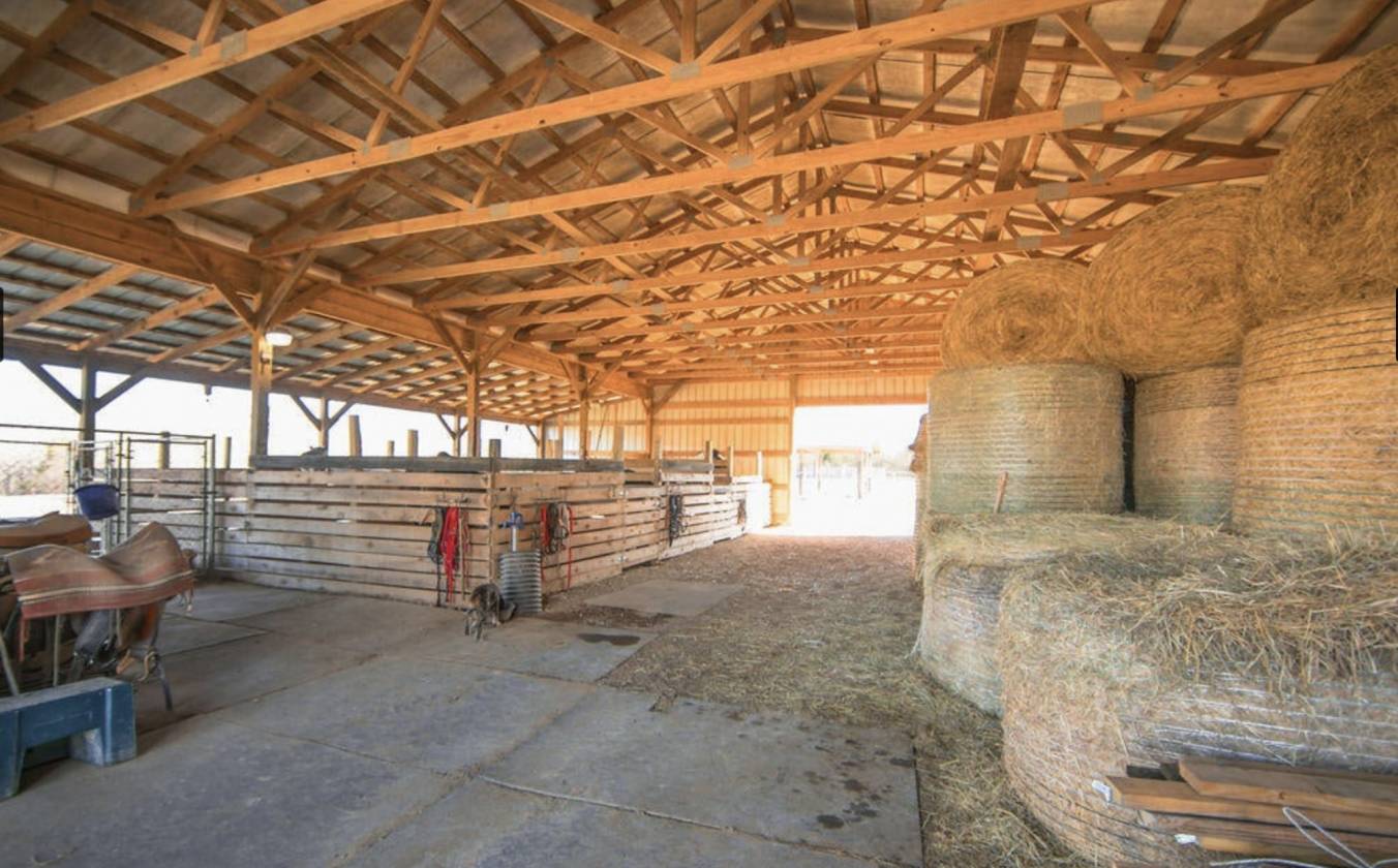 - Water, electric, tack room, 5+ stalls, work shop, insulated ceiling, store 120+ round bales, additional space for farm equipment and tractors, lawn mowers, storage, dog kennels, grain bins, easily accessible, built 2009