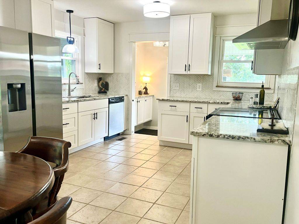 - New kitchen remodel, large open space, new white cabinets, exquisite Brazilian Blue Flower granite tops, new LG dishwasher, new Samsung oven and range, specialty herringbone white tile backsplash.