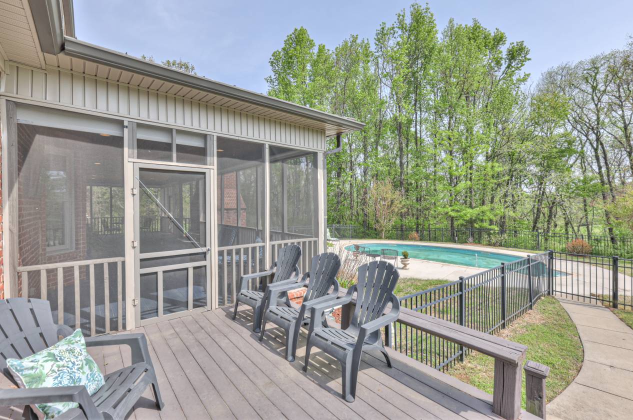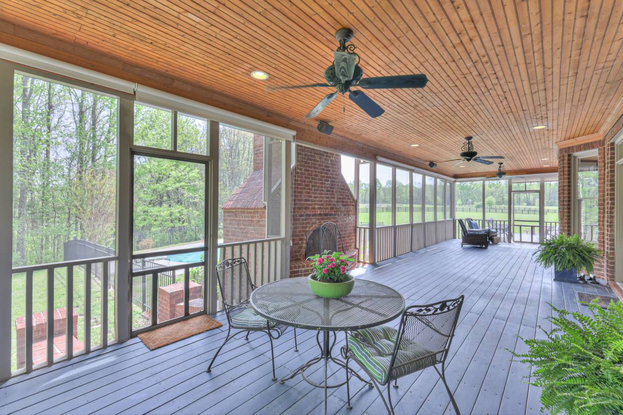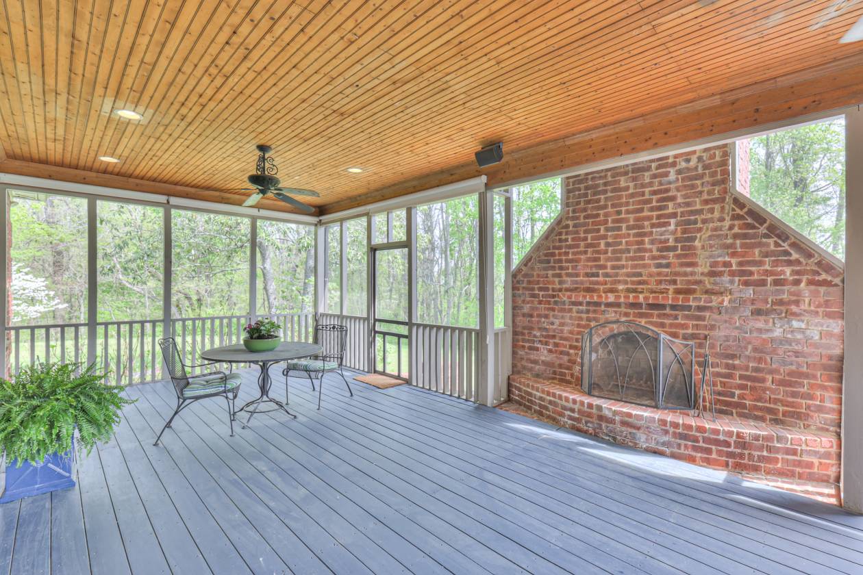 - Full screened back porch (15x46) with wood burning fireplace and view of in-ground pool