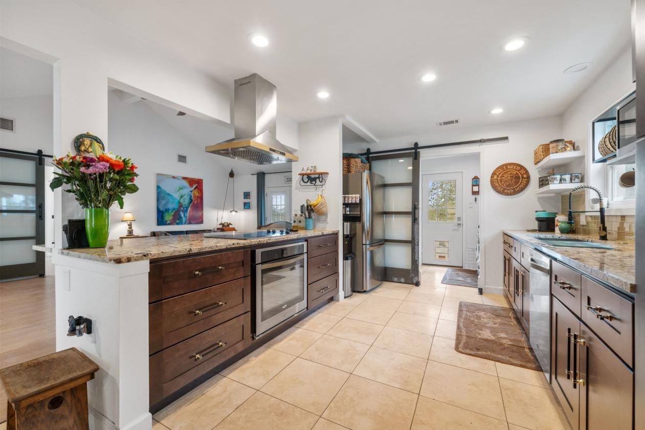 Picturesque equestrian retreat on 5.2 acres with breathtaking Hill Country views for miles. Tucked away from the noise of the city, this exceptional property offers the peace and privacy of country living while still being just minutes from the Lakeway Galleria and downtown Marble Falls. From the moment you arrive, the full-length front porch with cedar posts and retro ceiling fans sets a warm, welcoming tone. Inside, the open-concept floorplan is filled with character and charm, featuring beautiful wood floors, vaulted beamed ceilings, and glass French doors that frame the majestic oak trees in the backyard and create a seamless indoor-outdoor feel. The gourmet kitchen is a true showpiece with built-in stainless steel appliances, a glass tile backsplash, deep farmhouse sink with industrial-style faucet, custom vent hood, floating shelves, decorative metal dish racks, and modern hardware with brushed gold accents. Stylish glass barn doors with iron rails lead into beautifully designed living spaces, including an oversized primary suite with tray ceiling, custom window treatments, and a spacious walk-in closet. The spa-inspired bathrooms blend modern comfort with timeless style, offering quartz counters, natural wood cabinetry, river rock shower flooring, classic subway tile surrounds, custom mirrors, and designer lighting. Outdoors, this property truly shines. The backyard is a peaceful sanctuary with a firepit, expansive pergola-covered Trex patio, and built-in bar seating—perfect for enjoying star-filled nights, watching deer and foxes roam beneath the towering oak canopy, or simply taking in the incredible scenery. Equestrians will appreciate the fully functional horse setup, complete with a 4-stall barn, tack room, lean-to for trailer or hay storage, and a fully fenced arena. Whether you are a horse enthusiast, hobby rancher, or simply looking for a private Hill Country escape, this property offers a rare blend of beauty, function, and lifestyle. Additional highlights include an oversized 2.5-car garage with workshop space ideal for car enthusiasts, woodworking, or weekend projects. A rare opportunity to own a property that combines privacy, panoramic views, upscale finishes, and horse facilities all in one. $0 down financing available.