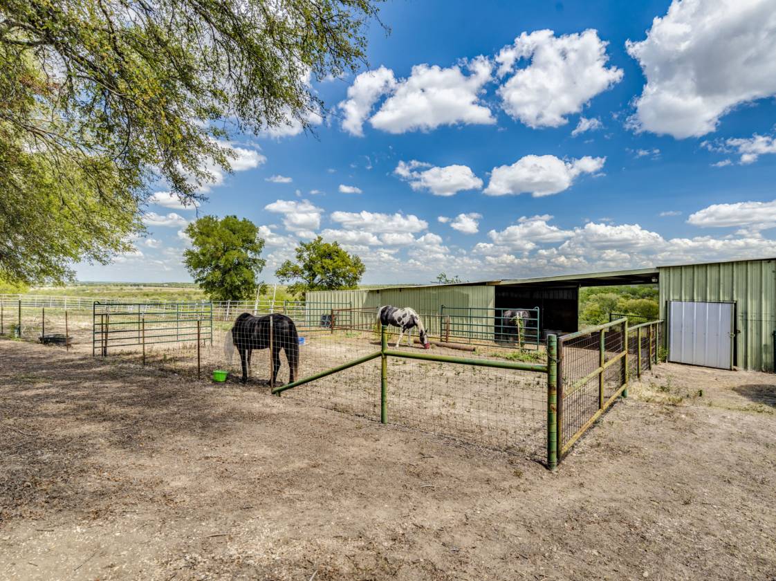 Nestled on 16+/- acres in the heart of the Hill Country, this one-story home blends wide-open space with comfortable living. The property is perfectly set up for both everyday enjoyment and country living, featuring a barn with heat-reflective roof paint, multiple storage buildings, and enough space to house 11 round bales of hay plus farm equipment. The barn was designed to provide ample room and protection from intense summer and winter weather. The home itself invites you in with sweeping views from both the front porch and side deck. Inside, an open and airy layout is enhanced by upgraded tile flooring throughout. The private primary retreat offers a walk-in closet, spa-style bath with separate tub and shower, and a versatile flex space ideal for an office, home gym, or dressing room. Secondary bedrooms are generously sized, and the jumbo laundry/utility room doubles as a “command center” with built-in desk, counters, and shelving. Additional highlights include a sunroom just behind the kitchen, a dedicated storage room with floor-to-ceiling shelving, and a bonus space at the back of the home that has served as a tack room but could easily transform into a media room, game room, or second living area. Outdoors, down a private gated entrance, the gently rolling land provides a scenic backdrop with a pond and campfire area. The mixed terrain of the property provides interesting opportunities for horse riding and trails have been cut through the more rugged areas with obstacle and jumps to complete. An agricultural exemption for wildlife management helps keep taxes low while offering space to enjoy nature. Whether your dream is to run livestock, create a private retreat, or simply soak in the Hill Country views, this property delivers endless opportunity. Just minutes to major retail, restaurants and entertainment and only 10 minutes to the tollway for easy commuting!