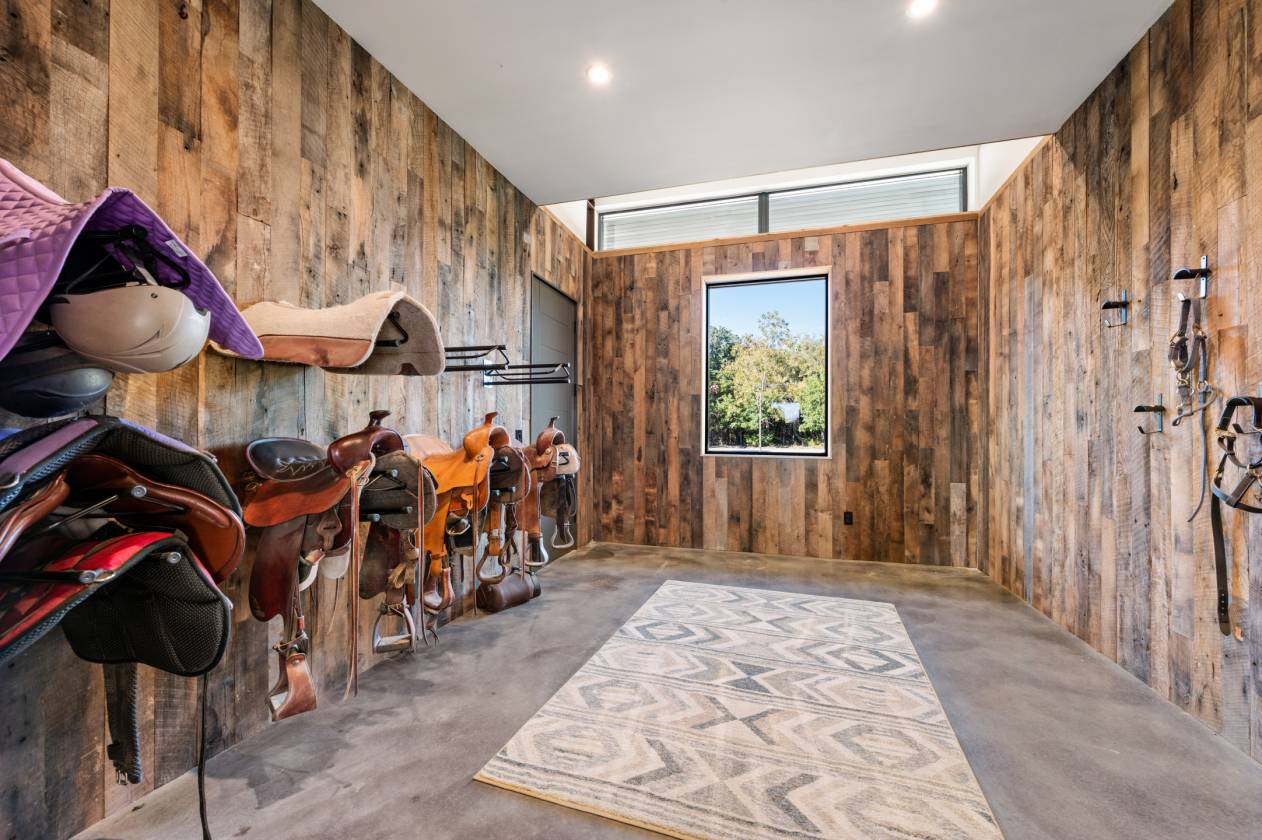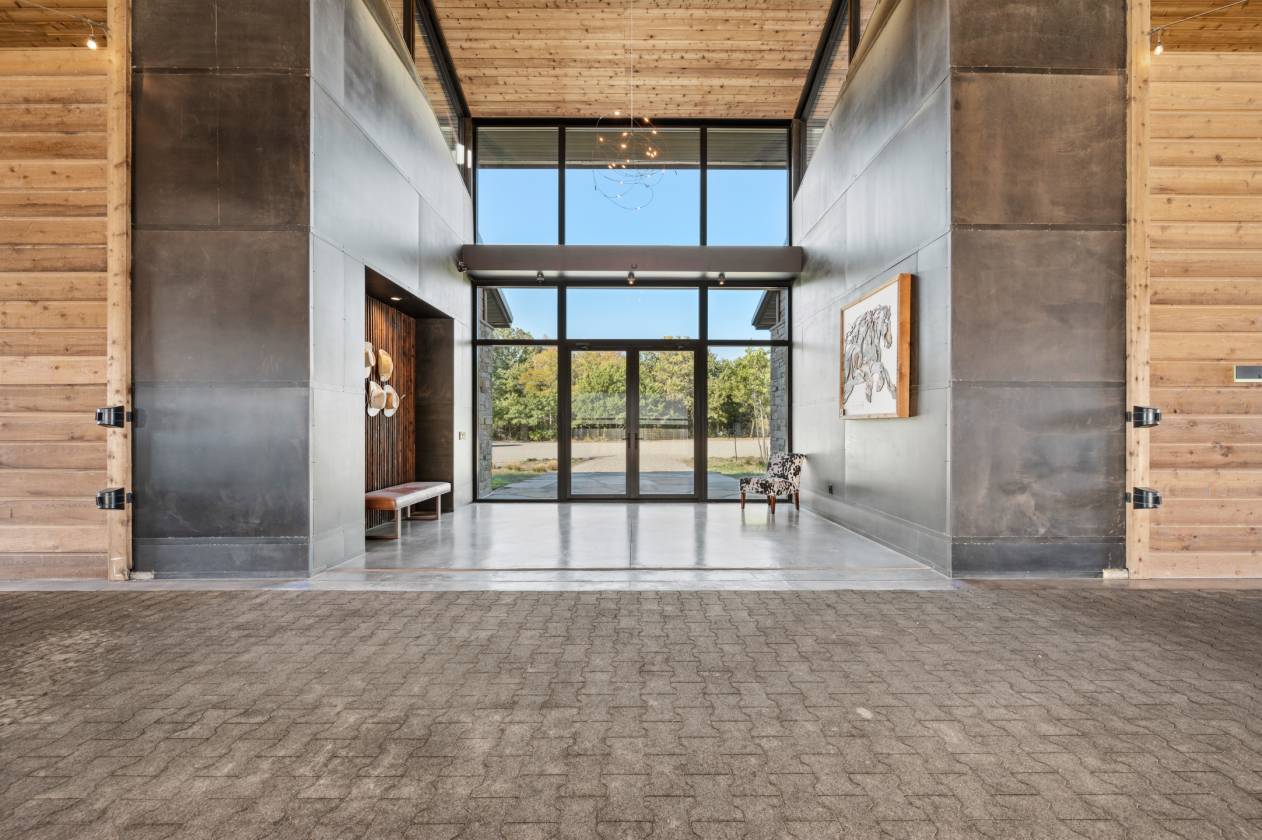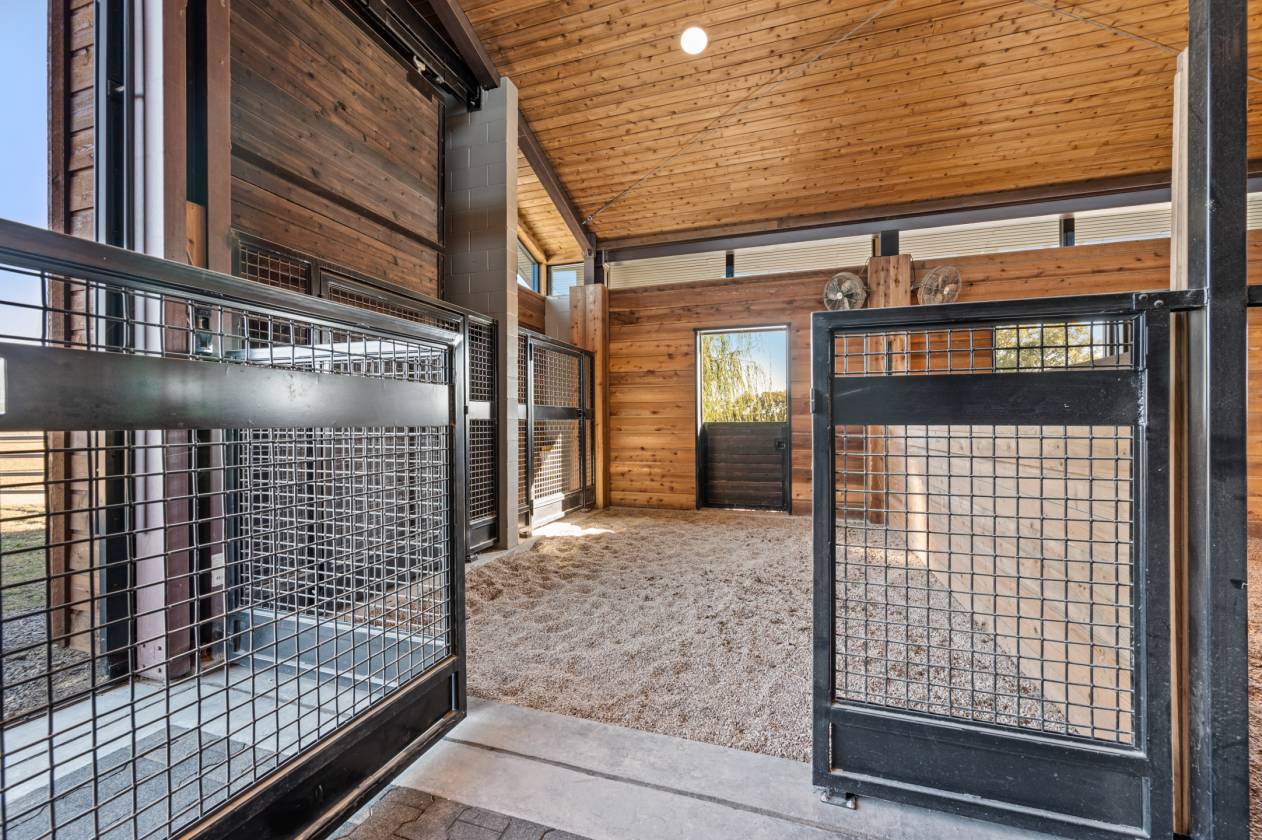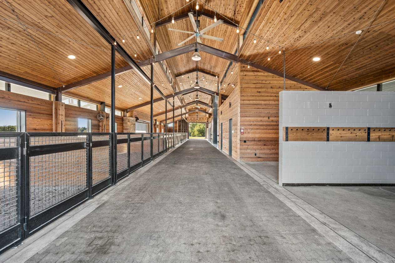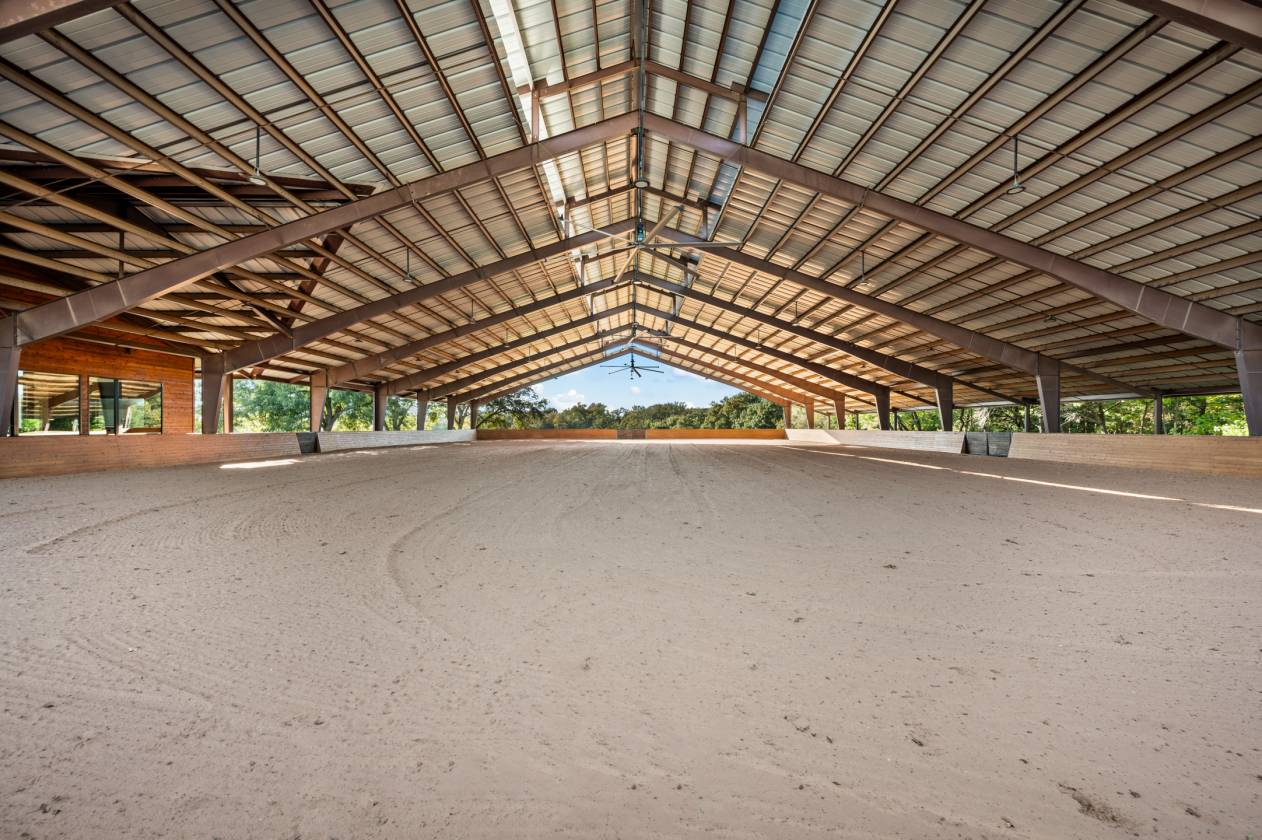 - At the heart of the property sits an impressive 122' x 46' barn, thoughtfully designed with removable stall walls allowing up to eight individual stalls or four oversized double stalls. The barn features two wash bays (one on each end), two tack bays, a kitchen, tack room, bathroom, feed room, storage, and a dedicated entrance. Practicality meets sophistication with black equine paver tile flooring throughout the aisleway—safe and non-slip for horses. Access points include a large roll-up door on the south side and double sliding doors at each end, offering excellent ventilation and flow. Adjacent to the barn is the impressive 160' x 200' covered arena, ideal for year-round training and events.