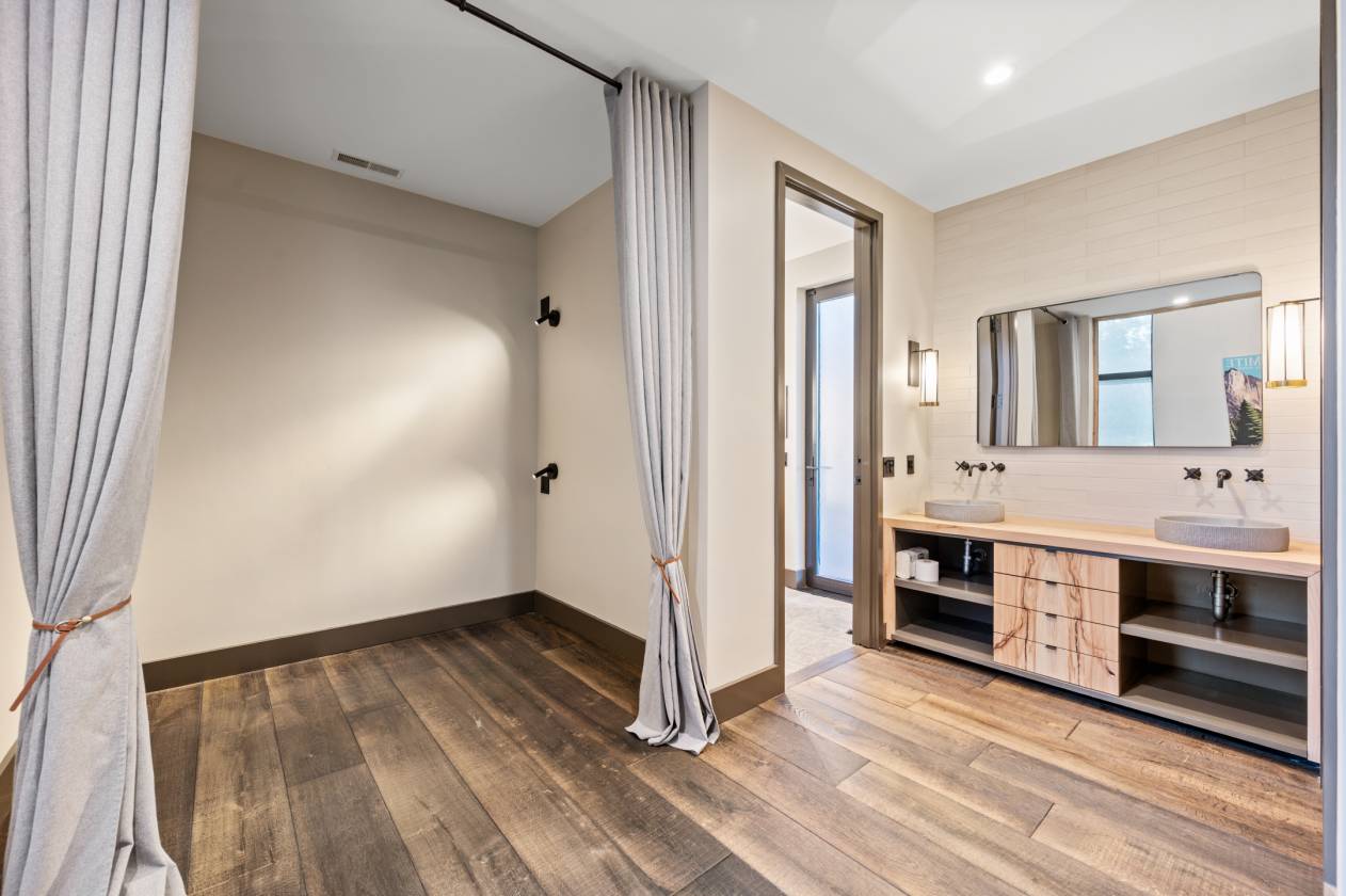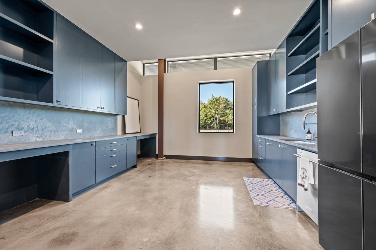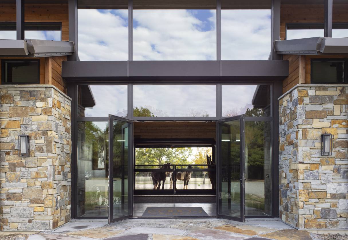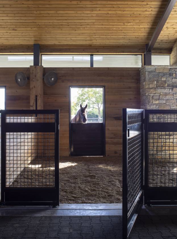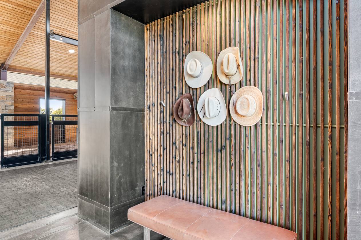 - At the heart of the property sits an impressive 122' x 46' barn, thoughtfully designed with removable stall walls allowing up to eight individual stalls or four oversized double stalls. The barn features two wash bays (one on each end), two tack bays, a kitchen, tack room, bathroom, feed room, storage, and a dedicated entrance. Practicality meets sophistication with black equine paver tile flooring throughout the aisleway—safe and non-slip for horses. Access points include a large roll-up door on the south side and double sliding doors at each end, offering excellent ventilation and flow. Adjacent to the barn is the impressive 160' x 200' covered arena, ideal for year-round training and events.