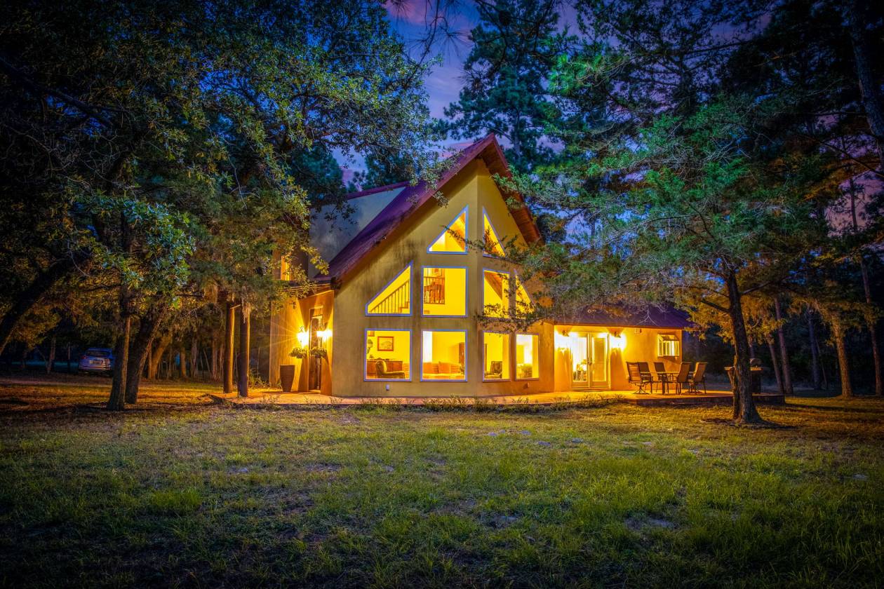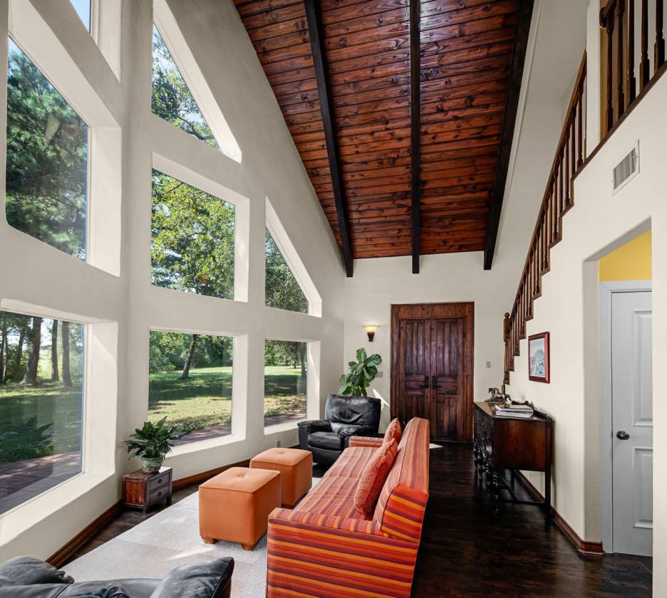 - The home on this property is thoughtfully located to provide privacy from the equestrian facilities as well as a tranquil setting to take in the nearby stream and pond. The main residence is 1,728 sf and includes 3 bedrooms and 2 bathrooms. It was custom built on the site with expansive windows to enjoy the views. This 2 story house has an upstairs primary bedroom and bath. The flooring is a mix of newer laminate flooring and carpet in the primary bedroom. You will be delighted by the double antique entrance doors that are supported by 2 stained cedar posts and you'll find tongue and groove ceilings over wood beams in many places. The kitchen features granite countertops, a granite topped island and a gas range. There are two garden windows in the kitchen overlooking the outdoor scenery. The house also features a large outdoor patio for family barbecues and taking in the sunset.