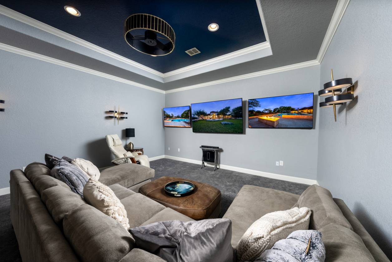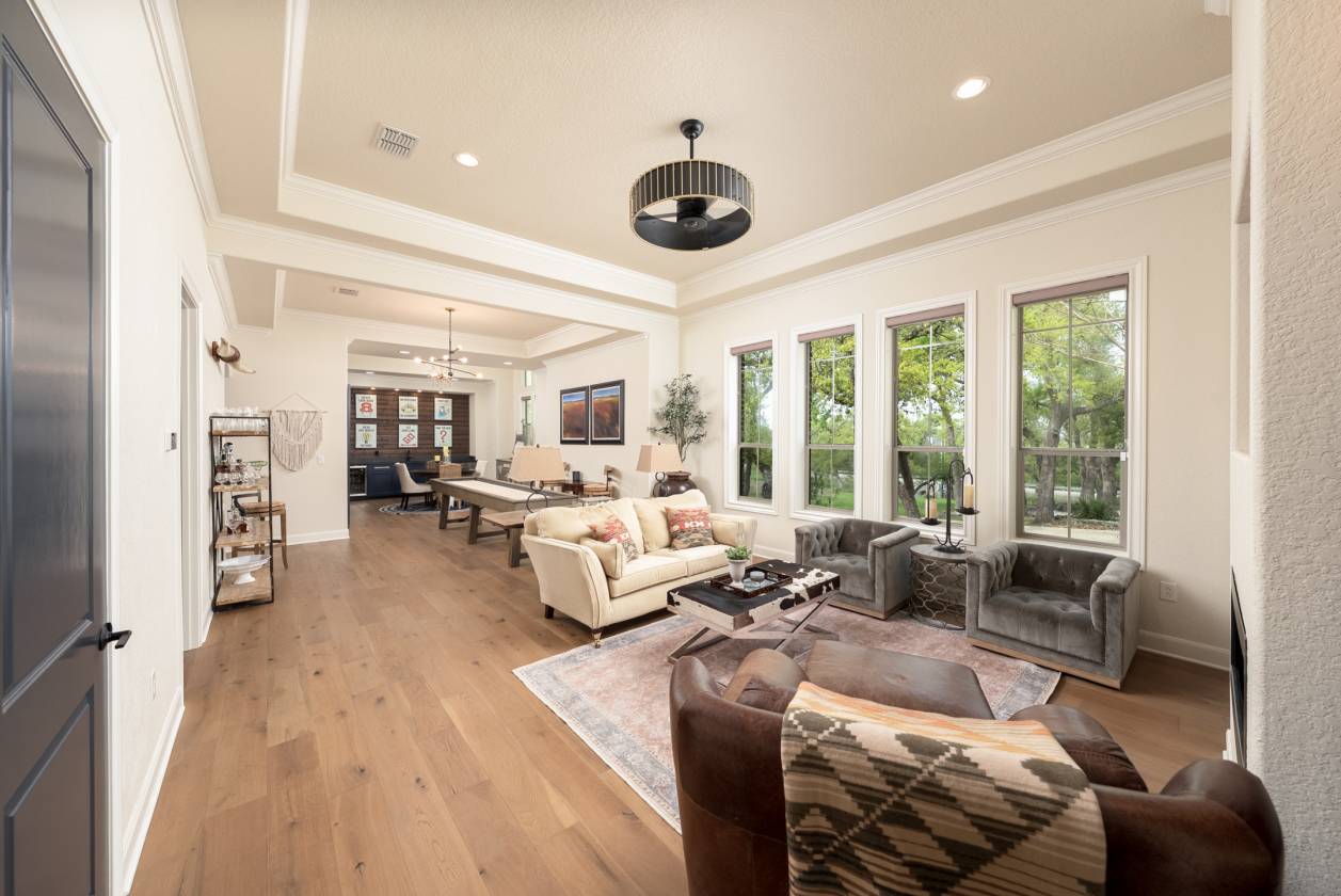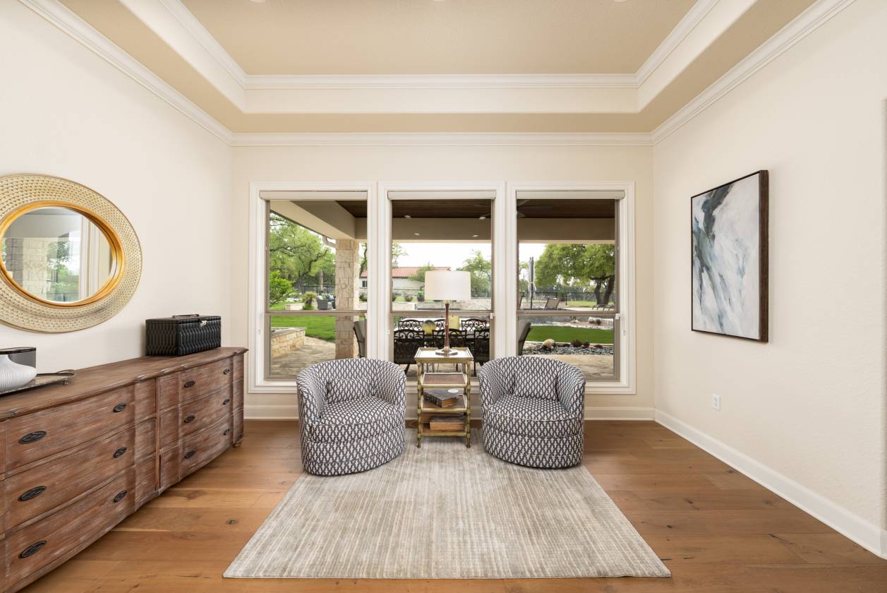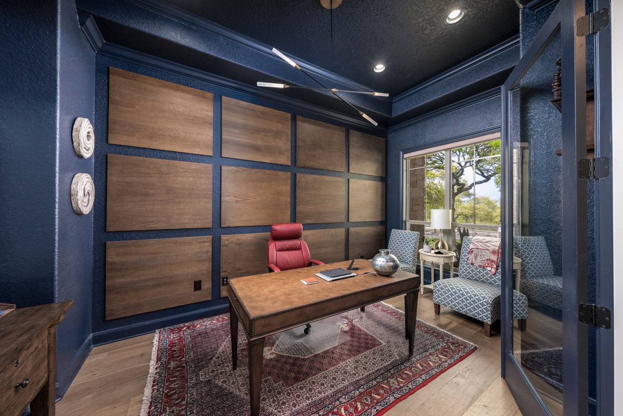 - At the heart of the home is a gourmet kitchen, perfect for both the passionate chef and the avid entertainer. The kitchen features WiFi-enabled Thermador appliances, including a 48" gas range, dual ovens, and a built-in espresso machine. The 7' tall wine fridge is flanked by full-sized Thermador custom paneled refrigerator and freezer units. The massive quartz-topped center island is an ideal gathering place, while the walk-in pantry ensures there's ample space to organize your ingredients in style. Additionally, the reverse osmosis water filtration system ensures only the purest water for both cooking and drinking. The primary suite offers a serene retreat, designed for ultimate relaxation and comfort. This expansive space features private access to the outdoors, while the spa-inspired primary bath is a masterpiece, with waterfall marble vanity, a freestanding soaking tub, and an intricately tiled walk-in shower. The suite also includes dual walk-in closets, providing ample space for organization, and a convenient secondary laundry area that is accessible directly through the closet, making laundry day a breeze. Every detail in the suite was carefully crafted for luxury and functionality. Each of the secondary bedrooms has its own en-suite bath with luxury finishes and walk-in closets, while two half-baths cater to guests. The game room and bar area, complete with a cozy fireplace and wet bar, leads to a pre-wired media room-perfect for movie nights or a cozy retreat. The impeccably designed office, located at the front of the home, is spacious and exudes an elegant masculine charm, featuring rich wood trim on the walls.
