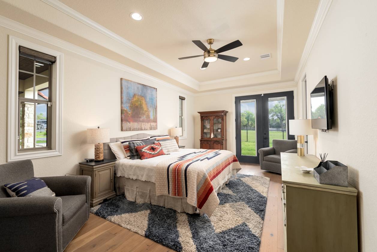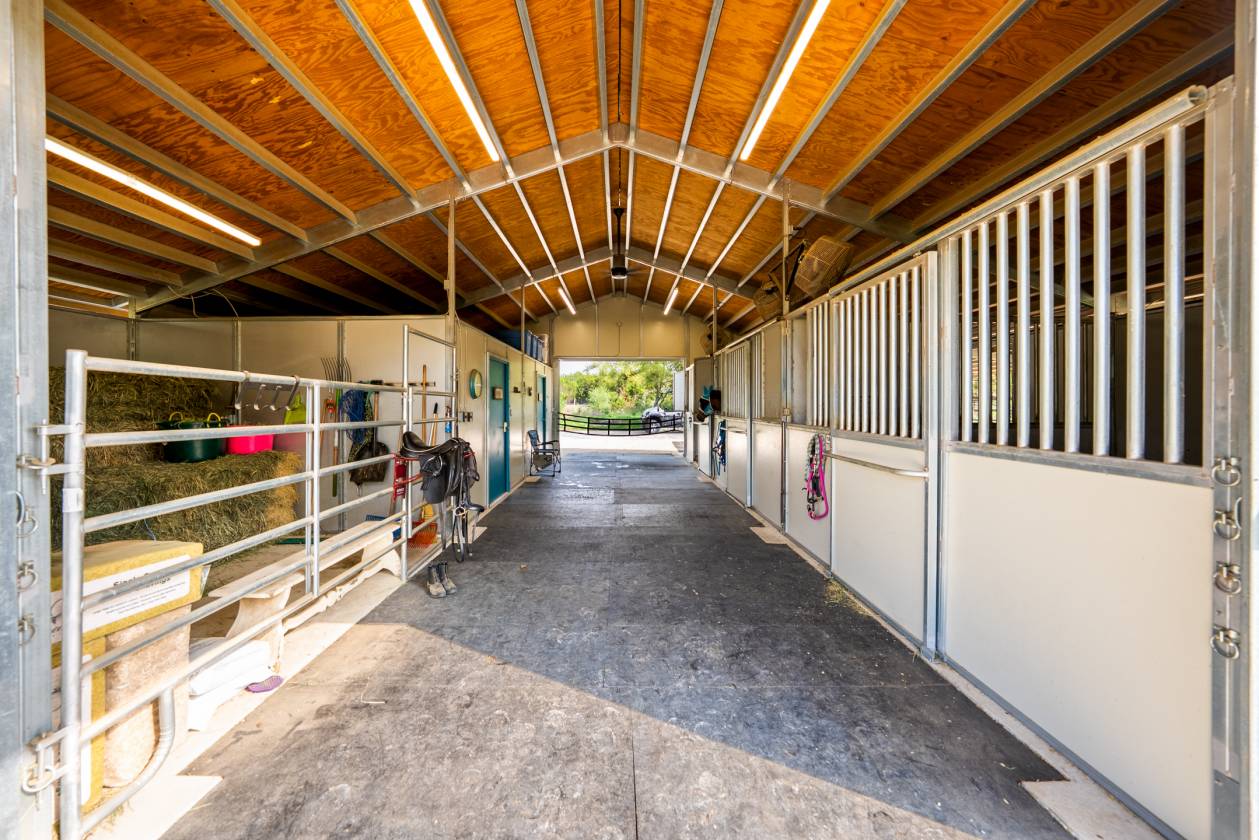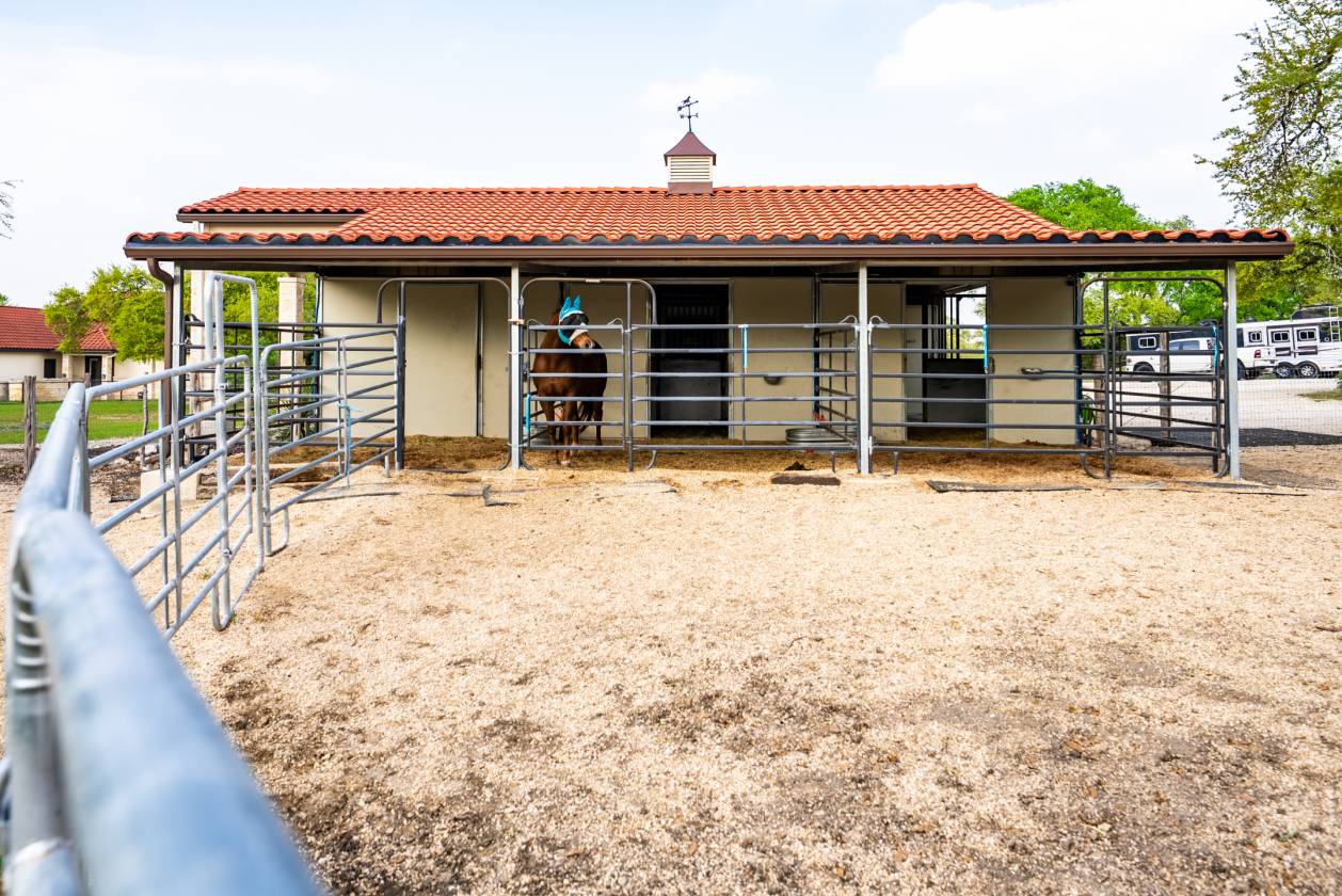 - For equestrian enthusiasts, the 3-horse barn offers a climate-controlled tack room and feed room as well as 12x12 hay storage, with automatic waterers in each stall. The property is fenced and cross-fenced with King Ranch-style fencing, creating four zones for horses. The 70x120 ft arena, featuring Trutex and sand footing, ensures optimal training conditions. With a cement tile roof and stucco exterior, the barn is as durable and luxurious as the home itself. The driveway to the barn is chip-sealed and large enough for large trailers and deliveries to easily turn around. This property offers a rare combination of luxury, privacy, and equestrian functionality, making it the ultimate destination for those seeking the finest in Texas living.