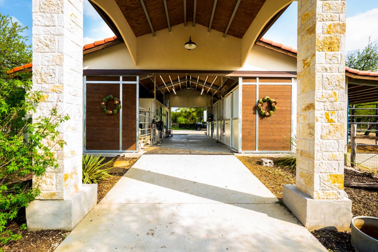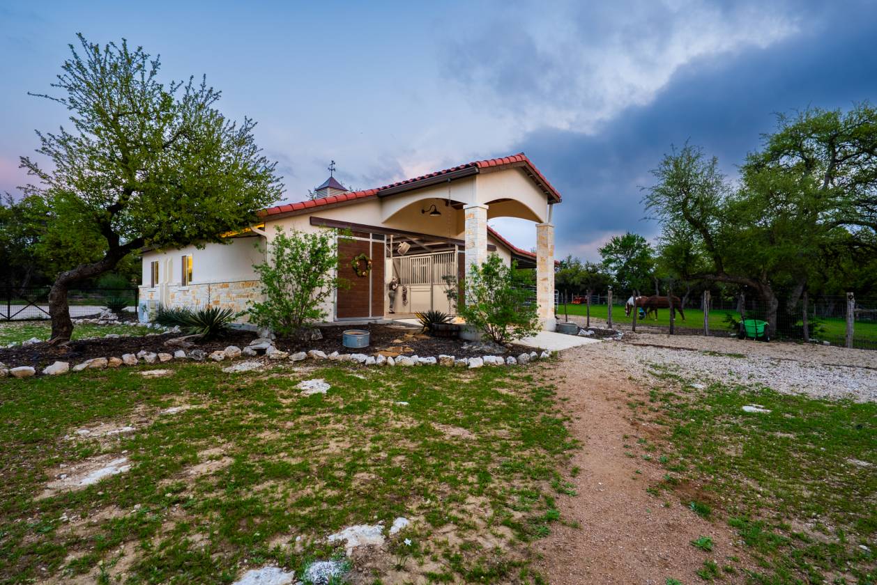 Presenting an exceptional LUXURY EQUESTRIAN ESTATE - this private retreat seamlessly blends incredible horse facilities with refined living, offering a perfect balance of tranquility and sophisticated lifestyle. Set on 5 thoughtfully designed acres, this 5,287 sq ft single-story residence is a true designer's masterpiece, showcasing Spanish flair with Texas Hill Country charm. For equestrian enthusiasts, the 3-horse barn offers a climate-controlled tack room and feed room as well as 12x12 hay storage, with automatic waterers in each stall. The property is fenced and cross-fenced with King Ranch-style fencing, creating four zones for horses. The 70x120 ft arena, featuring Trutex and sand footing, ensures optimal training conditions. With a cement tile roof and stucco exterior, the barn is as durable and luxurious as the home itself. The driveway to the barn is chip-sealed and large enough for large trailers and deliveries to easily turn around. This property offers a rare combination of luxury, privacy, and equestrian functionality, making it the ultimate destination for those seeking the finest in Texas living. The home offers an open-concept layout with high-end finishes throughout, including beautiful stone and trending hardwood floors that complement the stunning interior. This estate is located in the highly sought-after Waggener Ranch community, which spans 850 pristine acres and is home to over 200 exotic animals. At the heart of the home is a gourmet kitchen, perfect for both the passionate chef and the avid entertainer. The kitchen features WiFi-enabled Thermador appliances, including a 48" gas range, dual ovens, and a built-in espresso machine. The 7' tall wine fridge is flanked by full-sized Thermador custom paneled refrigerator and freezer units. The massive quartz-topped center island is an ideal gathering place, while the walk-in pantry ensures there's ample space to organize your ingredients in style. Additionally, the reverse osmosis water filtration system ensures only the purest water for both cooking and drinking. The primary suite offers a serene retreat, designed for ultimate relaxation and comfort. This expansive space features private access to the outdoors, while the spa-inspired primary bath is a masterpiece, with waterfall marble vanity, a freestanding soaking tub, and an intricately tiled walk-in shower. The suite also includes dual walk-in closets, providing ample space for organization, and a convenient secondary laundry area that is accessible directly through the closet, making laundry day a breeze. Every detail in the suite was carefully crafted for luxury and functionality. Each of the secondary bedrooms has its own en-suite bath with luxury finishes and walk-in closets, while two half-baths cater to guests. The game room and bar area, complete with a cozy fireplace and wet bar, leads to a pre-wired media room-perfect for movie nights or a cozy retreat. The impeccably designed office, located at the front of the home, is spacious and exudes an elegant masculine charm, featuring rich wood trim on the walls. Step outside to enjoy the Hill Country views from the expansive back patio, which leads to a two-story observation deck. The home's outdoor living space also features a brand-new pool with a jacuzzi and fire feature, crafted by Texas' top pool builders Infinity Pools and comes with a five-year transferable warranty. This exceptional estate is designed for ultimate efficiency, featuring a Daikin commercial HVAC system (three units, two years old), blown foam insulation in the attic, and a new 900 ft deep well tapping into the Trinity Aquifer, complete with a heavy metal filter, booster pump, pressure tank, and water softener. A 2500-gallon cistern ensures ample water supply for both the home and the equestrian facilities.Whether you are a passionate equestrian or simply seeking a peaceful sanctuary with world-class amenities, this estate is truly a once-in-a-lifetime opportunity in the thriving town of New Braunfels - less than an hour commute to Austin or San Antonio! New Braunfels is on the top 100 towns to live in the US year over year.