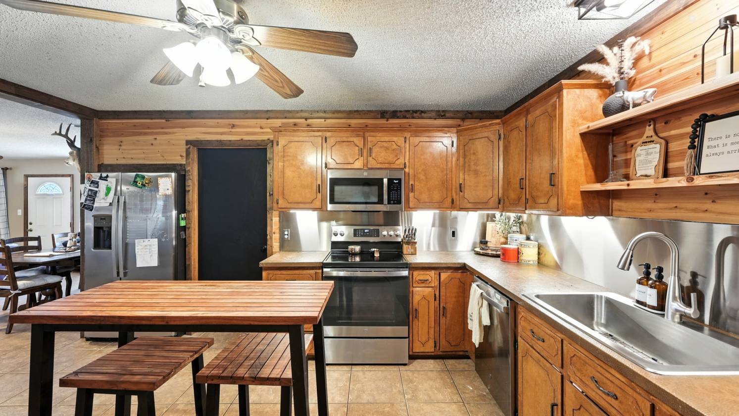 - The 2,100 sq. ft. home features 3 bedrooms, 2 bathrooms, and a versatile bonus room currently serving as an office. The open-concept living and kitchen area is ideal for entertaining family and friends. Completely remodeled in 2024, the kitchen showcases custom hammered copper countertops, a stainless-steel backsplash, oversized walk-in pantry, and upgraded finishes that add warmth and elegance. A spacious 240 sq. ft. mudroom/utility/workout room provides extra convenience and keeps clutter out of the main living spaces. Step outside to enjoy Texas sunsets, plenty of parking, and a 20' x 24' carport—perfect for gatherings or quiet evenings at home.