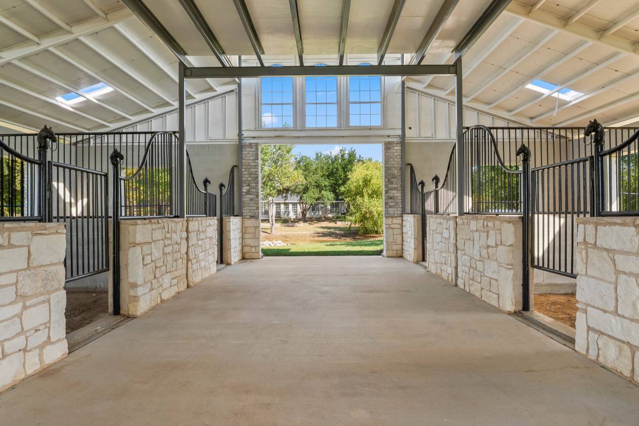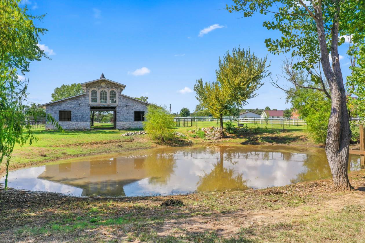 - Property can accommodate 5 horses comfortably and the Stable with 5 beautiful 14x14 birthing stalls, tack room, wash room, storage loft and ground level inside area for hay bales and mower. Built on solid Steel frame with deep foundation, masonry block, stone and brick face and custom made stall fronts. Fully fenced property w pipe & cable made for horses. Pretty Pond plus a 120+ ft deep irrigation well too!