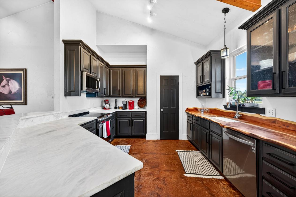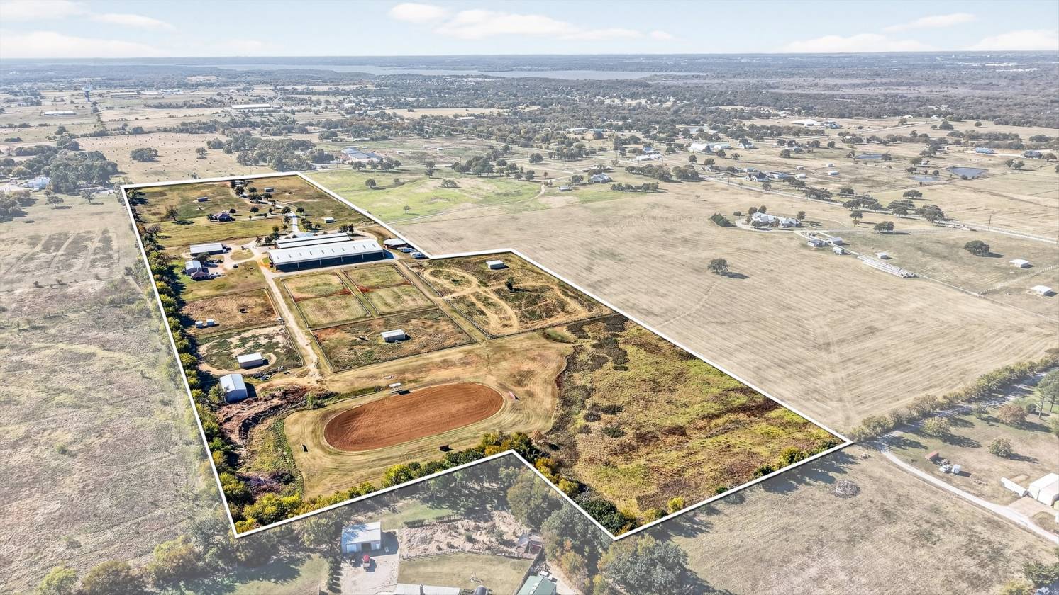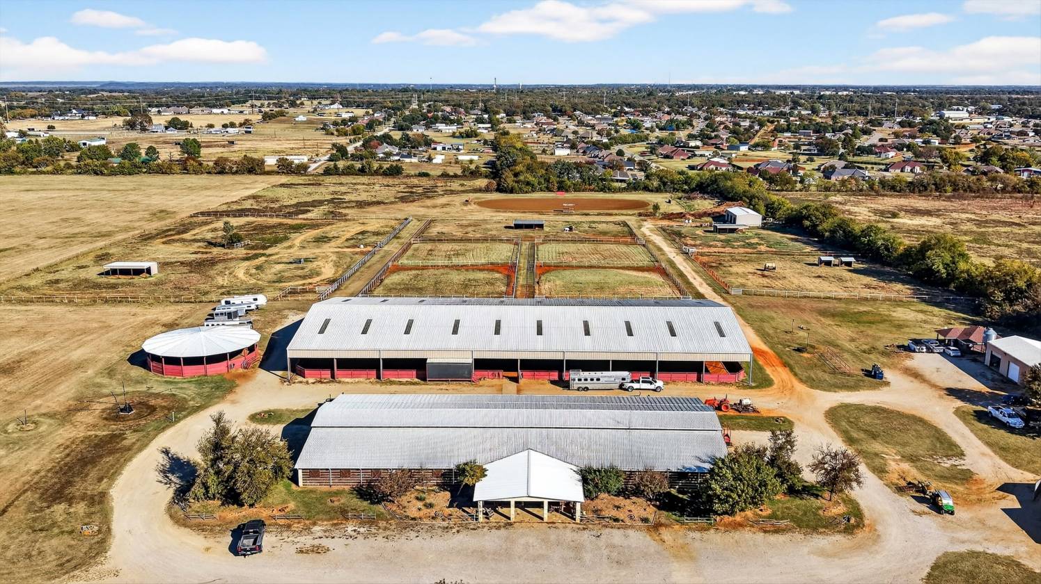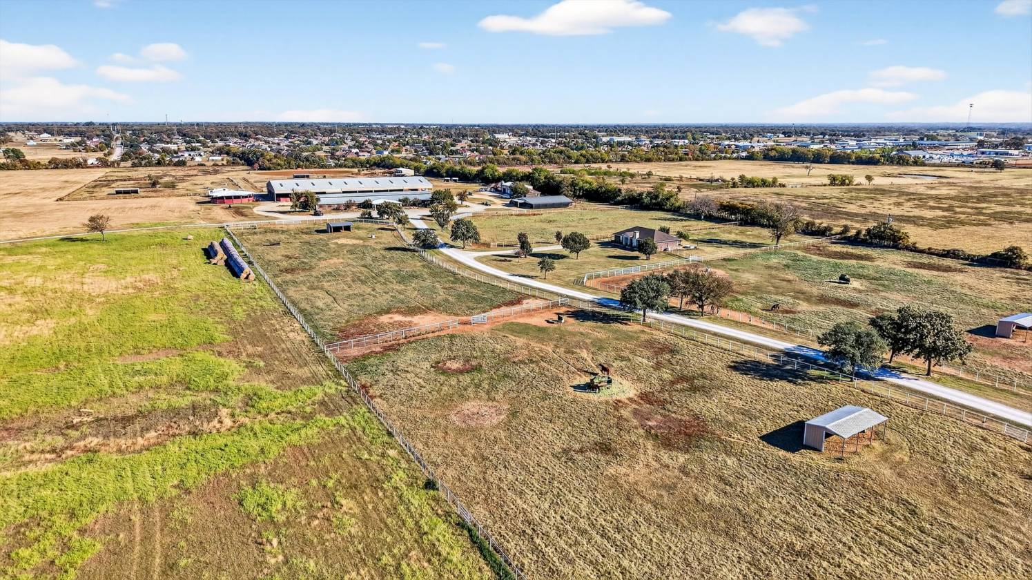 MLS #21100892 A rare opportunity to own 38.14 acres with a fully turnkey, premier equestrian facility positioned in the heart of Denton County's high-growth corridor. This expansive property is an exceptional home for serious horse owners and a strategic land investment with unparalleled commercial potential. Located just one mile from Highway 377 and minutes from Highway 380, this ranch offers the perfect convergence of seclusion, world-class amenities, and immediate access to the entire DFW metroplex. This property sets a new standard for equine care and professional training, capable of supporting a major show operation or functioning as a magnificent private estate. Show Barn 42 Stalls of Luxury: An impressive, insulated show barn with 12'x12' stalls fully equipped with mounted fans, automatic waters, and corner feeders. 5 wash racks ensure rapid, high-volume care. The barn features modern LED lighting and two restrooms, one with a washer and dryer hookup. A dedicated, rustic-chic Entertainment Lounge. Two large 12'x24' tack rooms. 125’ x 250’ indoor arena with high-quality LED lighting. A 12 or 24-stall Mare Motel or Overflow Barn. A 60-foot covered round pen and a large 120’ x 260’ outdoor riding track are ready for any discipline. The grounds features pipe-fenced turnout pastures with shelters. Two large 30’ x 60’ three-bay buildings provide essential hay and equipment storage. Main Home (1,952 SF): The 3-bedroom, 2-bathroom. Guest or Staff Housing: Two identical, independent 704 SF guest houses, 2-bedrooms, 1-Bath. This is a unique opportunity to secure an established, income-producing ranch while simultaneously holding a prime, strategic land asset in a high-demand North Texas growth market. Do not miss this chance to acquire a legacy property with massive future upside Please refer to Supplement Sheet on Ranch for greater detail of Amenities
