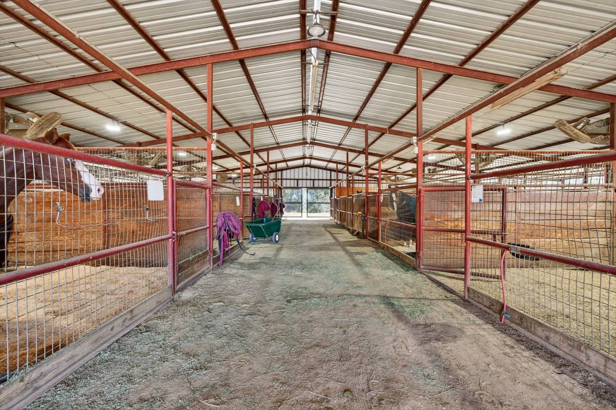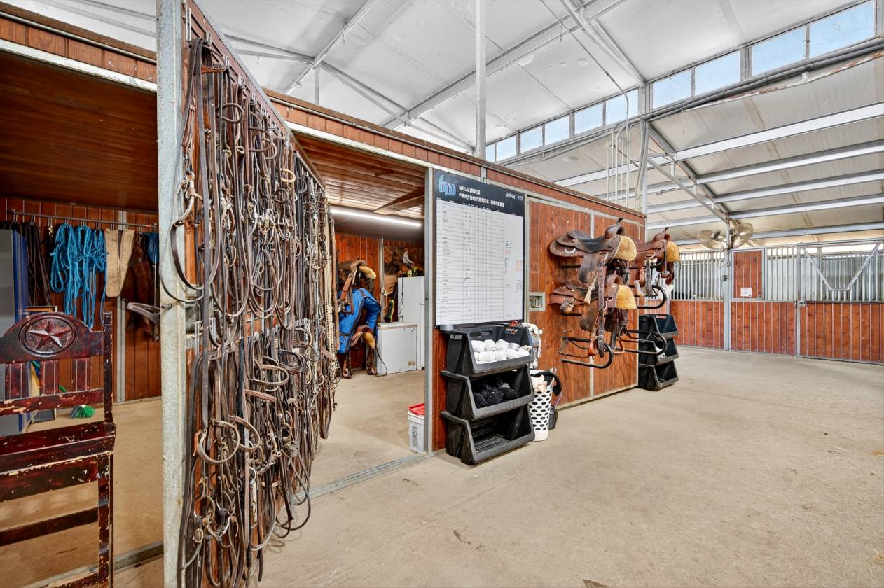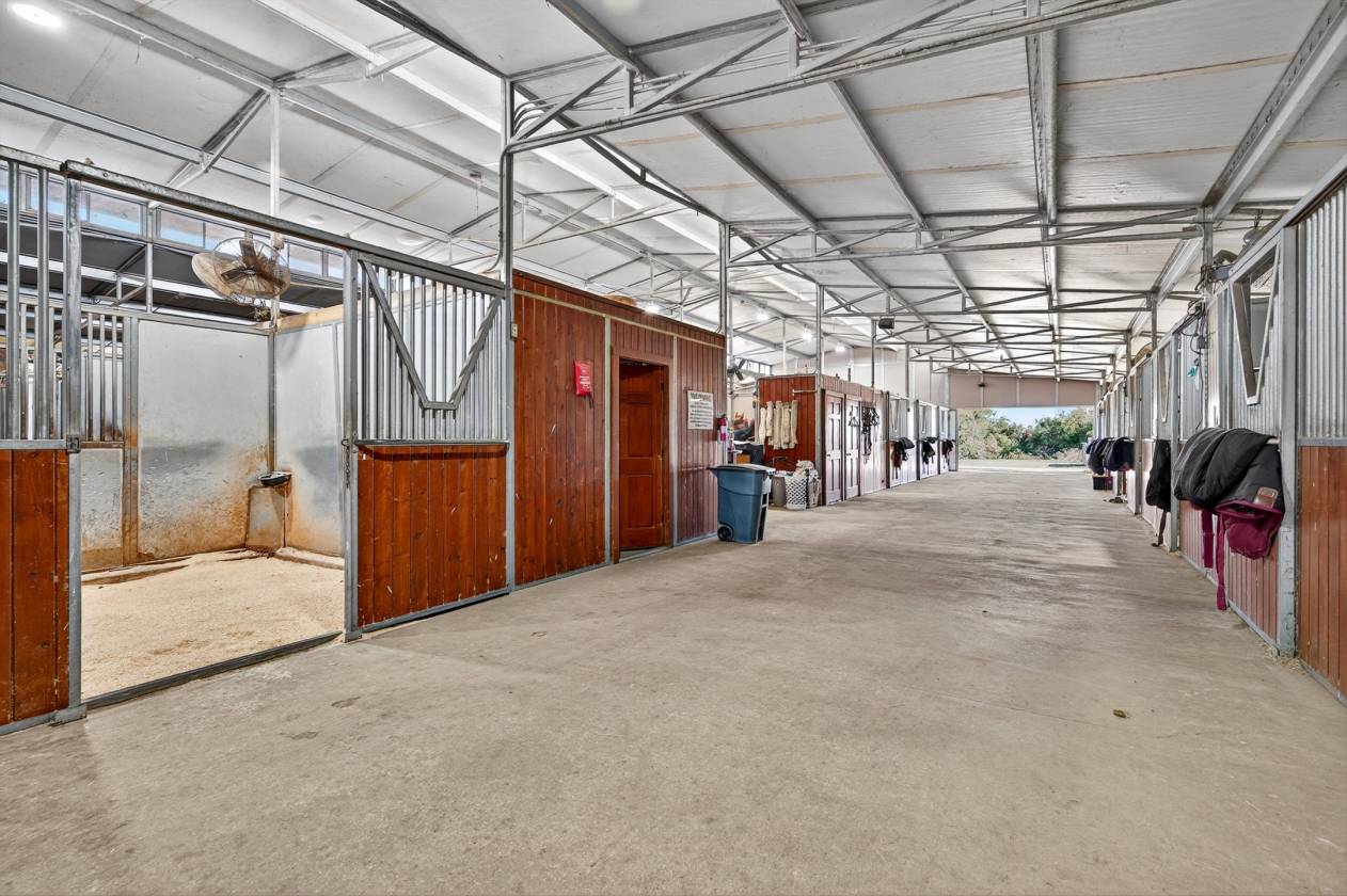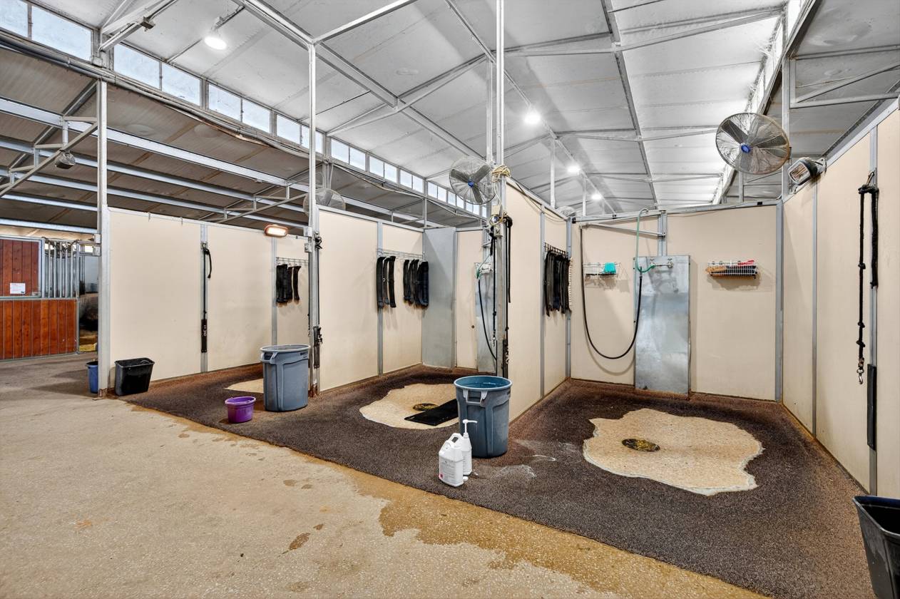 - The centerpiece of this ranch is the impressive 42-stall show barn. Each of the 12x12 stalls is fully equipped with mounted fans, automatic waters, and corner feeders, ensuring the comfort and care of every horse. The barn is built for efficiency with two 16-foot main aisles, two wash racks on the east end, and three on the west end. The entire barn is insulated and features modern LED lighting. For convenience, there are two restrooms, one with a washer and dryer hookup.