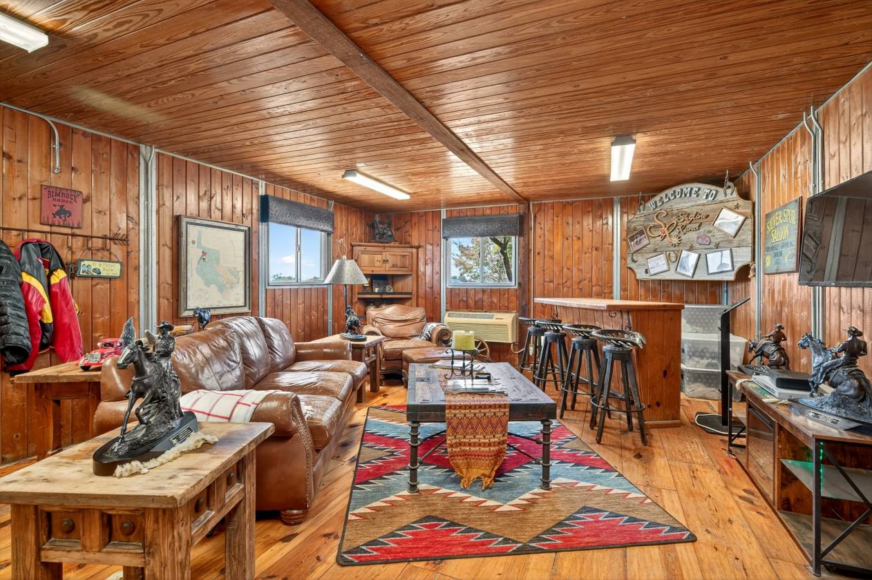 - This isn't just a barn; it's a luxurious space for horse owners. It includes two 12x24 tack rooms, a 4x12 storage room, and a stylish office with a lounge. The entertainment lounge offers a rustic vibe with hand-scrapped hardwood floors, a built-in trophy case, and a wall-mounted AC unit. The dedicated office space provides a quiet and private area for managing the ranch and entertainment area.