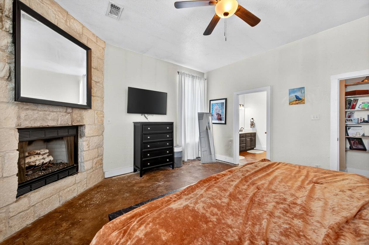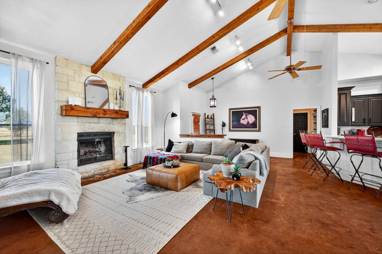 - The property includes a comfortable 1,952-square-foot main home built in 2001. This home features 3 bedrooms and 2 bathrooms, a large 27x16-foot living room with a cozy wood-burning fireplace, and a kitchen with granite countertops, a butcher block, and LG appliances. The primary bedroom also includes its own fireplace.