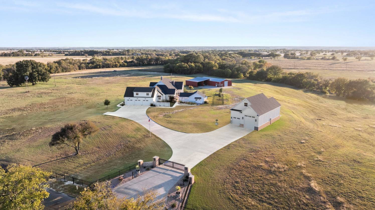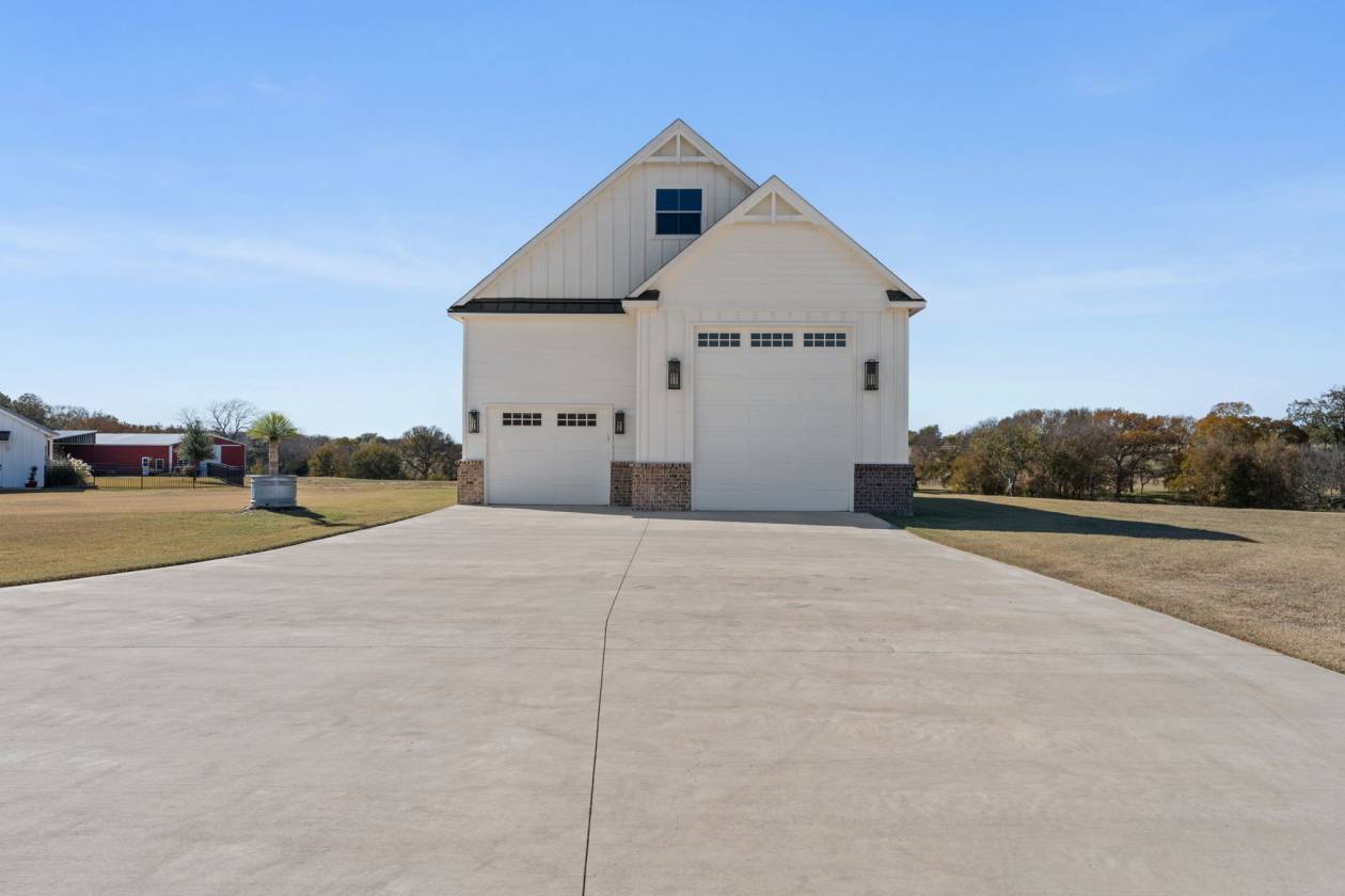 Experience resort-level comfort and refined rural living across 46 picturesque acres featuring a creek flowing through, multiple gated entrances, and generous road frontage offering privacy, presence, and the potential for a future family compound with an additional dedicated water meter on the back portion of the property. This custom-built 4,110-sq-ft residence features four bedrooms and four full plus two half baths, including two primary suites with fireplaces and heated bathroom floors. Elevated everyday living is reflected in every detail, vaulted ceilings, shiplap accents, three-foot-wide doorways, electric blinds, custom shutters, spray-foam insulation, dual tankless water heaters, and a whole-home generator. The chef's kitchen is equipped with Sub-Zero and Wolf appliances, an oversized island, and a spacious walk-in pantry with a second refrigerator and dedicated ice maker. A private office with an exterior entrance makes working from home effortless, while the loft-level retreat includes custom bunk alcoves perfect for guests. Outdoor living centers around a resort-style pool with chiller and jetted lounge area, a pool house and bathroom, and a fully equipped covered outdoor kitchen designed for seamless entertaining. A climate-controlled motorcoach garage with septic hookups and laundry, plus extensive barn and storage facilities, complete this rare offering a property where refined style meets authentic Texas functionality. Neighboring 95 acres available too! Combine for 141 acres of continuous land plus 624 more acres across Higgins Rd stretching all the way to FM 876.