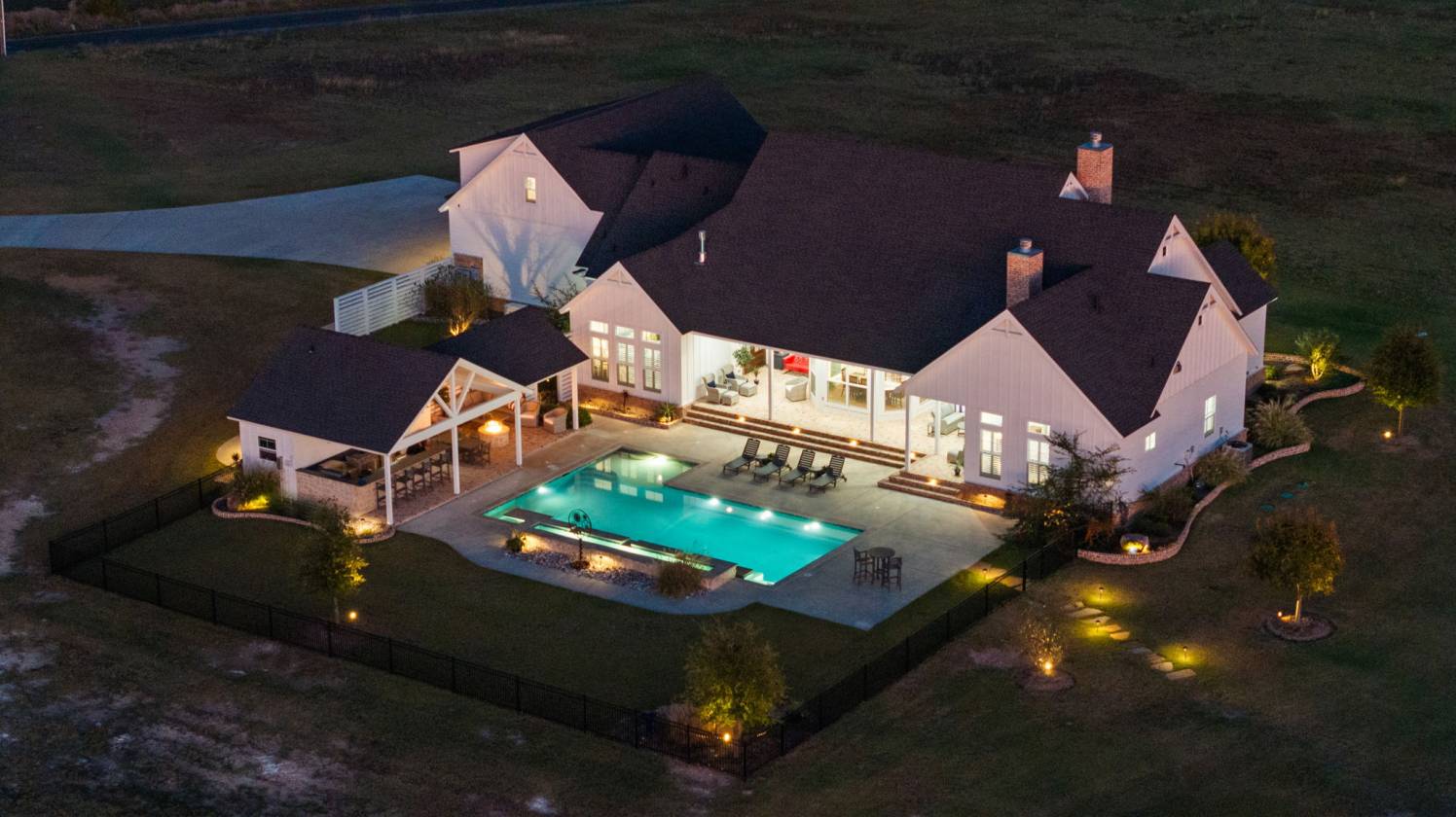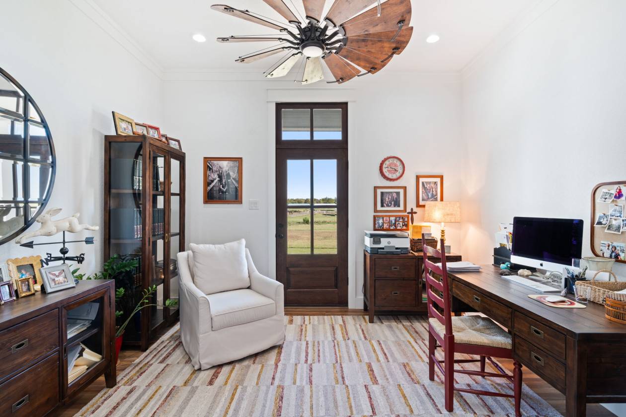 Experience resort-level comfort and refined rural living across 46 picturesque acres featuring a creek flowing through, multiple gated entrances, and generous road frontage offering privacy, presence, and the potential for a future family compound with an additional dedicated water meter on the back portion of the property. This custom-built 4,110-sq-ft residence features four bedrooms and four full plus two half baths, including two primary suites with fireplaces and heated bathroom floors. Elevated everyday living is reflected in every detail, vaulted ceilings, shiplap accents, three-foot-wide doorways, electric blinds, custom shutters, spray-foam insulation, dual tankless water heaters, and a whole-home generator. The chef's kitchen is equipped with Sub-Zero and Wolf appliances, an oversized island, and a spacious walk-in pantry with a second refrigerator and dedicated ice maker. A private office with an exterior entrance makes working from home effortless, while the loft-level retreat includes custom bunk alcoves perfect for guests. Outdoor living centers around a resort-style pool with chiller and jetted lounge area, a pool house and bathroom, and a fully equipped covered outdoor kitchen designed for seamless entertaining. A climate-controlled motorcoach garage with septic hookups and laundry, plus extensive barn and storage facilities, complete this rare offering a property where refined style meets authentic Texas functionality. Neighboring 95 acres available too! Combine for 141 acres of continuous land plus 624 more acres across Higgins Rd stretching all the way to FM 876.