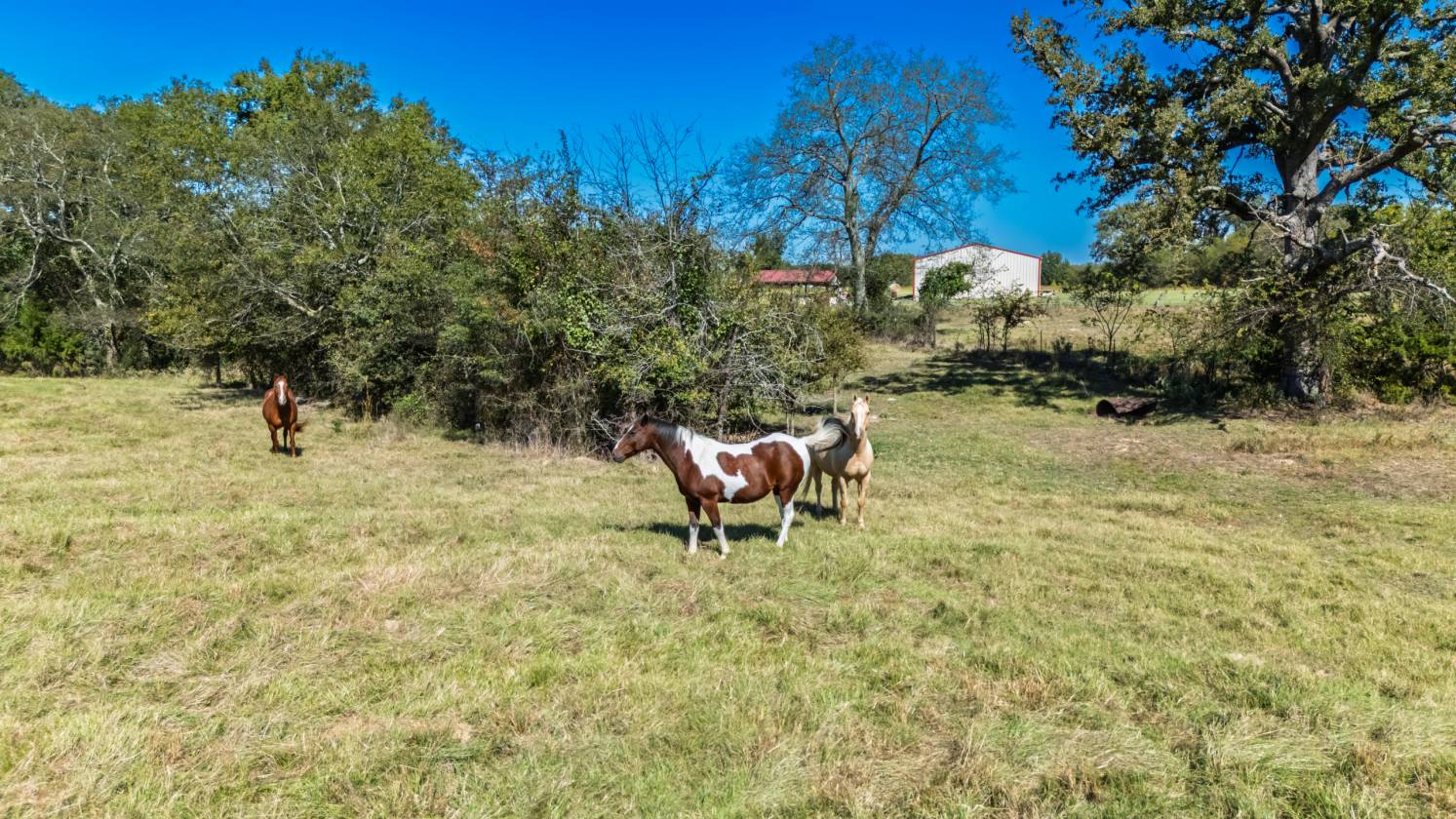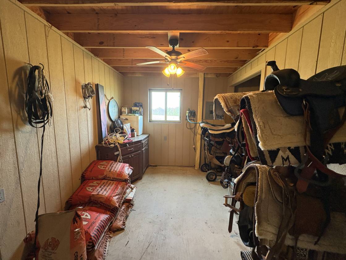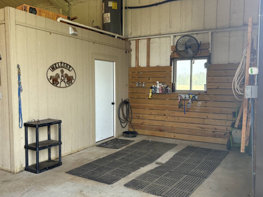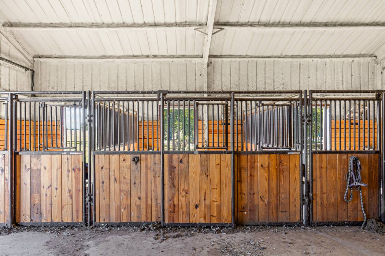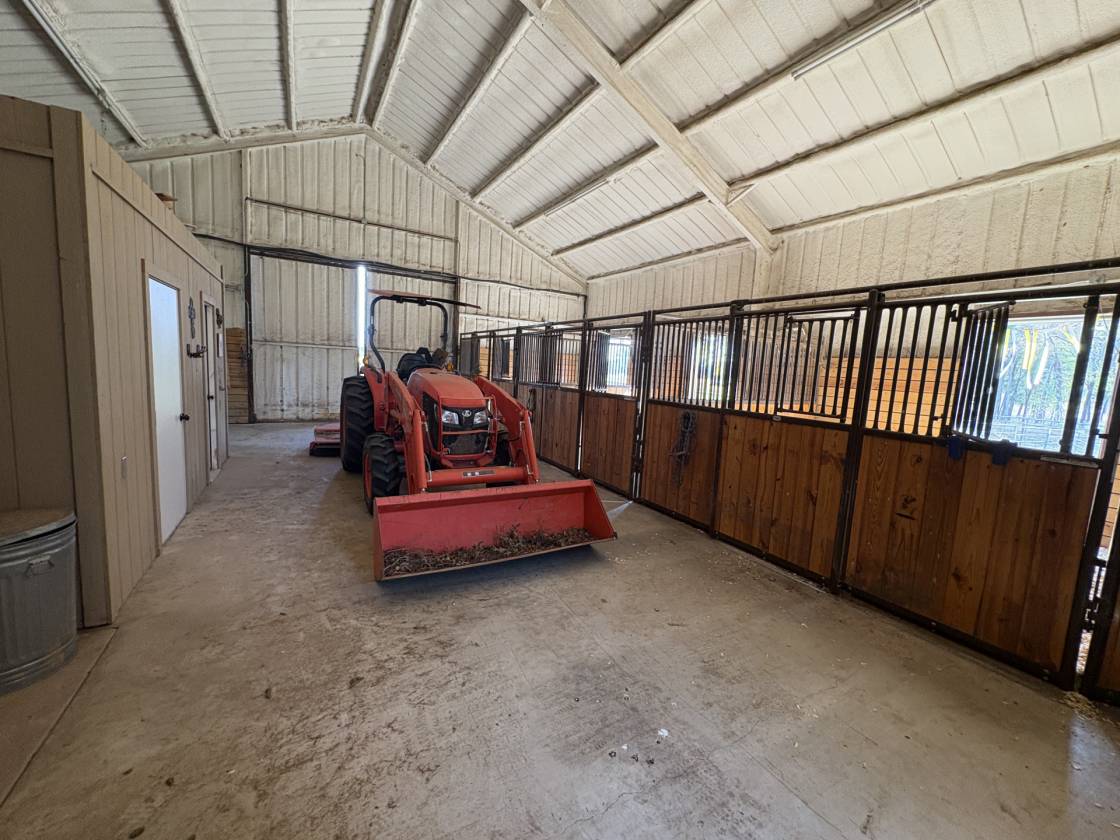 - Custom built horse stable featuring 3 Priefert stalls, runs, wash rack, bathroom, tack room, feed room and grooming area.