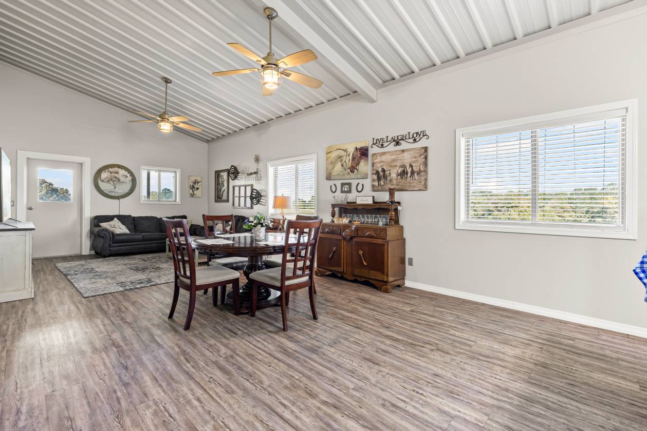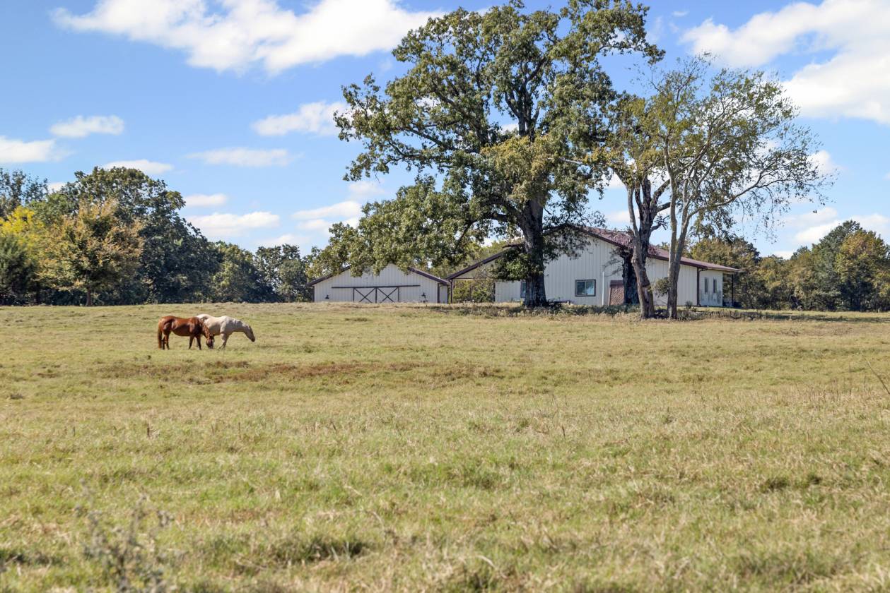 Over 70' elevation changes in this very diversified Ranch and Hunting Property and with over 228 ag exempt acres! Starting on the front of this unique property with custom *FULLY FURNISHED* BARNDO that contains very nice custom spacious living quarters and offers a bonus of 2 additional sleeping quarters with a bathroom & shower upstairs. Also, a 2nd furnished sitting area (with bar, TV & shuffleboard table) in the shop for entertaining and enjoyment, the remainder of the shop has 3-12' rollup doors and plenty of space for RV parking, equipment or great working area. There are covered porches to sit and relax looking over a 4 acre lake (covered pier) and over 50 acres of improved meadows surrounding the house with scattered Oaks and rolling hills, a 40x40 custom built horse stable with 3 priefert stalls, horse runs, wash rack, tack room and a bathroom provide a first class horse facility. There is another barn near the front that offers a place for hay and equipment storage. This area is fenced and cross fenced. The middle section of this property offers rolling hardwood, cedar and natural growth that has several scattered openings that are good for some additional grazing or the perfect place for food plots and wildlife management area. There are several seasonal natural water spots that would make some great managed duck sloughs. The back of the property is a hunters paradise with Greenwood Creek and Big Creek crossing the property and providing some of the best hunting in East Texas. This property is one that covers it all from weekend getaway, hunting property, livestock facility, corporate retreat, recreational use or the future site of that new custom home. Located only 1 mile from I30 (with good roads), only 17 miles from Sulphur Springs, 5 miles from Mt Vernon and only 90 min. from DFW area provides quick and easy access to this great retreat. Property is bordered by larger ranches to minimize the encroachment and provide privacy while hunting & enjoying The front meadow has the custom large shop with living quarters, horse stable, 4 acre lake, fenced/cross fenced and contains over 50 acres. The middle section is rolling mix of open areas and timber offering a grazing , recreation or hunting area. This area is approx. 100 acres and has RV trails throughout. The back of the property is approx. 72 acres of hardwood timber with 2 creeks crossing it and provides some great hunting and wildlife habitat.