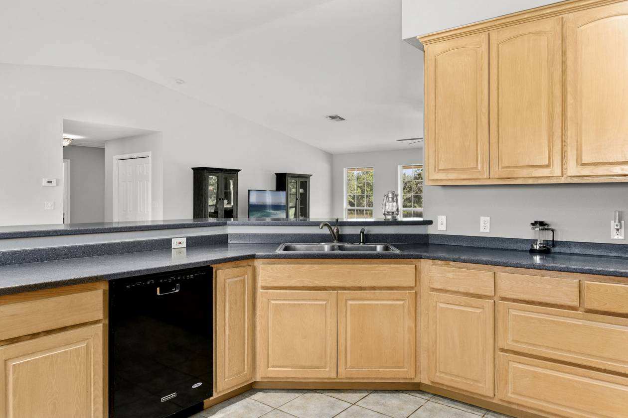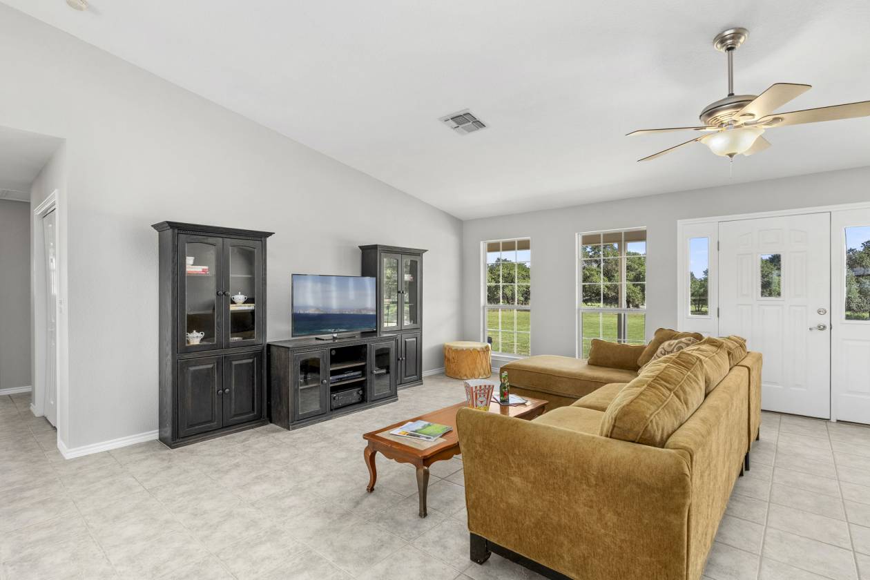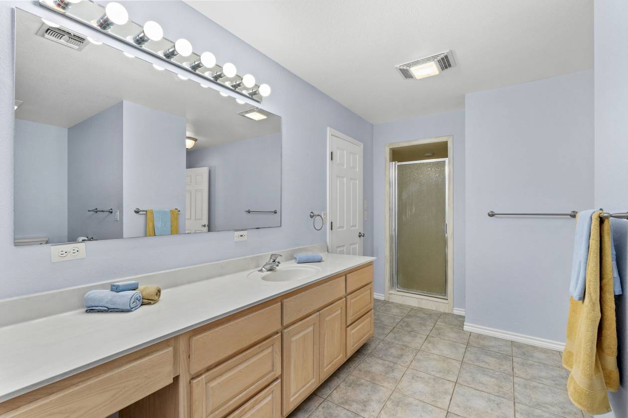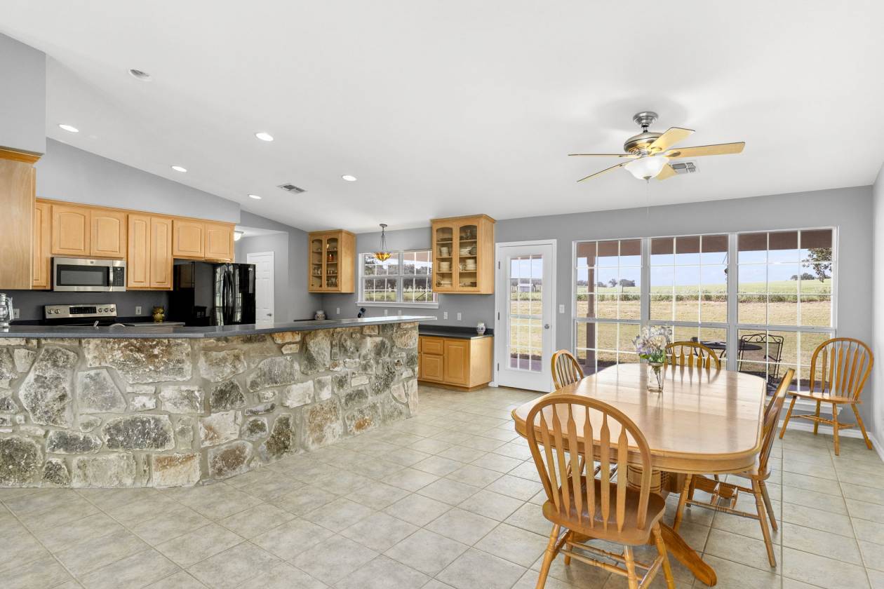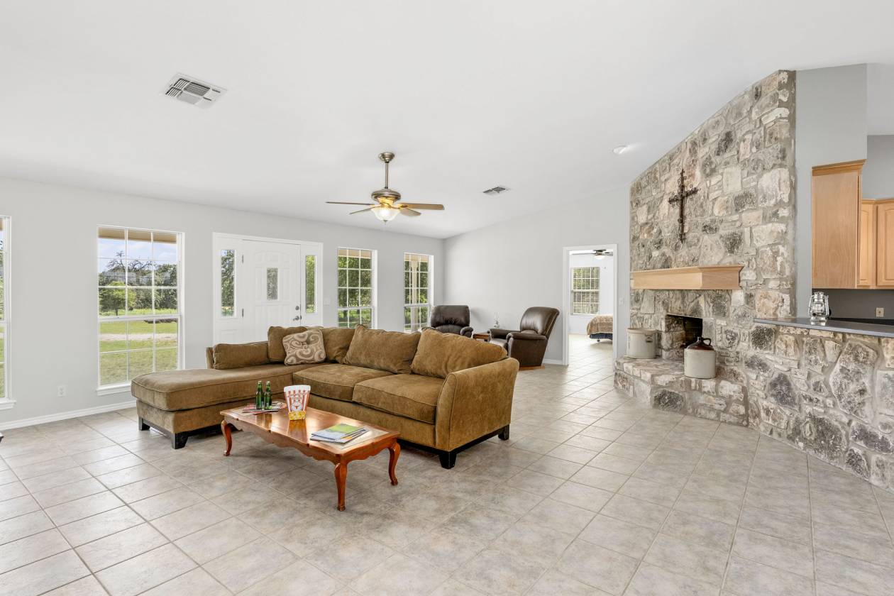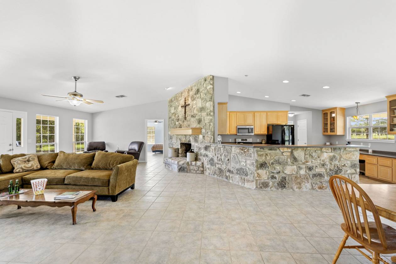 - Spacious open floor plan great for entertaining with large kitchen, and Primary bedroom/bath. Welcoming Large rock fireplace in family room. Front and back porch to enjoy watching the wildlife. Detached Garage with breezeway. Each secondary bedroom has their own ensuite vanities with sink.