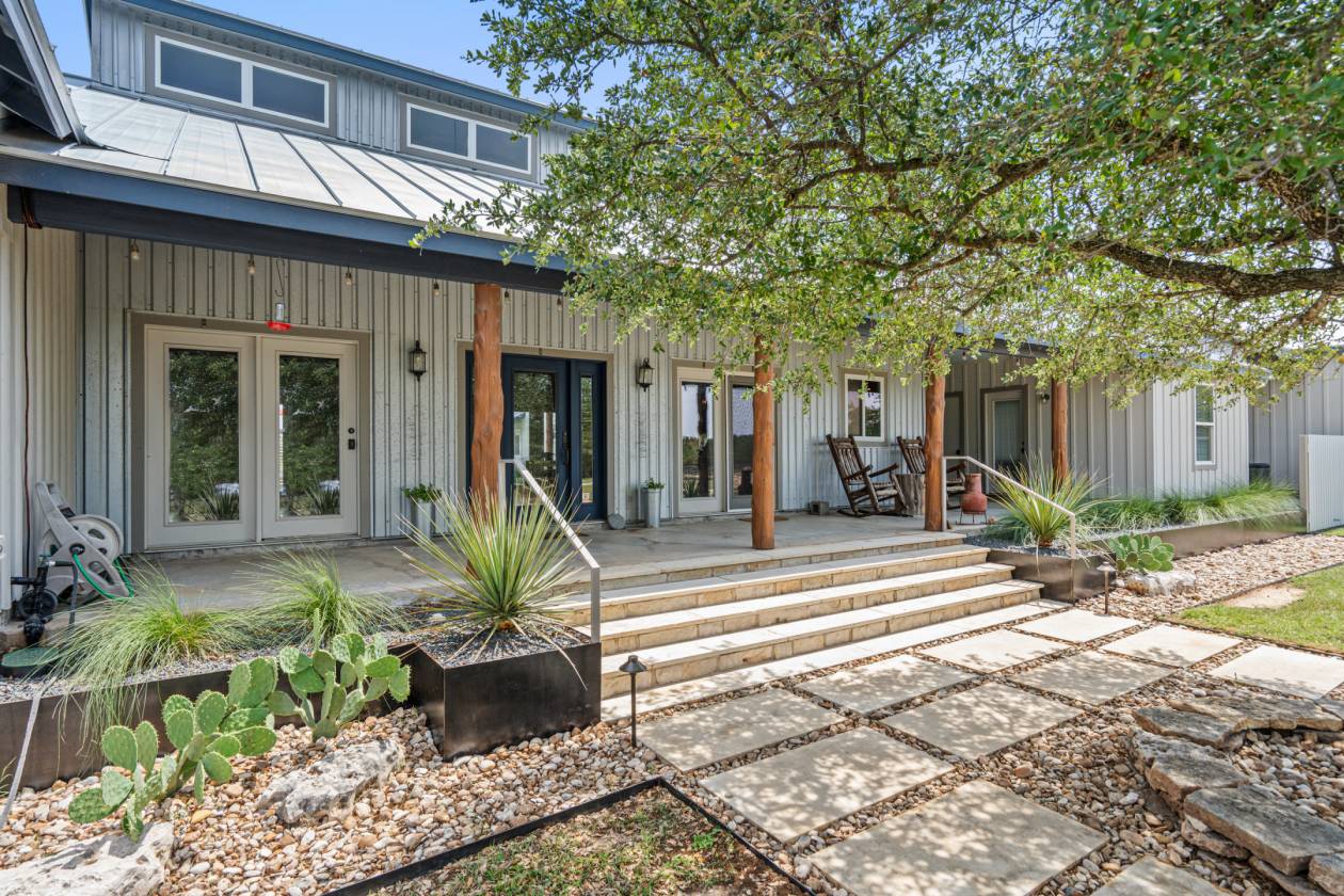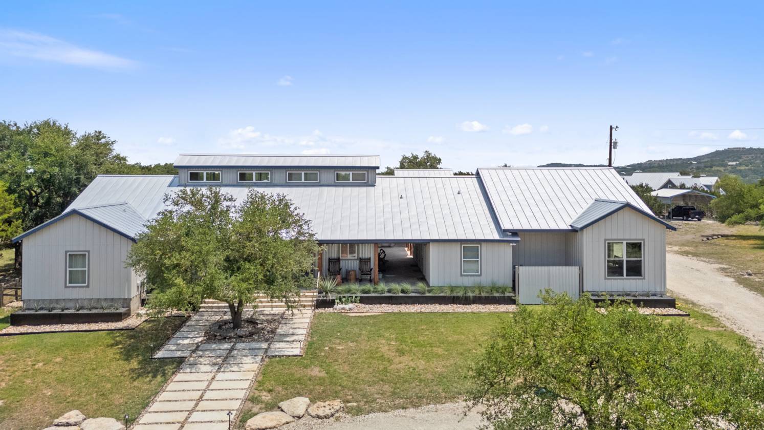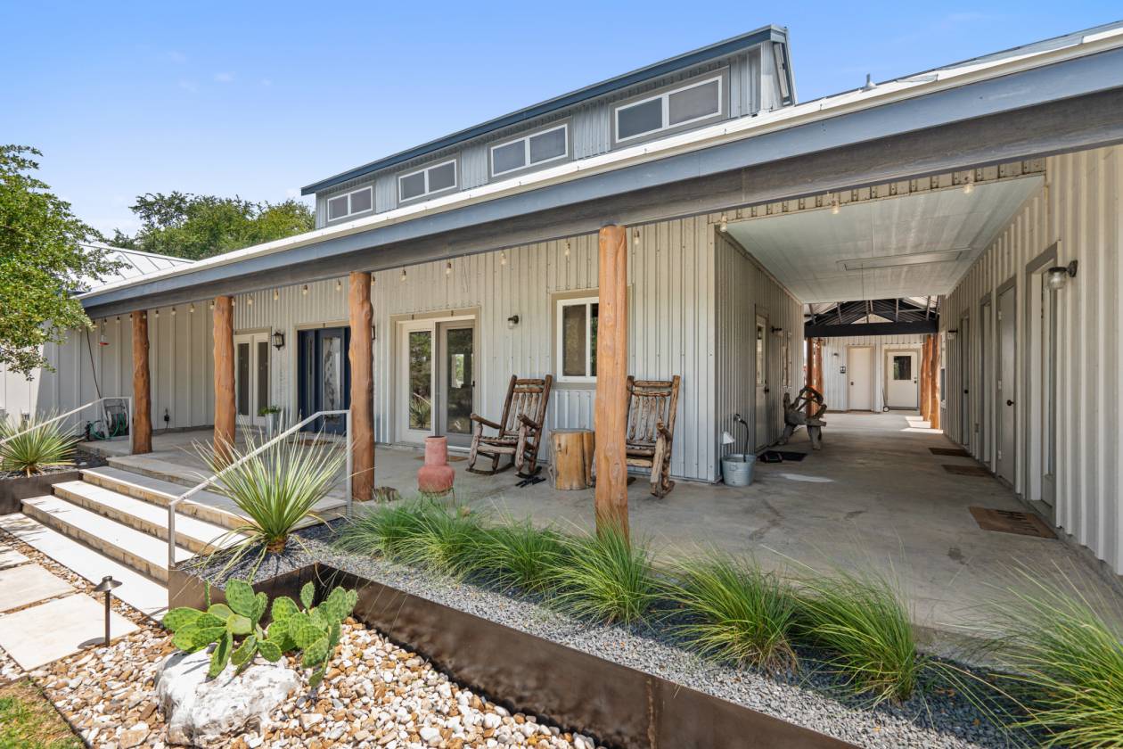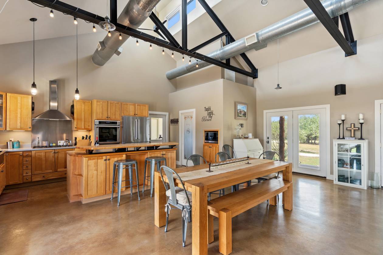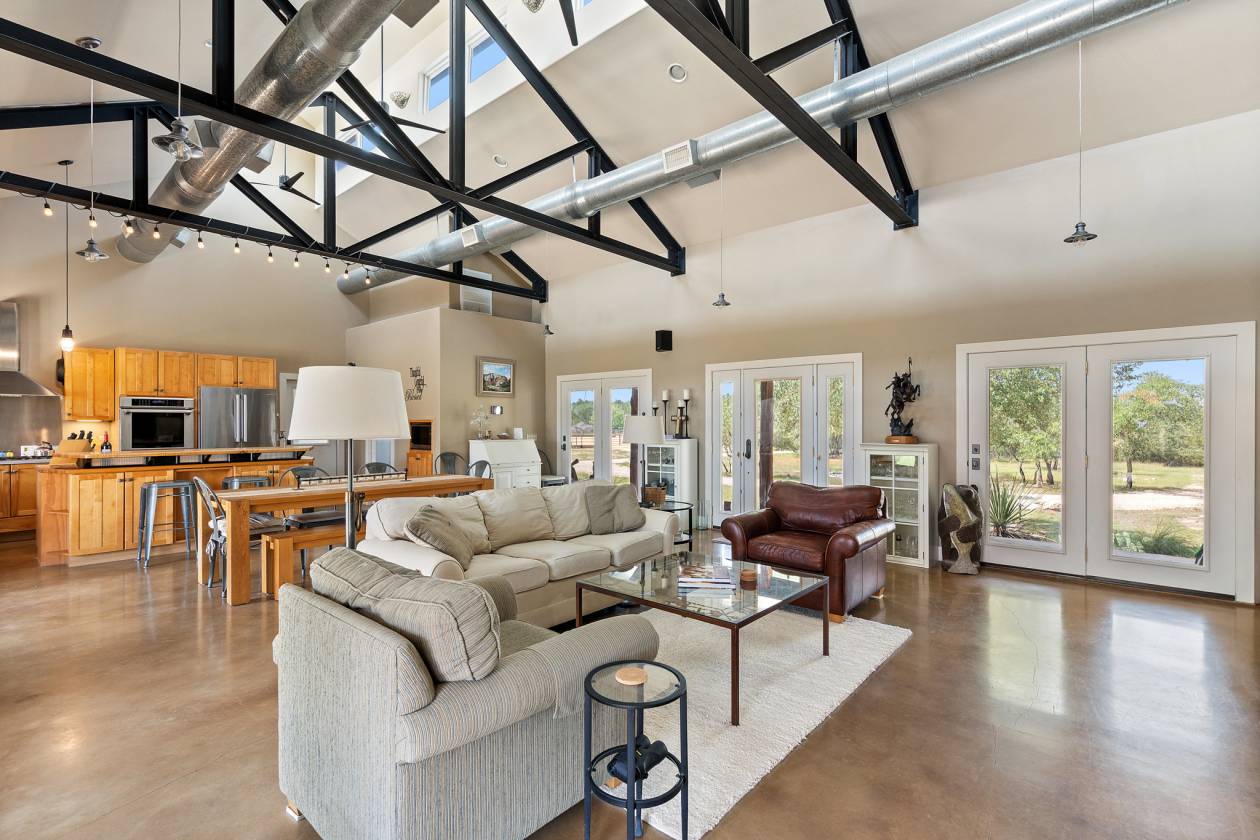 - The 2,700 sq. ft. home features an open-concept layout with tall exposed steel beam ceilings, stained concrete floors, and abundant natural light, creating an inviting Hill Country atmosphere. Glass doors along both sides of the main living area fill the interior with sunlight and connect the living and dining areas to the outdoors. The kitchen includes custom cabinetry, stainless steel appliances, a large island with breakfast bar and prep sink, and a farmhouse sink beneath a window framing a classic Texas view!