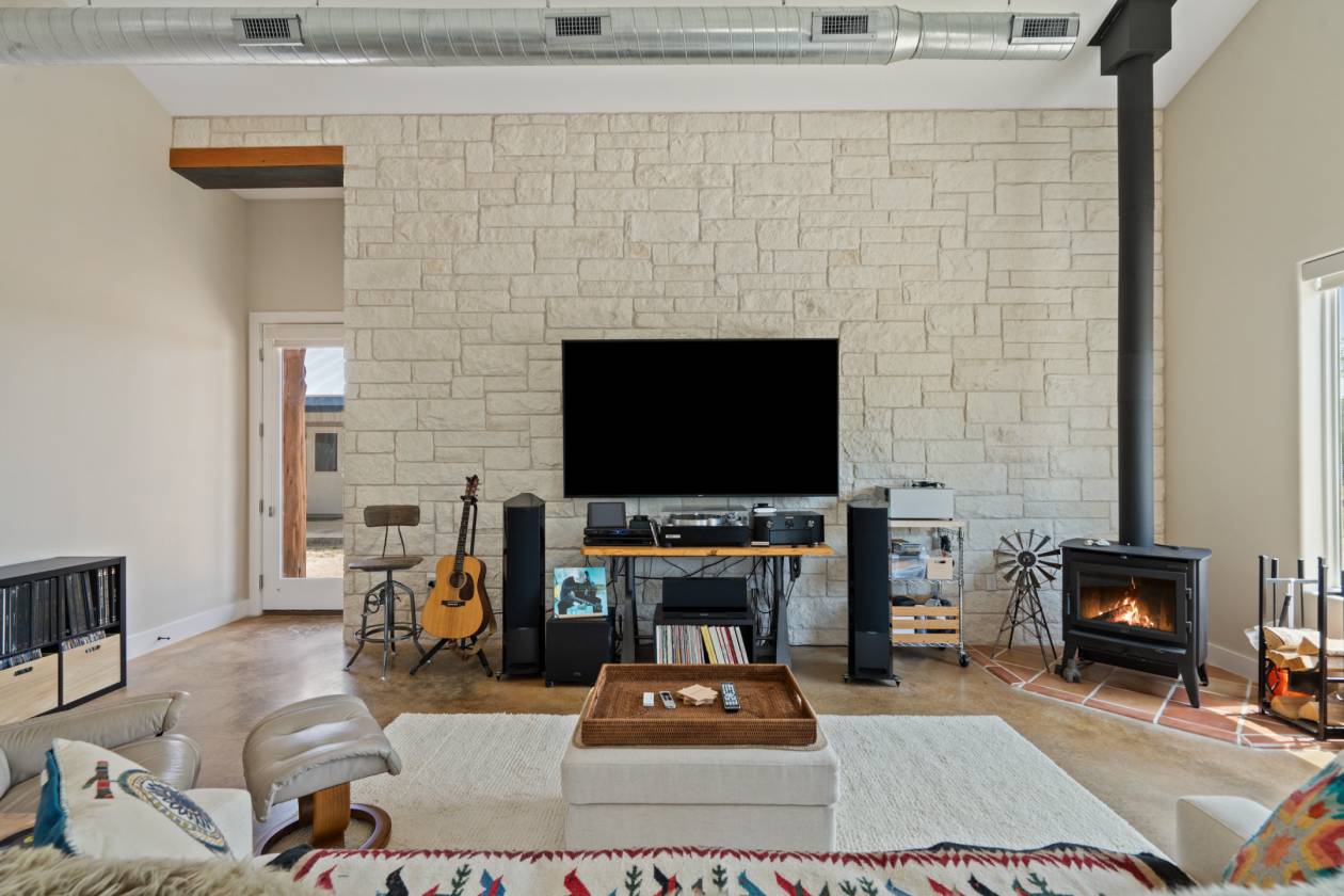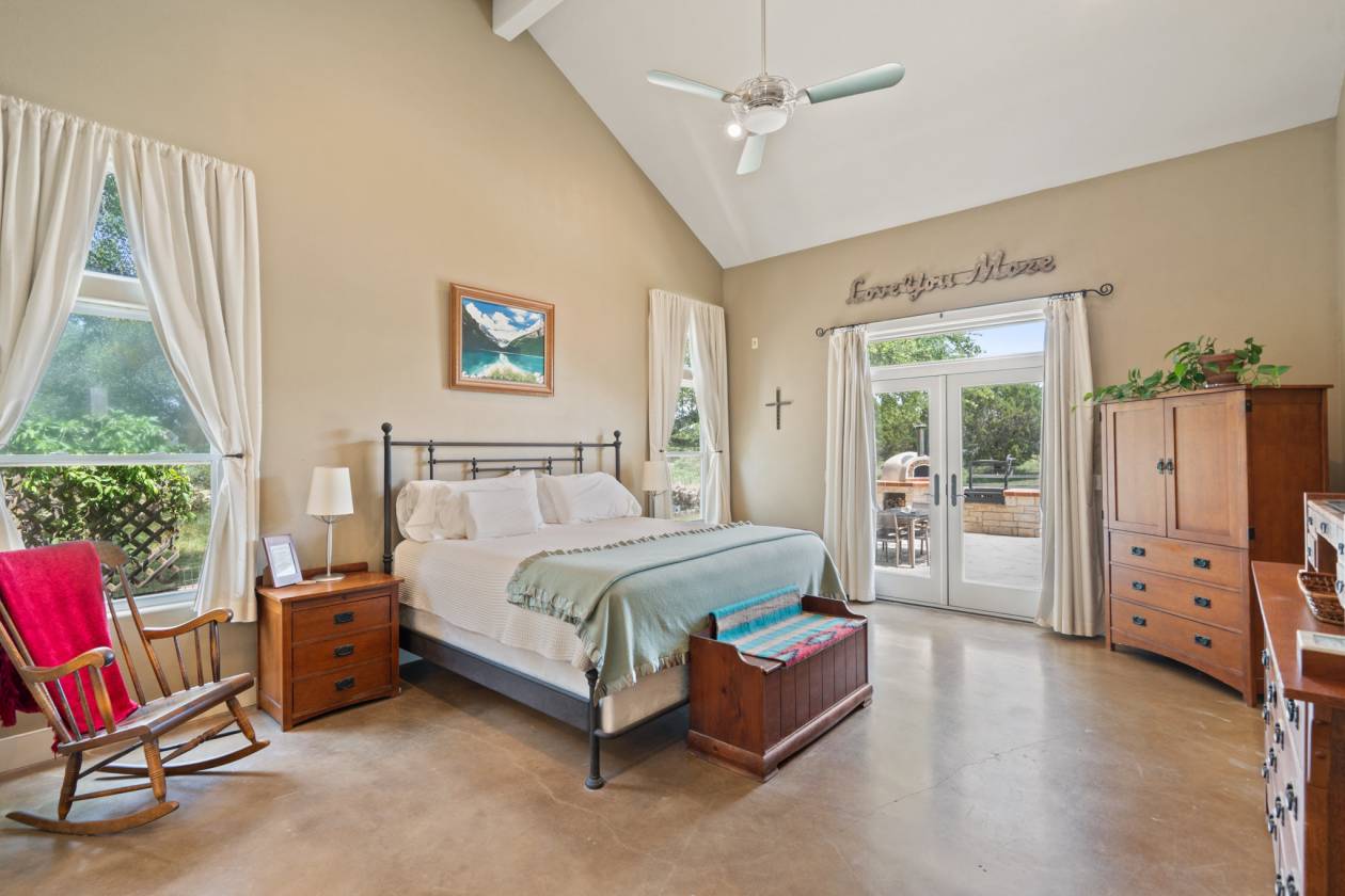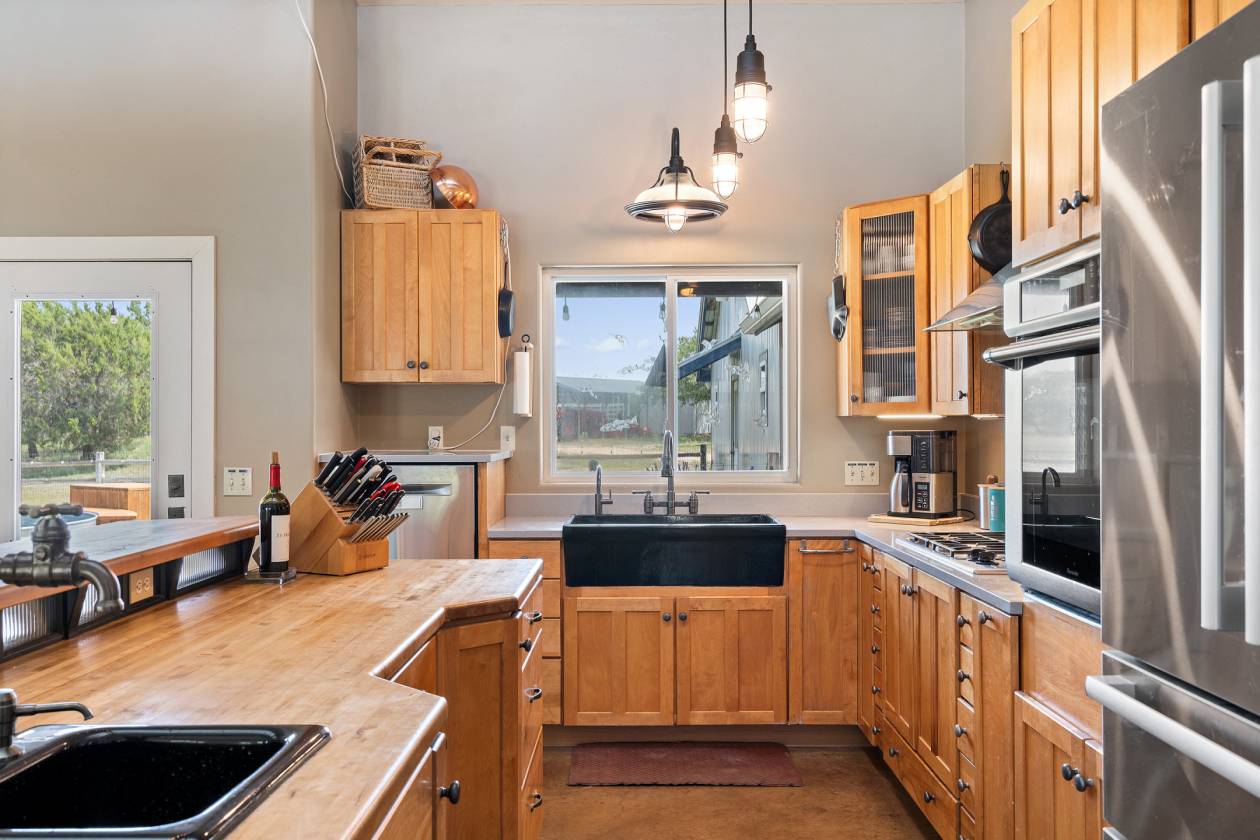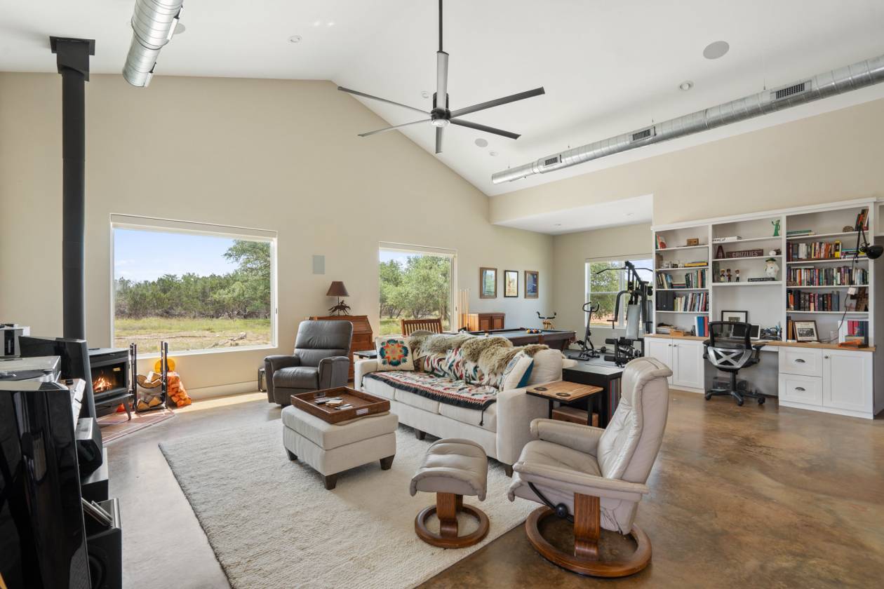 - The 2,700 sq. ft. home features an open-concept layout with tall exposed steel beam ceilings, stained concrete floors, and abundant natural light, creating an inviting Hill Country atmosphere. Glass doors along both sides of the main living area fill the interior with sunlight and connect the living and dining areas to the outdoors. The kitchen includes custom cabinetry, stainless steel appliances, a large island with breakfast bar and prep sink, and a farmhouse sink beneath a window framing a classic Texas view!