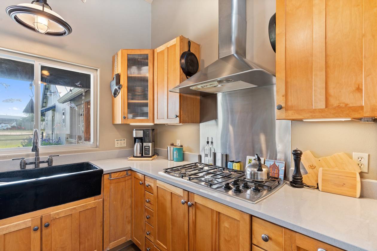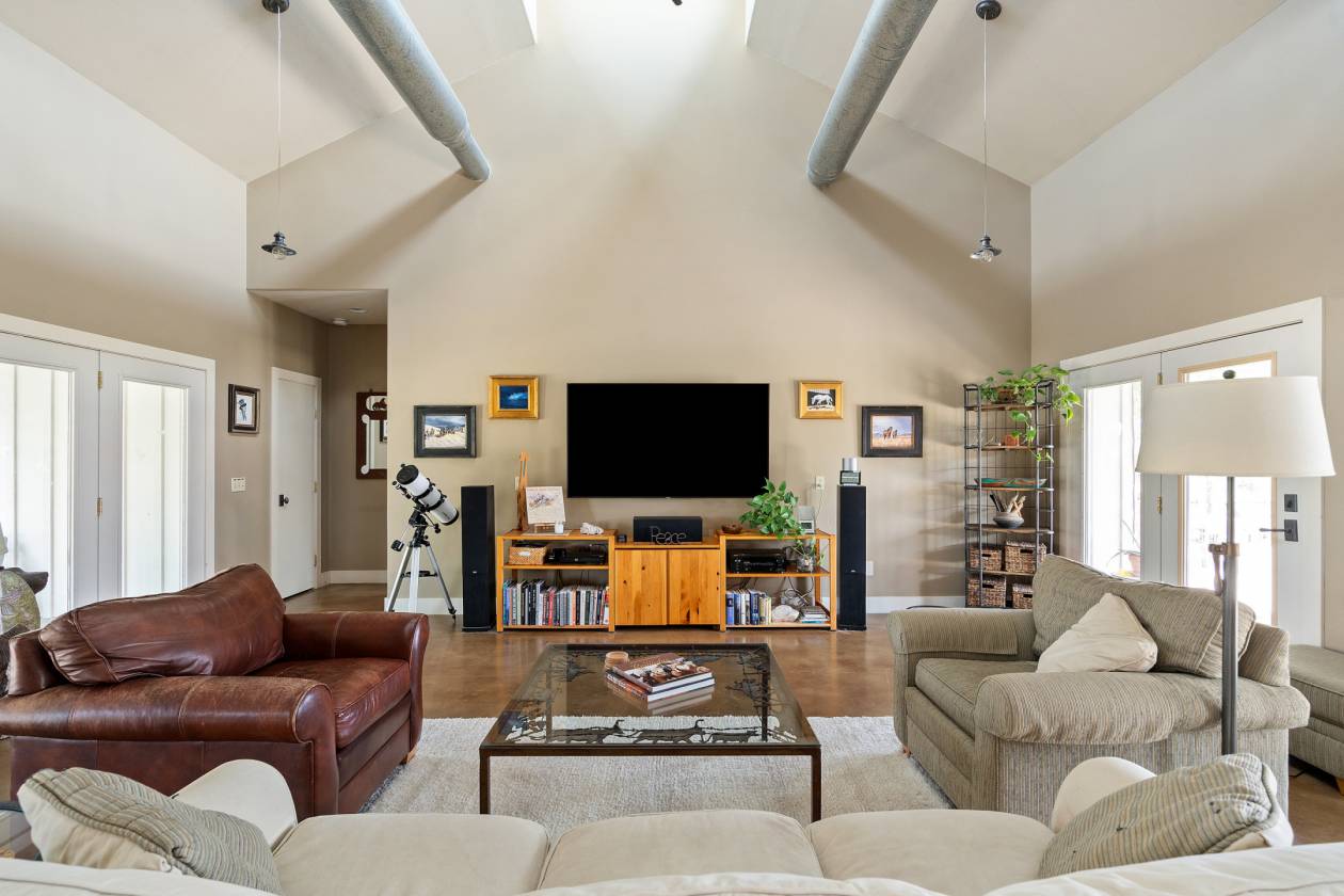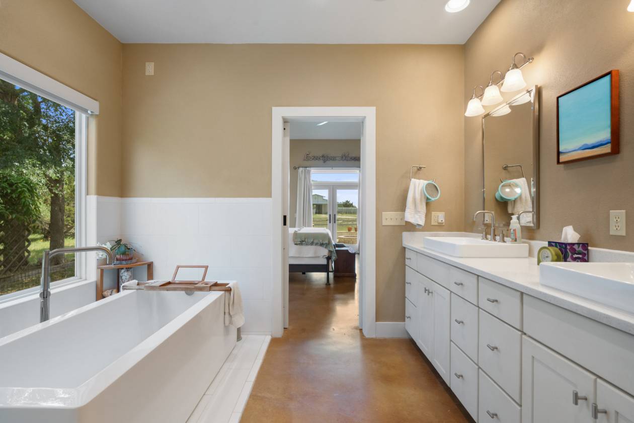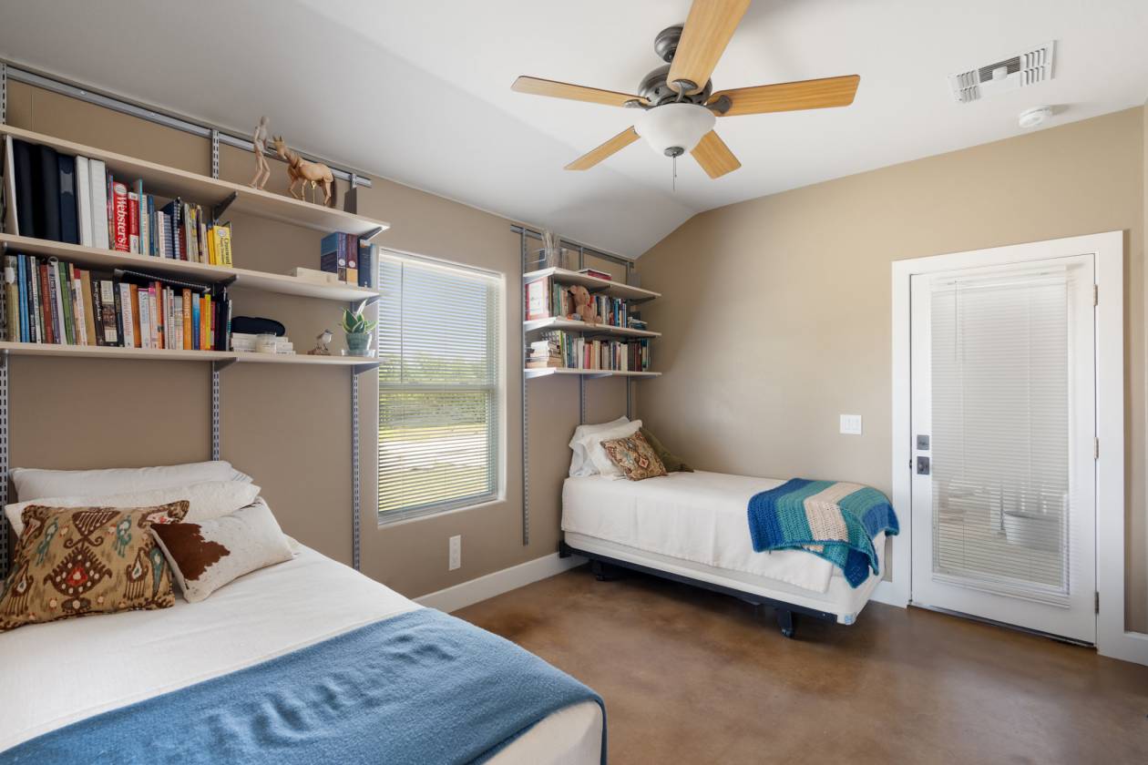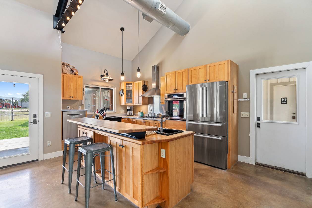 - The 2,700 sq. ft. home features an open-concept layout with tall exposed steel beam ceilings, stained concrete floors, and abundant natural light, creating an inviting Hill Country atmosphere. Glass doors along both sides of the main living area fill the interior with sunlight and connect the living and dining areas to the outdoors. The kitchen includes custom cabinetry, stainless steel appliances, a large island with breakfast bar and prep sink, and a farmhouse sink beneath a window framing a classic Texas view!