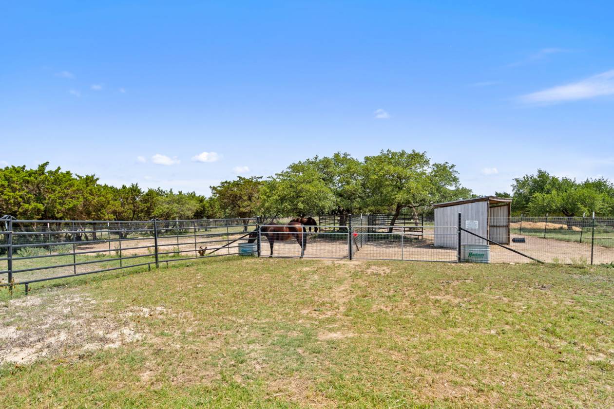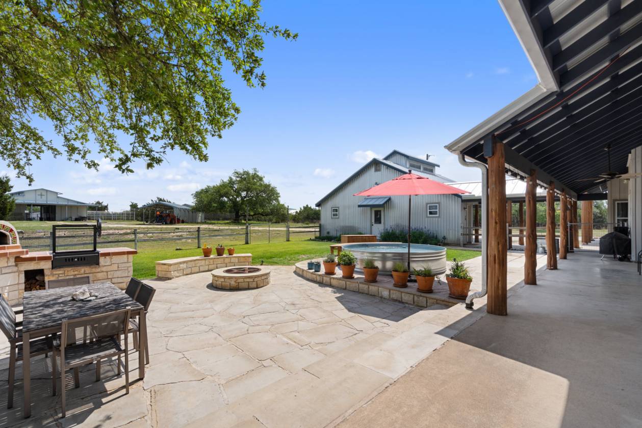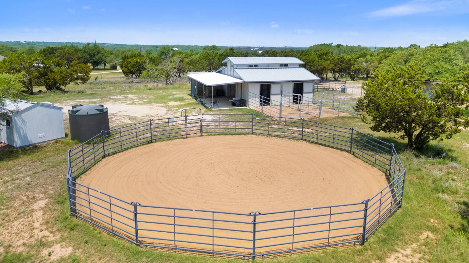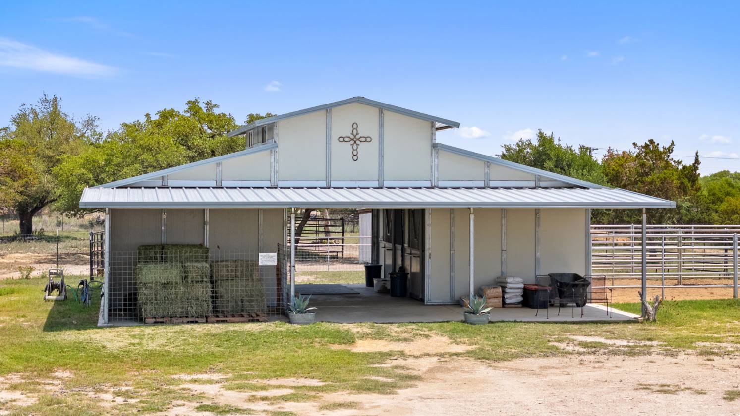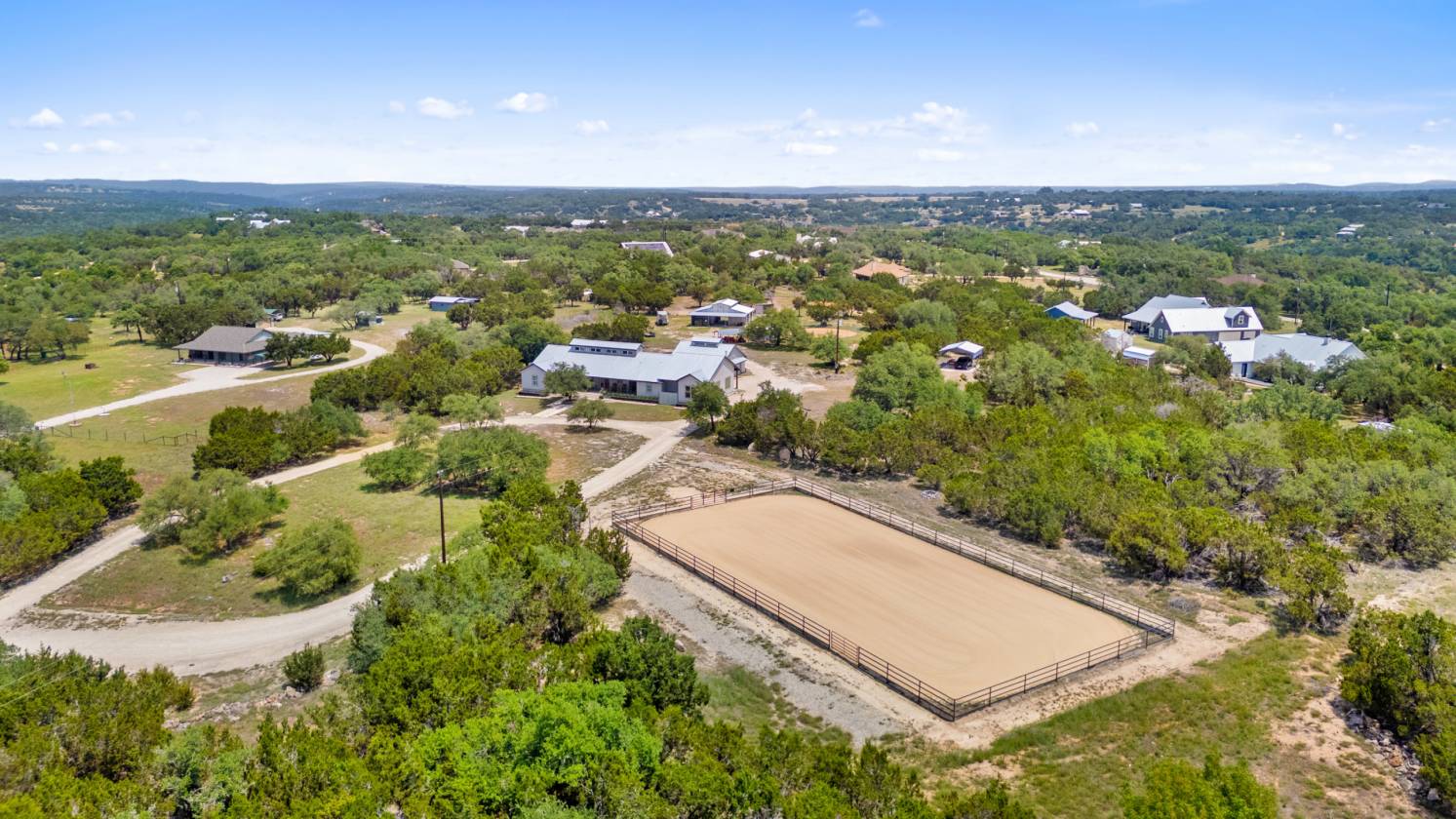 Welcome to 160 Mystic Creek Drive, a 10.42-acre Hill Country property in Dripping Springs that blends relaxed rural living with equestrian amenities-all in one of Texas most desirable regions! The 2,700 sq. ft. home features an open layout with steel beam ceilings, stained concrete floors, and natural light, creating an inviting Hill Country atmosphere. Glass doors on both sides of the main living area flood the interior with sunlight. The kitchen boasts custom cabinetry, stainless steel appliances, a large island with breakfast bar and prep sink, and a farmhouse sink that sits beneath the kitchen window. The primary suite offers a spa-like bath with soaking tub, walk-in shower, dual vanities, and patio access. A breezeway connects the main area to two secondary bedrooms, a full bath with adobe tile flooring, a spacious family room with built-ins and a wood-burning stove, plus an upstairs loft with skylight-ideal for a cozy escape or fun hangout! Outdoors, the home is designed for laid-back living and entertaining. A stone patio shaded by a mature oak anchors a backyard retreat with a 10 Cowboy pool, outdoor kitchen featuring a wood-fired oven and Santa Maria grill, fire pit, and an exterior-access pool bathroom. The front porch offers another peaceful space with views of the oaks and riding arena! Equestrian facilities include an MD Barnmaster RCA barn with 12 aisle, two 12 x 12 stalls with upgraded fronts, 24 runs, Little Giant auto waterers, and interlocking mats. Also included: a 12 x 12 wash rack, enclosed tack room with dual saddle racks, electric water heater, and 5-Head ProTech Fly Spray system. The 12X 36 covered front porch has an exterior wall for hay storage. Additional amenities include a laser-leveled 75 x 150 arena, a 50 round pen with crushed granite, and two no-climb fenced paddocks. Just 15 minutes from Dripping Springs and 45 from Austin or Fredericksburg, this move-in-ready gem is your Hill Country escape!