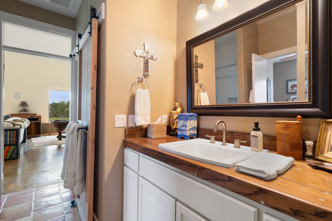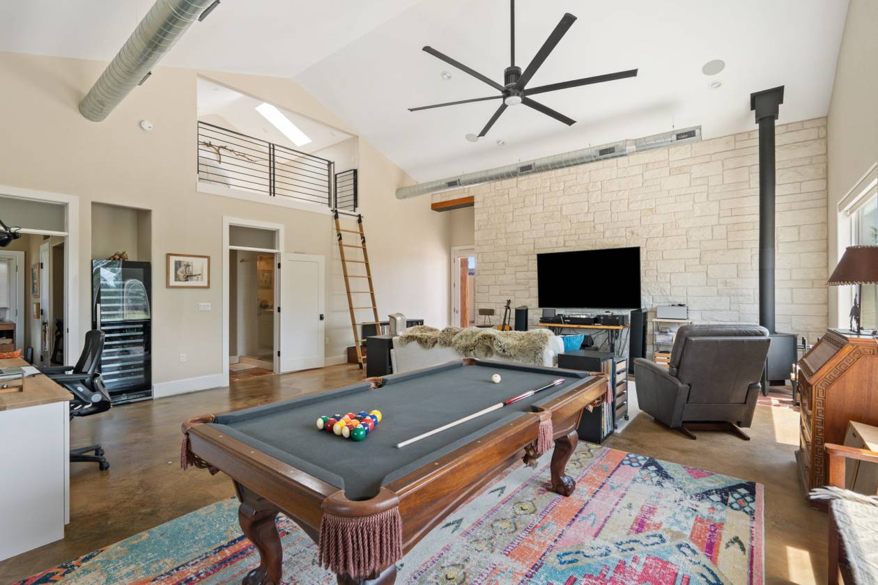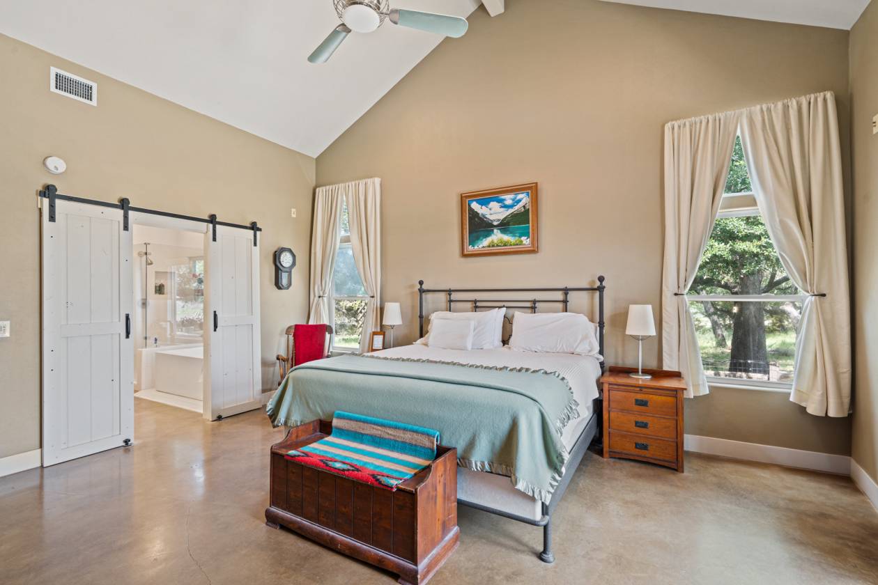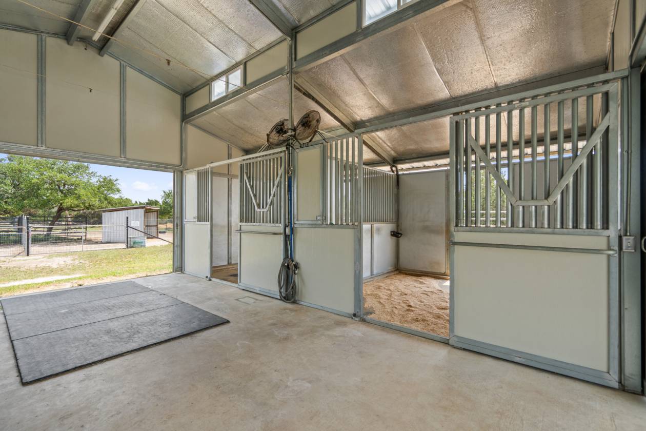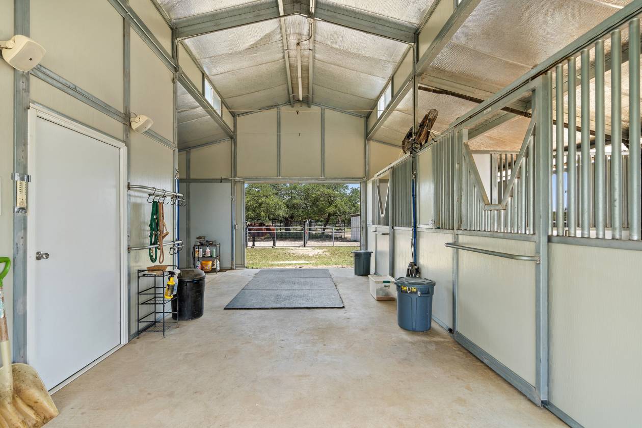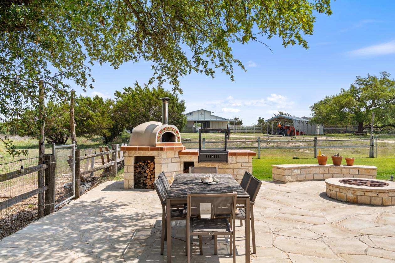 Welcome to 160 Mystic Creek Drive, a 10.42-acre Hill Country property in Dripping Springs that blends relaxed rural living with equestrian amenities-all in one of Texas most desirable regions! The 2,700 sq. ft. home features an open layout with steel beam ceilings, stained concrete floors, and natural light, creating an inviting Hill Country atmosphere. Glass doors on both sides of the main living area flood the interior with sunlight. The kitchen boasts custom cabinetry, stainless steel appliances, a large island with breakfast bar and prep sink, and a farmhouse sink that sits beneath the kitchen window. The primary suite offers a spa-like bath with soaking tub, walk-in shower, dual vanities, and patio access. A breezeway connects the main area to two secondary bedrooms, a full bath with adobe tile flooring, a spacious family room with built-ins and a wood-burning stove, plus an upstairs loft with skylight-ideal for a cozy escape or fun hangout! Outdoors, the home is designed for laid-back living and entertaining. A stone patio shaded by a mature oak anchors a backyard retreat with a 10 Cowboy pool, outdoor kitchen featuring a wood-fired oven and Santa Maria grill, fire pit, and an exterior-access pool bathroom. The front porch offers another peaceful space with views of the oaks and riding arena! Equestrian facilities include an MD Barnmaster RCA barn with 12 aisle, two 12 x 12 stalls with upgraded fronts, 24 runs, Little Giant auto waterers, and interlocking mats. Also included: a 12 x 12 wash rack, enclosed tack room with dual saddle racks, electric water heater, and 5-Head ProTech Fly Spray system. The 12X 36 covered front porch has an exterior wall for hay storage. Additional amenities include a laser-leveled 75 x 150 arena, a 50 round pen with crushed granite, and two no-climb fenced paddocks. Just 15 minutes from Dripping Springs and 45 from Austin or Fredericksburg, this move-in-ready gem is your Hill Country escape!