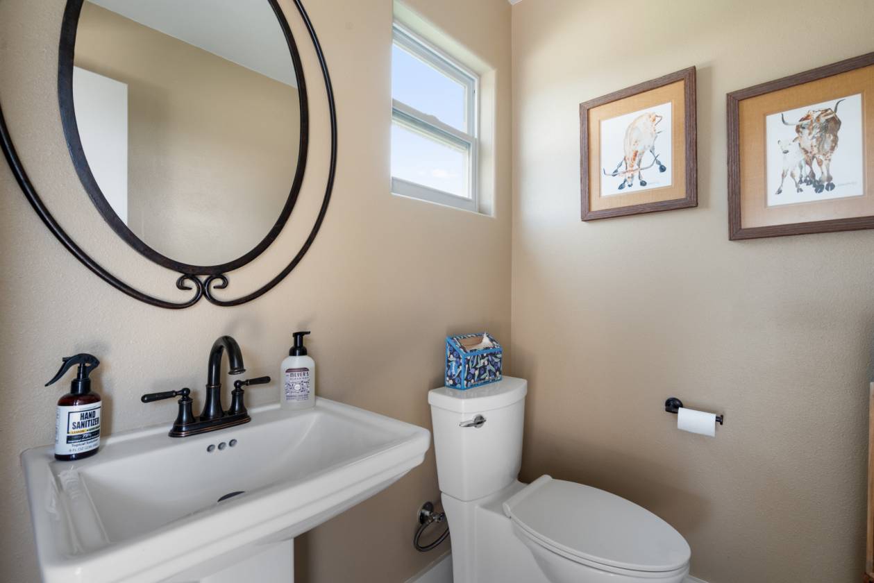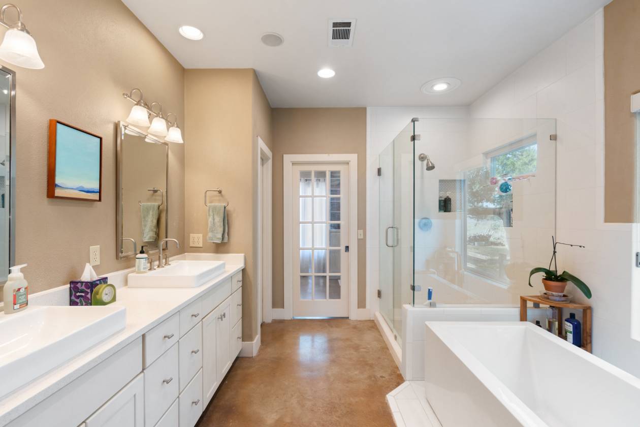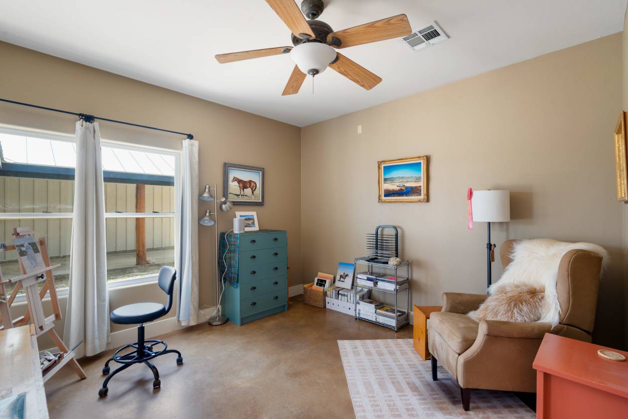 - The primary suite offers a spa-like bath with a soaking tub, walk-in shower, dual vanities, and direct access to the back patio. A breezeway connects the main living area to two secondary bedrooms, a full bath with adobe tile flooring, a spacious family room with built-in cabinetry and desk, wood-burning stove, and an upstairs loft with skylight—ideal for a cozy get-away, fun hangout, or additional storage.