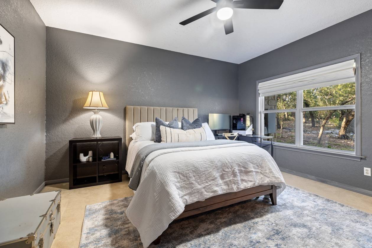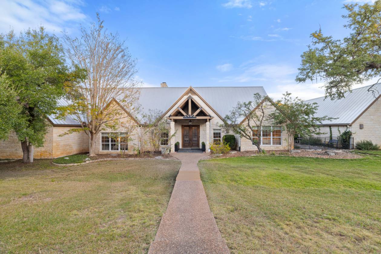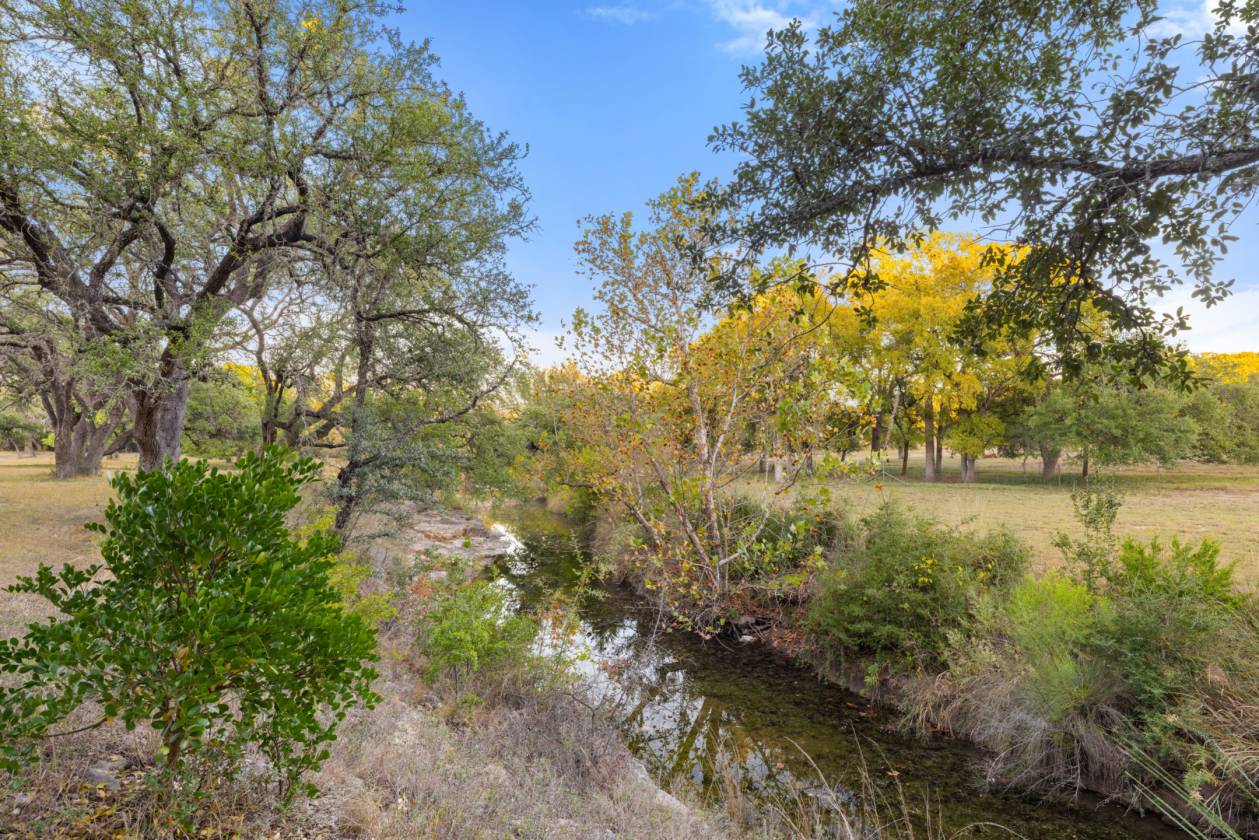 Welcome home to creekside living nestled under majestic oaks in Wimberley Texas. This gated 18 acre ranch home is a true showstopper that you do not want to miss. Built in 1992 with luxurious upgrades over the years mark this property as a rare opportunity. The sprawling 5,656+/-sq.ft. interior offers flexible living spaces that are sure to please. A gallery style foyer welcomes you into the main living anchored by a stone fireplace and huge windows under a breathtaking wood beam cathedral ceiling. The spacious kitchen has granite counters, center island with a raised bar, stainless appliances, large pantry, built-in desk plus a sunny breakfast room. Entertain on a grand scale at the game and media rooms with indoor/outdoor living on the multi-level patios under a huge tree canopy. The media room can easily convert to an in-law suite with its separate entry, walk in closet and plumbed bar. 4 of the 5 bedrooms have en-suite baths plus ample closet space. The primary even has its own wing offering a sitting room/study, large bedroom plus a gorgeous bathroom with soaking tub, separate shower + a big walk in closet. Storage is everywhere including the oversized 3 car garage and 10 x 16 barn for lawn equipment plus there is a covered area for a tractor/RV. Stocked wet weather creek w/blue gill, catfish & pass + 5 foot deep swimming hole & you can kayak most of the time. Take the pedestrian bridge over to the raised garden w/wildlife fence & fully irrigated, horse corral, barn with stalls and tack room. The whole property has lots of wildlife & interesting elevation changes with trails to explore. Secondary building site on top of hill with utility pole installed. Utility info: 3 HVAC units, 2 water heaters(1 electric, 1 commercial tankless), well services garden & coral, public water to residence, septic system. Come enjoy downtown Wimberley just 10 minutes away. It’s all here waiting for you to call it “Home.”