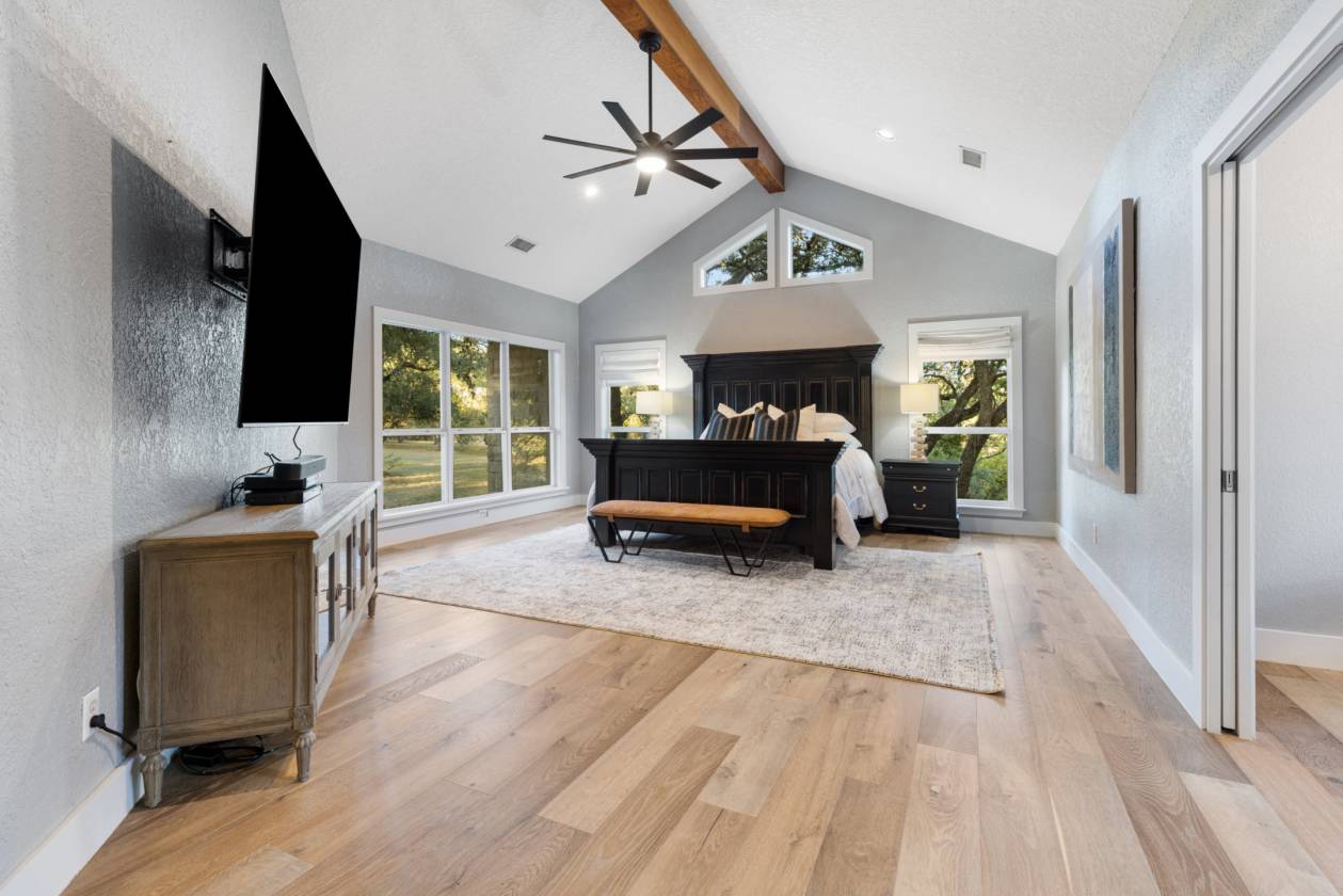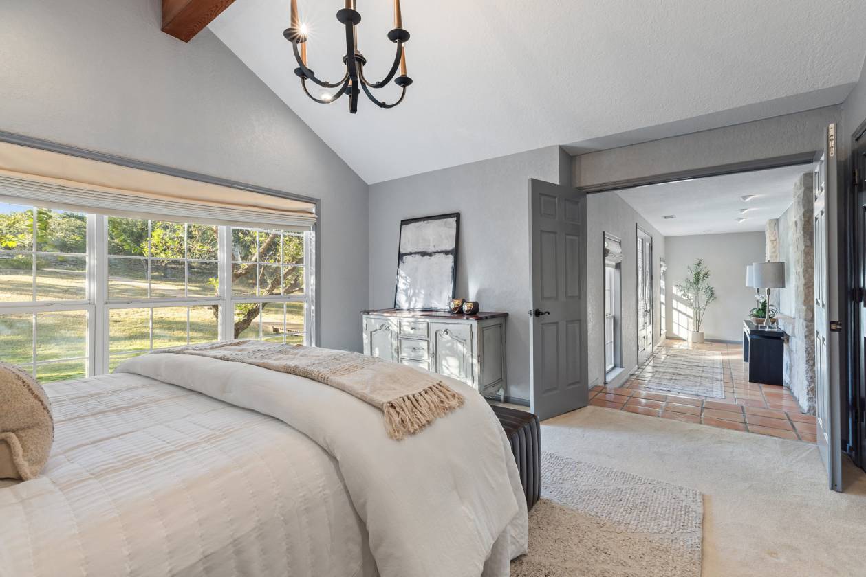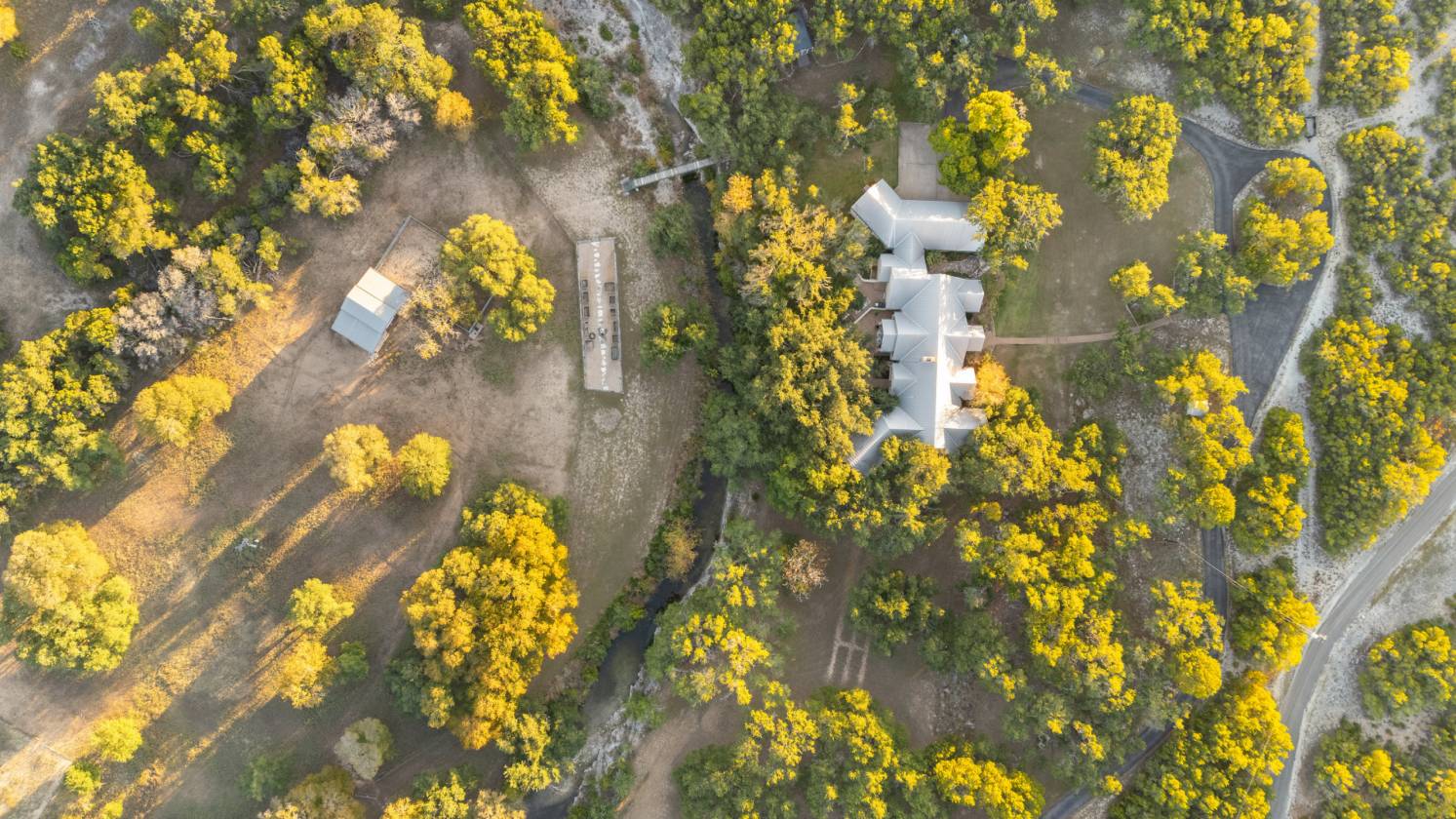 Welcome home to creekside living nestled under majestic oaks in Wimberley Texas. This gated 18 acre ranch home is a true showstopper that you do not want to miss. Built in 1992 with luxurious upgrades over the years mark this property as a rare opportunity. The sprawling 5,656+/-sq.ft. interior offers flexible living spaces that are sure to please. A gallery style foyer welcomes you into the main living anchored by a stone fireplace and huge windows under a breathtaking wood beam cathedral ceiling. The spacious kitchen has granite counters, center island with a raised bar, stainless appliances, large pantry, built-in desk plus a sunny breakfast room. Entertain on a grand scale at the game and media rooms with indoor/outdoor living on the multi-level patios under a huge tree canopy. The media room can easily convert to an in-law suite with its separate entry, walk in closet and plumbed bar. 4 of the 5 bedrooms have en-suite baths plus ample closet space. The primary even has its own wing offering a sitting room/study, large bedroom plus a gorgeous bathroom with soaking tub, separate shower + a big walk in closet. Storage is everywhere including the oversized 3 car garage and 10 x 16 barn for lawn equipment plus there is a covered area for a tractor/RV. Stocked wet weather creek w/blue gill, catfish & pass + 5 foot deep swimming hole & you can kayak most of the time. Take the pedestrian bridge over to the raised garden w/wildlife fence & fully irrigated, horse corral, barn with stalls and tack room. The whole property has lots of wildlife & interesting elevation changes with trails to explore. Secondary building site on top of hill with utility pole installed. Utility info: 3 HVAC units, 2 water heaters(1 electric, 1 commercial tankless), well services garden & coral, public water to residence, septic system. Come enjoy downtown Wimberley just 10 minutes away. It’s all here waiting for you to call it “Home.”