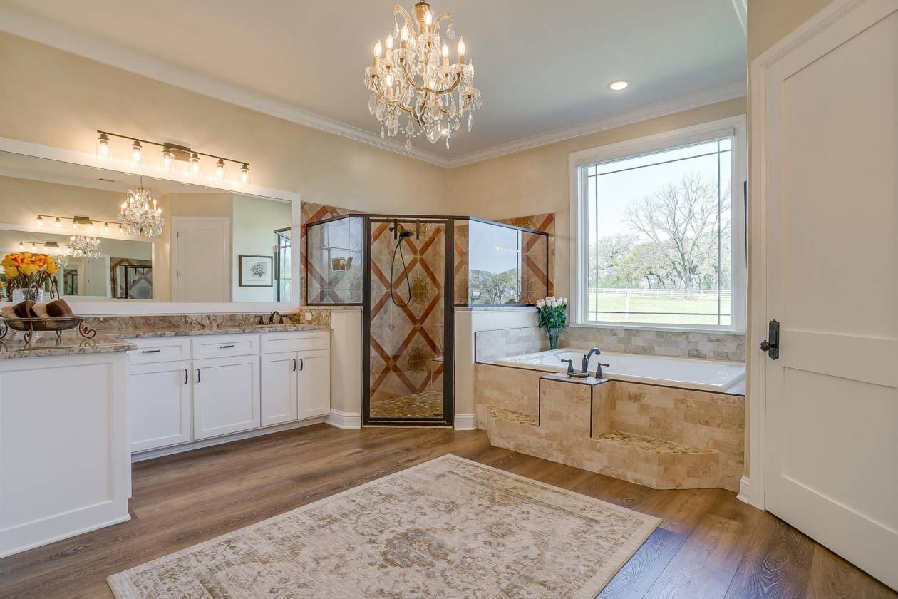 - Primary bath features a jacuzzi tub and large stand-up shower with 2 shower heads, separate vanities, chandelier, combination open closet for valuables