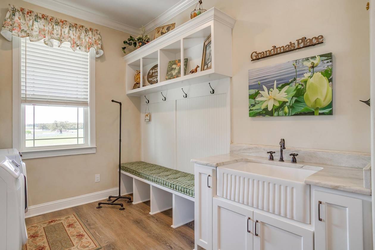 - Open mudroom with built in bench and sink, under counter washer and dryer