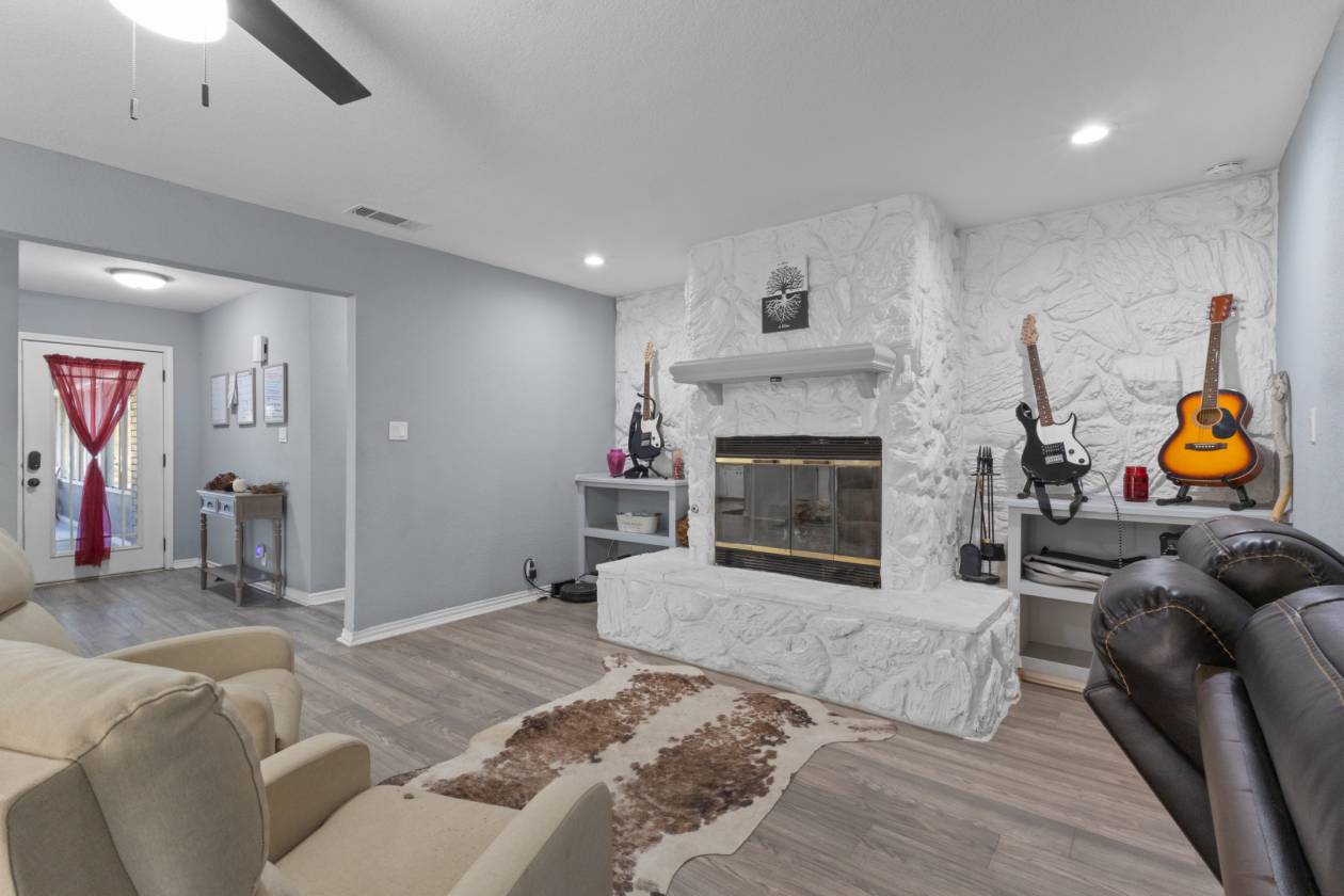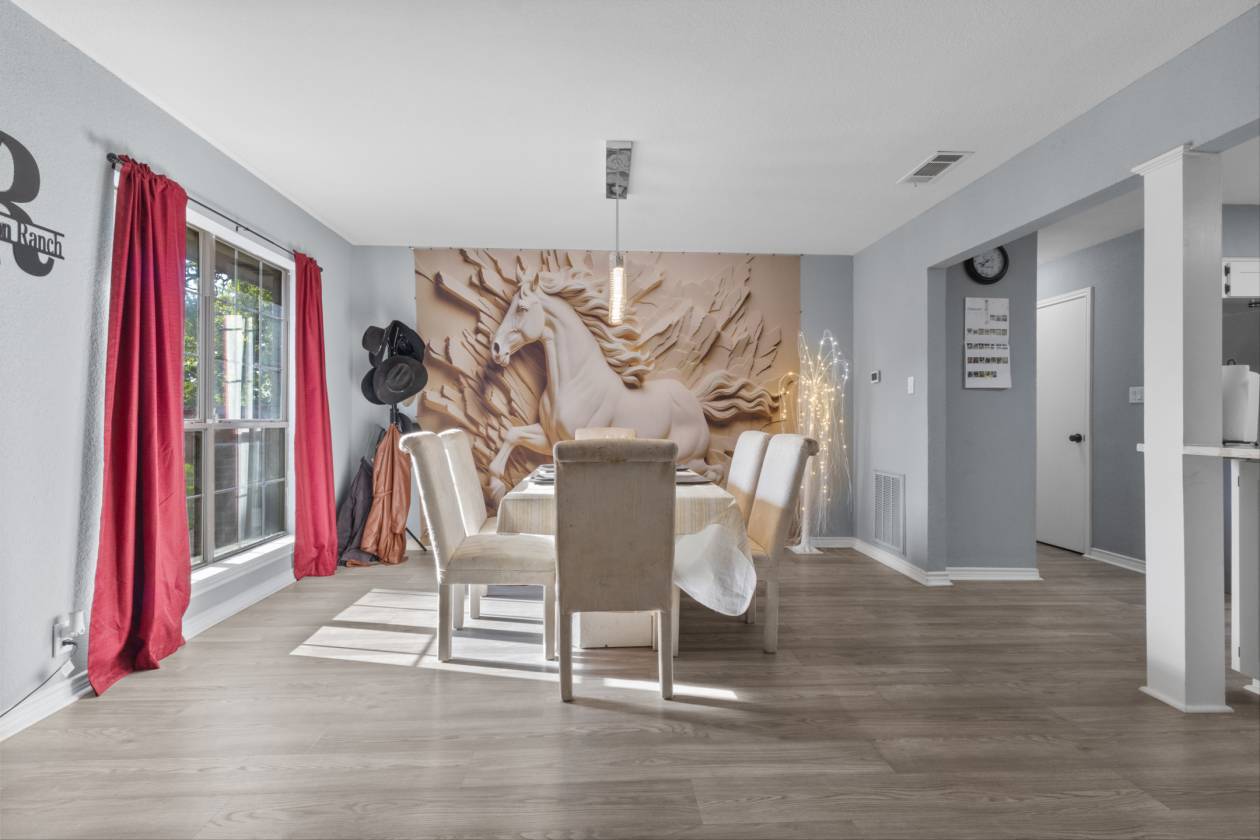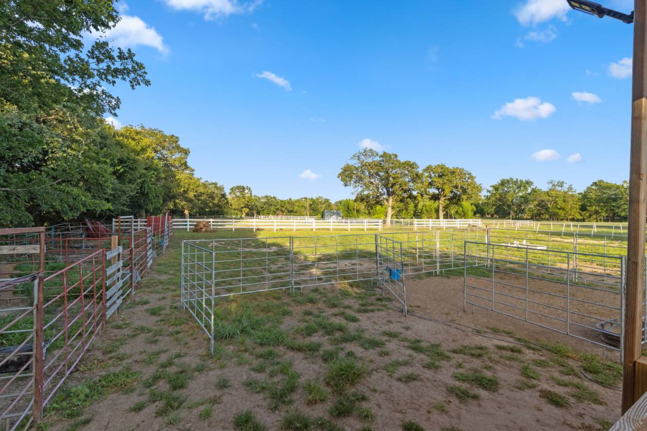• Step outside to discover everything a horse enthusiast dreams of: round pens, a stud area with 20x20 stalls, wash racks, a loafing shed, working cattle chutes, and reseeded front pastures for optimal grazing. The back section of the property includes riding trails nestled among gorgeous Texas timber that opens into expansive grazing areas for cattle or horses. There’s also a small fishing pond and plenty of open space for recreational activities. Functionality extends to the property’s infrastructure, featuring a fully fenced layout, a large workshop with a bathroom, and additional space for future storage or expansion
