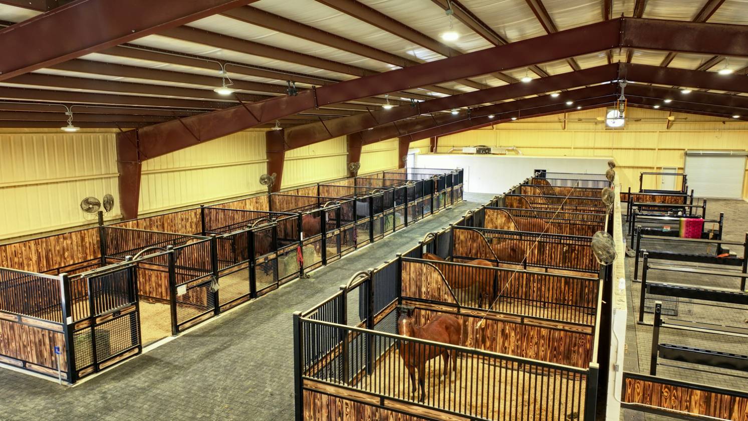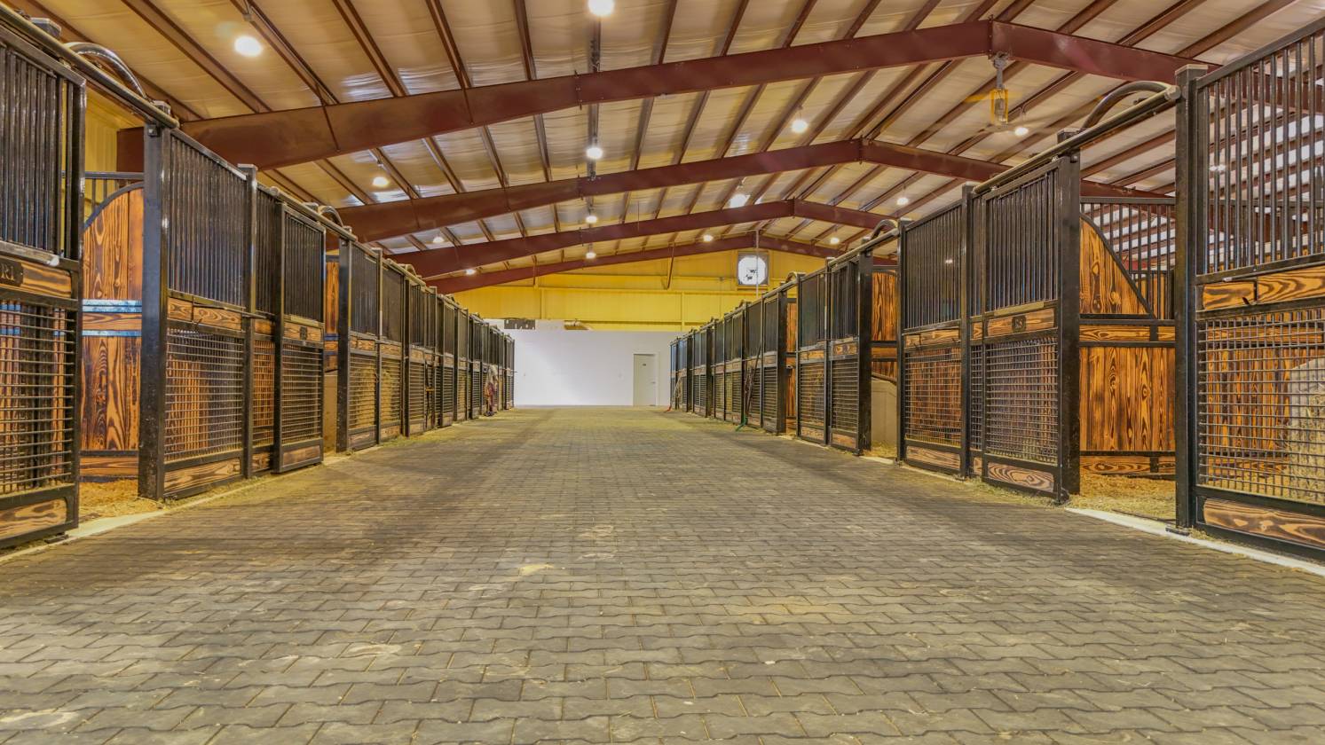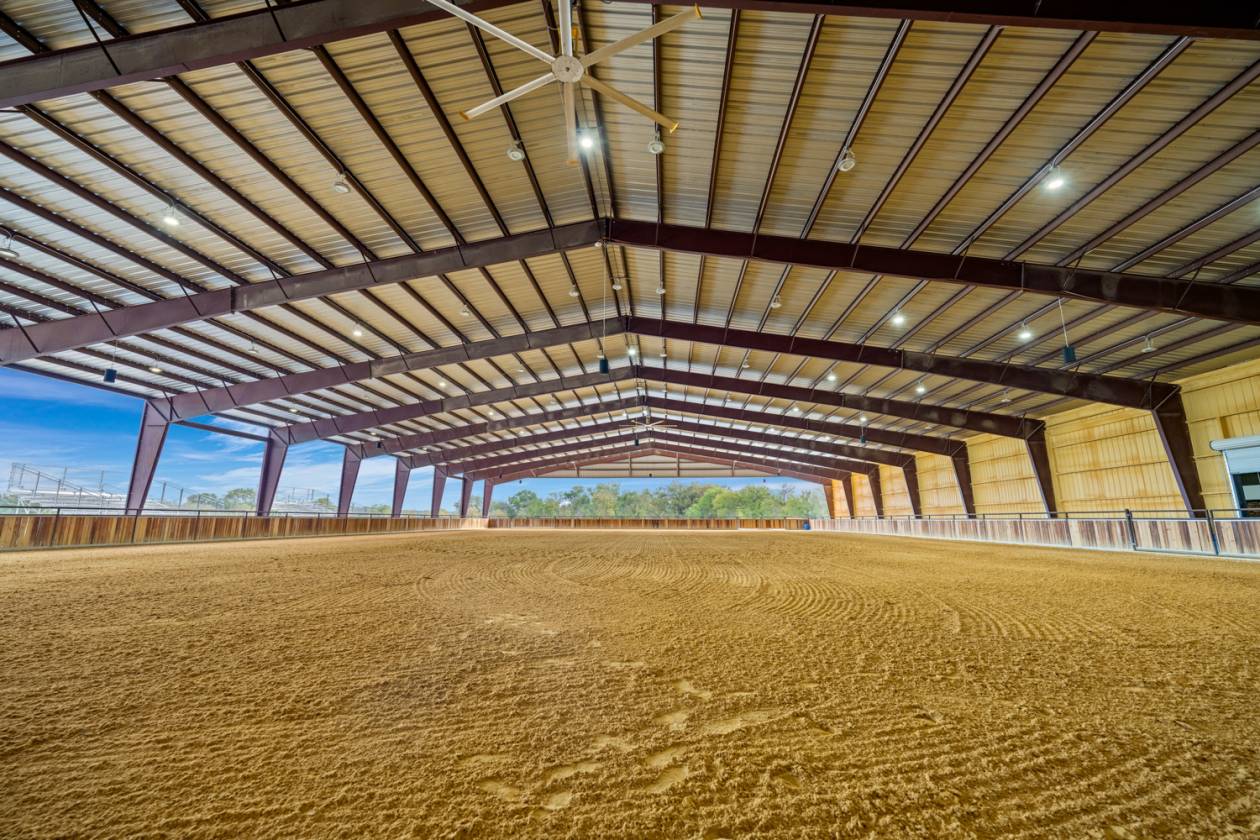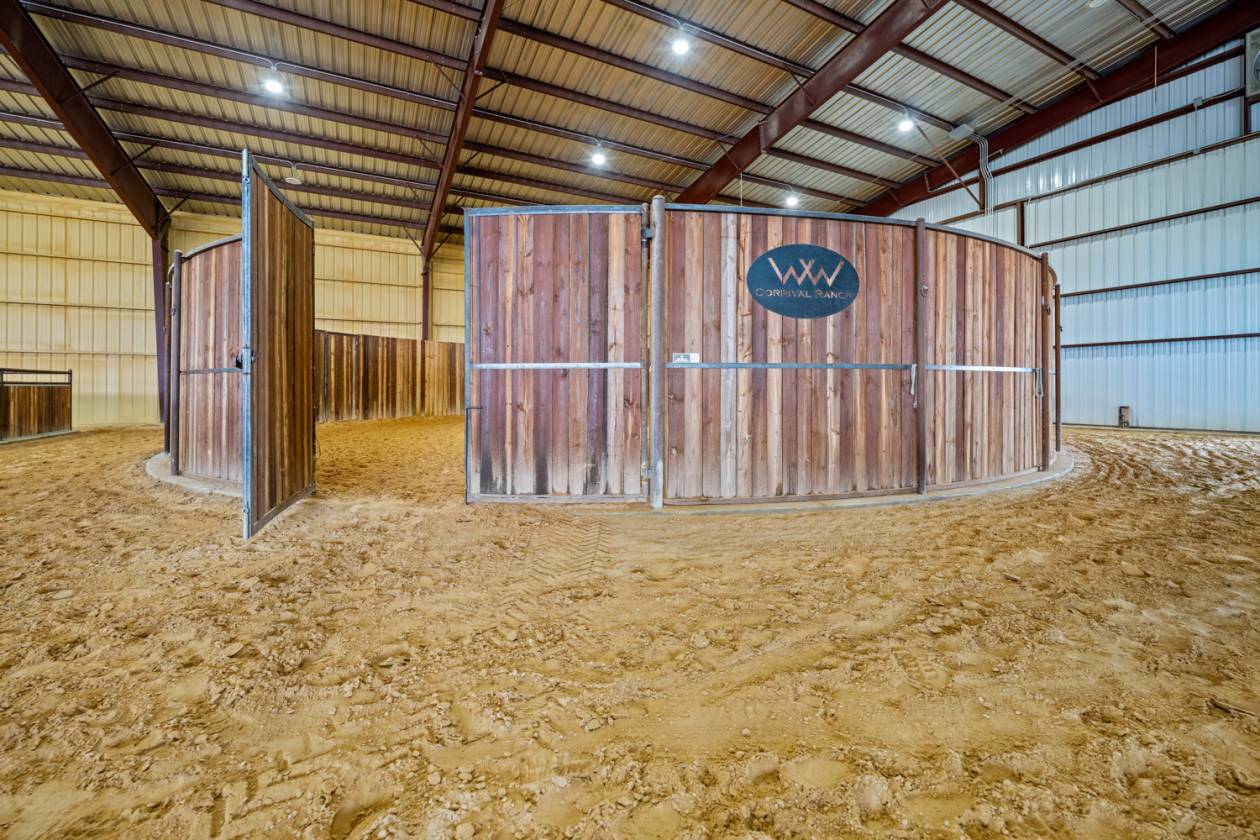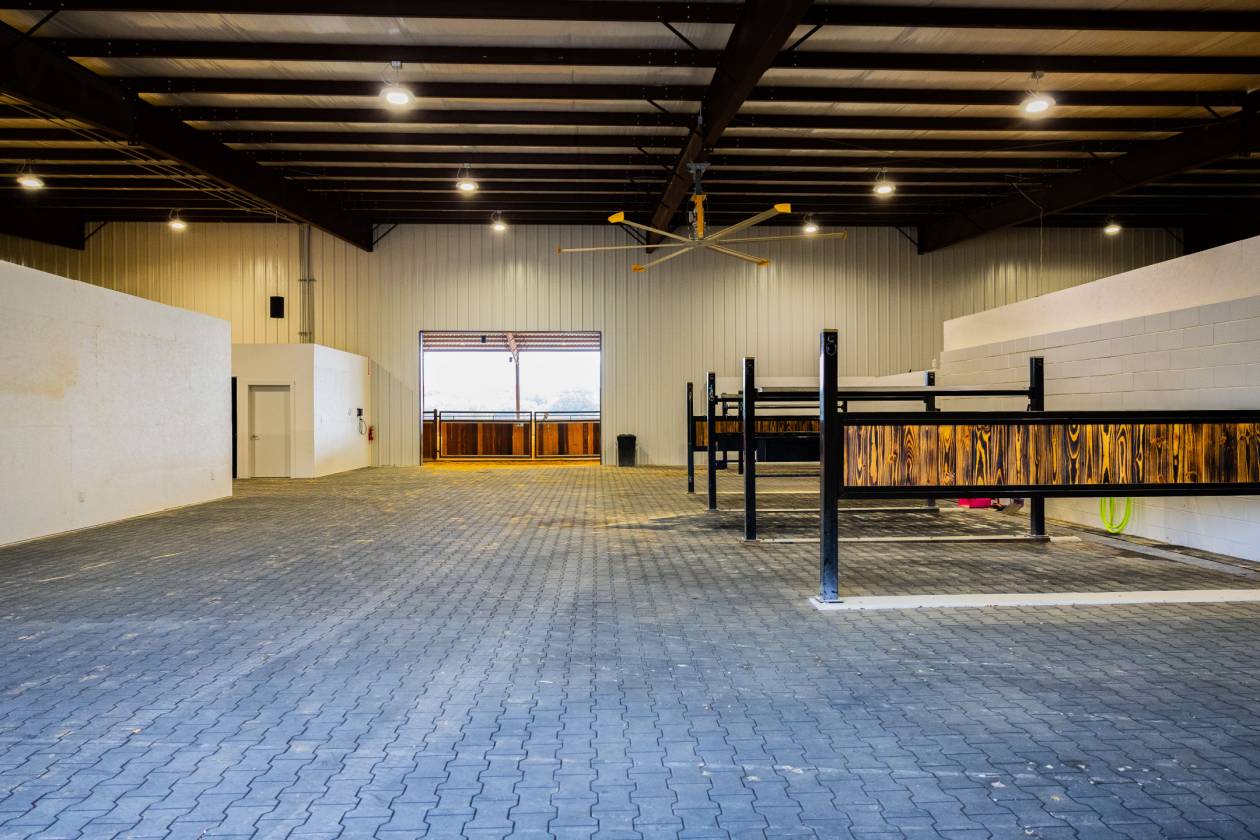 - Beginning in 2021, three large facilities were added to the property, adding to the pre-existing 22 – 12’ x 12’ stalls, 60’ round pen and eurosizer, in order to create this one-of-a-kind equestrian center. The new facilities include a 14-stall rehab and conditioning barn with a veterinary office and a full surgical suite. This barn houses all of the therapy equipment including an AquaPacer, hot and cold saltwater spa, and theraplate. All of the stalls in the new facilities are 14’ x 14’ with StableComfort mattresses to offer ultimate care and comfort for the horses boarded within. In addition, there is a 46-stall boarding barn with an attached 135’ x 225’ covered arena, a 7-horse Priefert panel walker and an 80-foot round pen. Both of the new stable barns incorporate 1 ¾” rubber pavers in the aisles offering a quiet, peaceful barn. Finally, there is a 15-stall breeding barn with three stallion stalls which houses all facilities a breeder needs on-site, including an AI lab. Overall, 97 horses can be stabled indoors within the over 100,000 sq/ft of barn space.