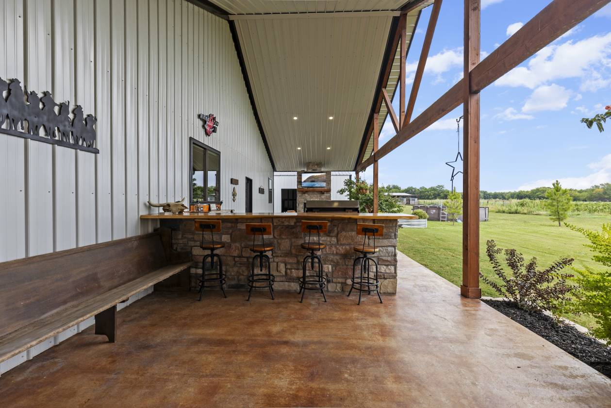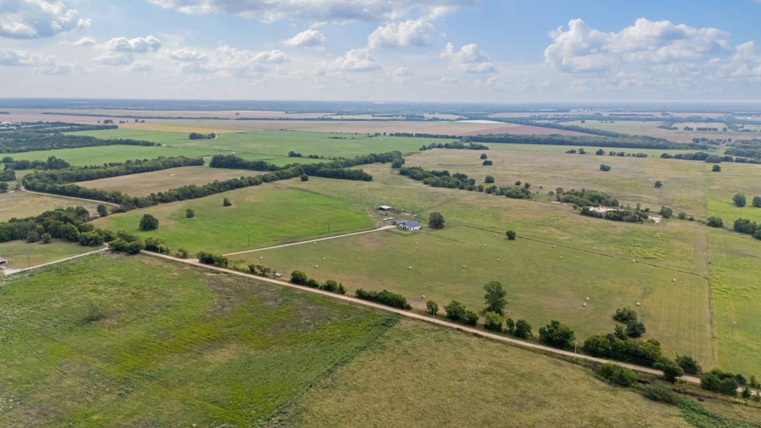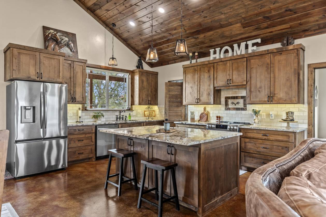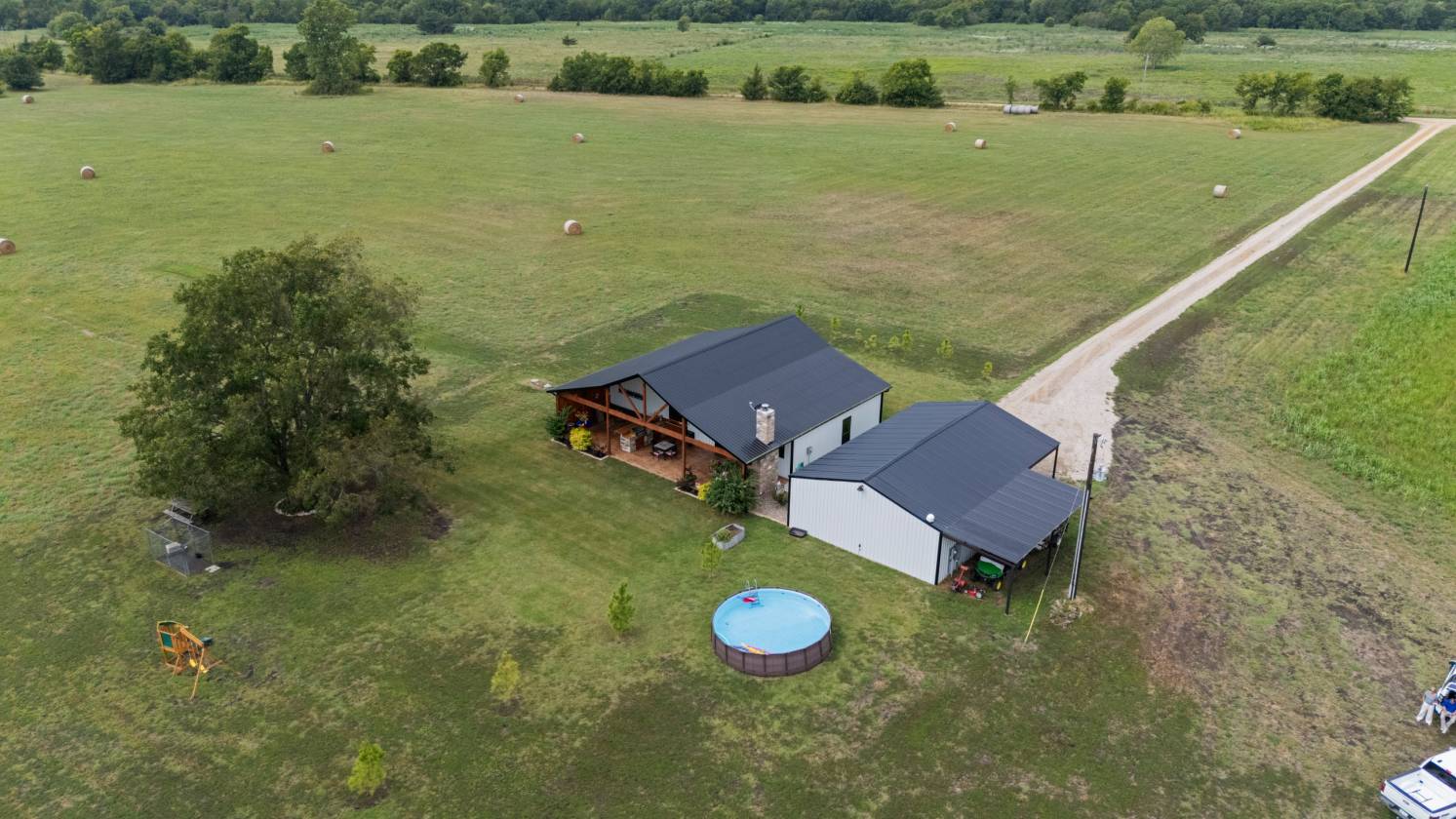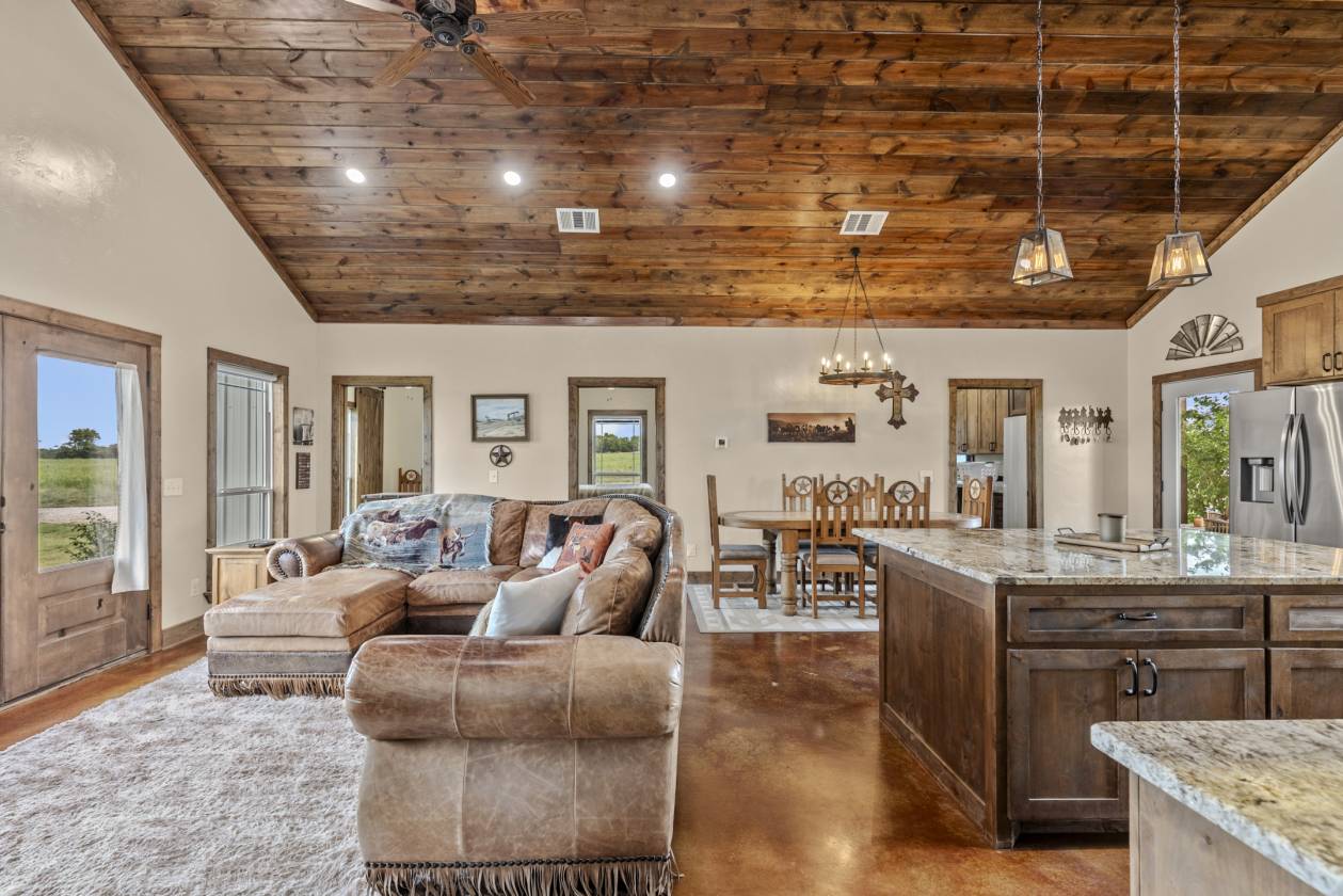 Looking for seclusion, this is it! 120.35 acres with 1,520 sq ft custom built home featuring 2 bedrooms, an office could be 3rd bedroom, 2 baths. The abundance of natural light enhances the beauty of the wood ceiling in the open floor plan. The custom wood cabinets with granite countertops and large walk-in pantry make this kitchen a delight for the cook. The primary bedroom has large a walk-in closet, sliding barn door type window covers. You'll love the dual sinks and tiled shower in the primary bath. The outdoor kitchen with wood burning fireplace and serving window to interior kitchen is the perfect relaxation spot. 30 x 45 detached garage with covered carport. The acreage is good hay producing property. You need to see this one!